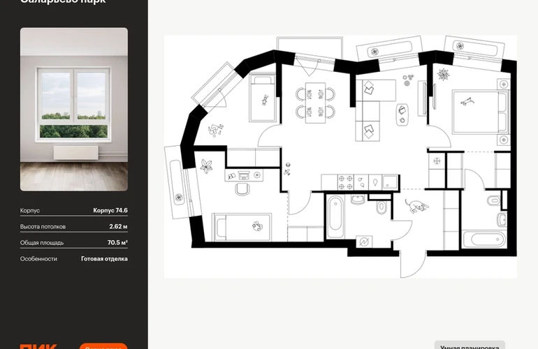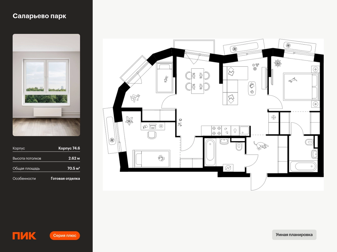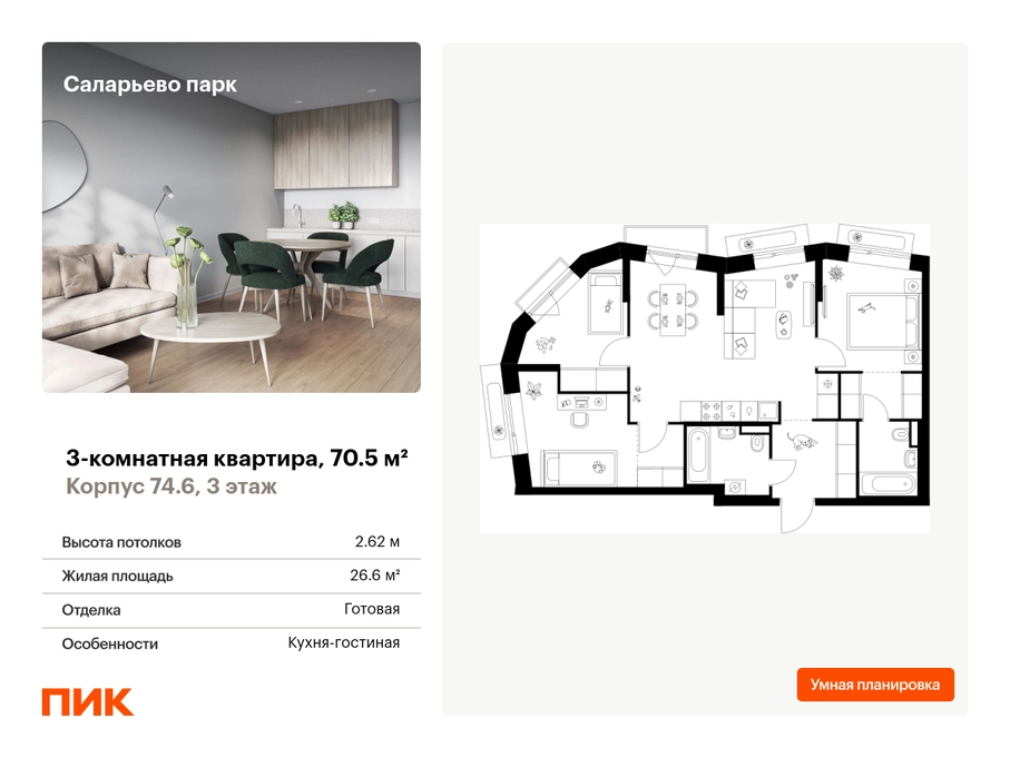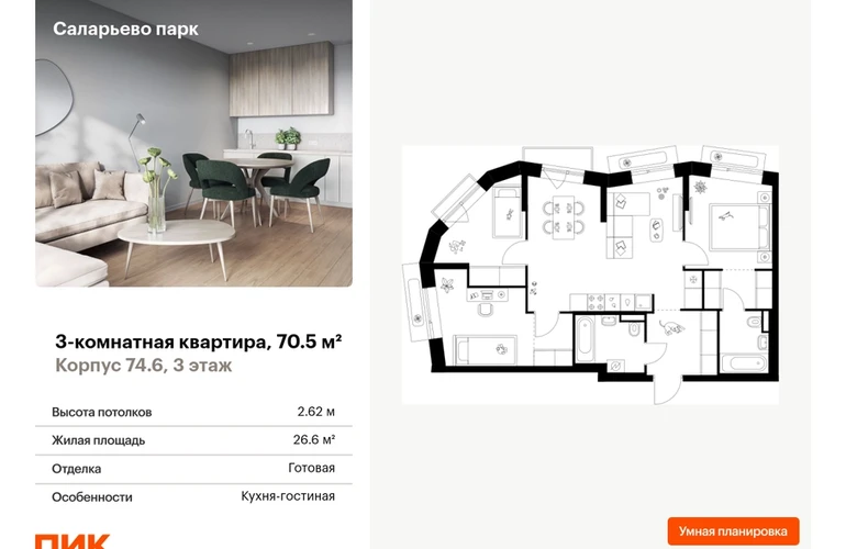 Продаётся 3-комн.квартира площадью 70.50 кв.м на 3 этаже 18 этажного дома (Корпус 74.6, секция 6) проекта ПИК Саларьево парк. Светлый просторный подъезд на уровне земли, функциональная планировка, большие окна, с отделкой. Жилой район «Саларьево парк» расположен в Новой Москве, в четырёх километрах от МКАД по Киевскому шоссе. Две станции метро: «Саларьево» и «Филатов луг» — находятся в пешей доступности от проекта. Дойти до них можно за 5–10 минут. В квартале уже создана качественная среда, где есть абсолютно всё для полноценной жизни, работы и отдыха. «Саларьево парк» — не просто квартал, а полноценный жилой район, который отличается разноплановой архитектурой. Над концепцией квартала работали несколько ведущих архитектурных бюро, которые стремились добиться разнообразия в фасадных решениях. Ярким примером такого подхода станет корпус 83, который относится к «Серии плюс». Новый корпус 83 был создан по принципам южной архитектуры: расслабленный и лаконичный силуэт зданий, привлекающий к себе внимание. Архитектурная изюминка 83-го корпуса — террасы и фигурные балконы. Вместе с окнами и другими акцентными элементами они создают уникальный облик здания, отсылая нас к изысканной южной архитектуре. Все корпуса в квартале гармонично сочетаются, образуя единую городскую среду. Здесь приятно гулять и проводить время на улице всей семьёй. В «Саларьево парке» создана уникальная образовательная среда, включающая в себя шесть школ, рассчитанных на 6 250 учеников. Две из них уже открыты, их посещает 2 300 детей. Также на территории «Саларьево парка» находится 12 детских садов, один из которых с бассейном. Сейчас уже открыты 7 садов. В «Саларьево парке» открыта уникальная игровая площадка — PlayHub «Оригами». Здесь есть ручей, горка-труба и рельефные холмы. Взрослые смогут отдохнуть в уютном кафе, пока дети играют. Также на территории проекта есть SportHub — большая спортивная зона, разделённая по интересам и возрастам. Здесь можно заниматься разными видами спорта: футболом, баскетболом, волейболом и стритболом. Зимой центральную часть площадки превращают в каток. Во дворах-парках жилого квартала есть места для отдыха, детские и спортивные площадки. На первых этажах домов расположены магазины, кафе и полезные сервисы. Также вблизи проекта есть несколько масштабных торговых центров. До ТЦ «Саларис» пять минут пешком, до «Рио», Metro Cash & Carry и «Лемана про» — пять минут на автомобиле. Артикул - 1006780О застройщике
