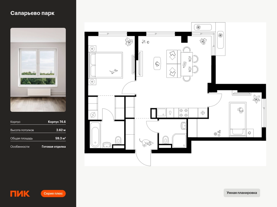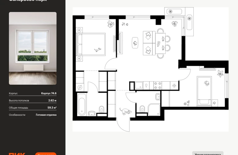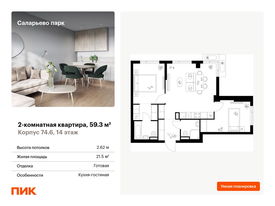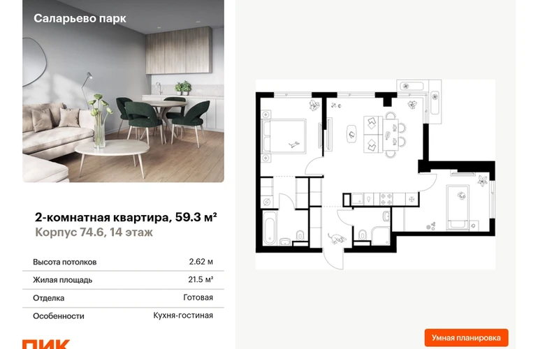 Продаётся 2-комн.квартира площадью 59.30 кв.м на 14 этаже 18 этажного дома (Корпус 74.6, секция 6) проекта ПИК Саларьево парк. Светлый просторный подъезд на уровне земли, функциональная планировка, большие окна, с отделкой. Жилой район «Саларьево парк» расположен в Новой Москве, в четырёх километрах от МКАД по Киевскому шоссе. Две станции метро: «Саларьево» и «Филатов луг» — находятся в пешей доступности от проекта. Дойти до них можно за 5–10 минут. В квартале уже создана качественная среда, где есть абсолютно всё для полноценной жизни, работы и отдыха. «Саларьево парк» — не просто квартал, а полноценный жилой район, который отличается разноплановой архитектурой. Над концепцией квартала работали несколько ведущих архитектурных бюро, которые стремились добиться разнообразия в фасадных решениях. Ярким примером такого подхода станет корпус 83, который относится к «Серии плюс». Новый корпус 83 был создан по принципам южной архитектуры: расслабленный и лаконичный силуэт зданий, привлекающий к себе внимание. Архитектурная изюминка 83-го корпуса — террасы и фигурные балконы. Вместе с окнами и другими акцентными элементами они создают уникальный облик здания, отсылая нас к изысканной южной архитектуре. Все корпуса в квартале гармонично сочетаются, образуя единую городскую среду. Здесь приятно гулять и проводить время на улице всей семьёй. В «Саларьево парке» создана уникальная образовательная среда, включающая в себя шесть школ, рассчитанных на 6 250 учеников. Две из них уже открыты, их посещает 2 300 детей. Также на территории «Саларьево парка» находится 12 детских садов, один из которых с бассейном. Сейчас уже открыты 7 садов. В «Саларьево парке» открыта уникальная игровая площадка — PlayHub «Оригами». Здесь есть ручей, горка-труба и рельефные холмы. Взрослые смогут отдохнуть в уютном кафе, пока дети играют. Также на территории проекта есть SportHub — большая спортивная зона, разделённая по интересам и возрастам. Здесь можно заниматься разными видами спорта: футболом, баскетболом, волейболом и стритболом. Зимой центральную часть площадки превращают в каток. Во дворах-парках жилого квартала есть места для отдыха, детские и спортивные площадки. На первых этажах домов расположены магазины, кафе и полезные сервисы. Также вблизи проекта есть несколько масштабных торговых центров. До ТЦ «Саларис» пять минут пешком, до «Рио», Metro Cash & Carry и «Лемана про» — пять минут на автомобиле. Артикул - 1006924О застройщике