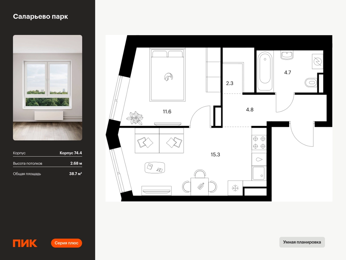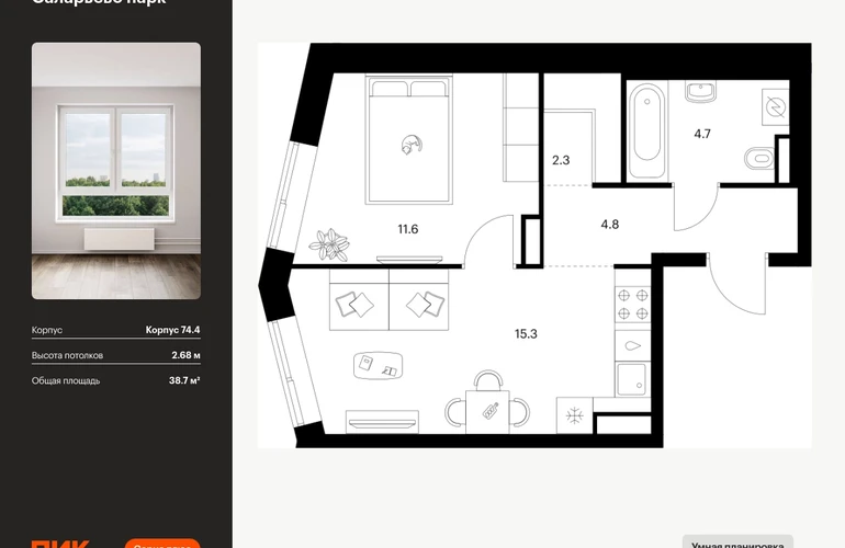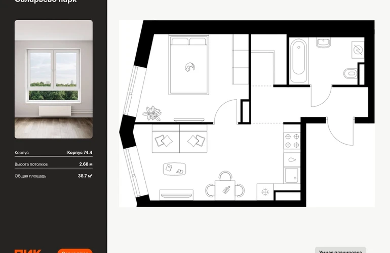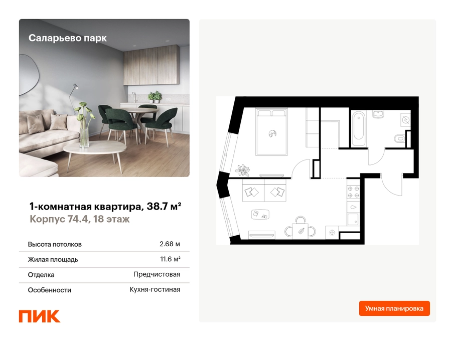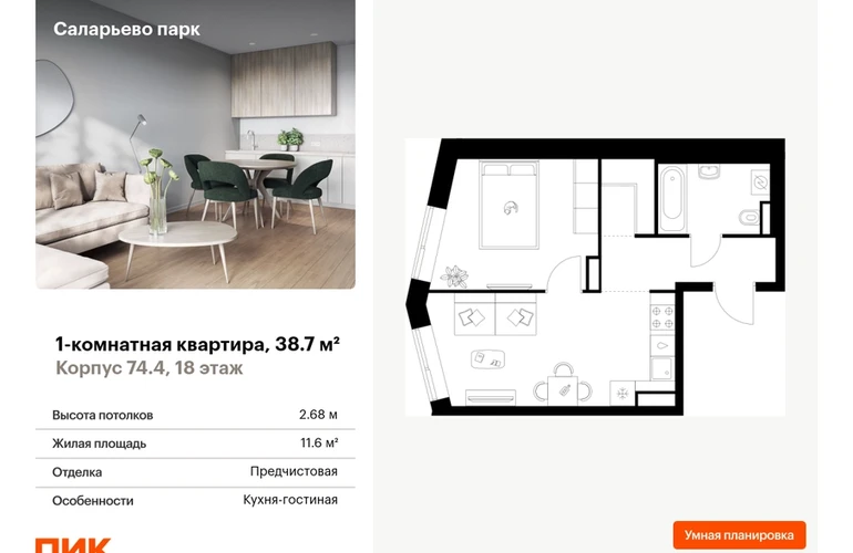 Продаётся 1-комн.квартира площадью 38.70 кв.м на 18 этаже 18 этажного дома (Корпус 74.4, секция 4) проекта ПИК Саларьево парк. Светлый просторный подъезд на уровне земли, функциональная планировка, большие окна, с отделкой. Жилой район «Саларьево парк» расположен в Новой Москве, в четырёх километрах от МКАД по Киевскому шоссе. Две станции метро: «Саларьево» и «Филатов луг» — находятся в пешей доступности от проекта. Дойти до них можно за 5–10 минут. В квартале уже создана качественная среда, где есть абсолютно всё для полноценной жизни, работы и отдыха. «Саларьево парк» — не просто квартал, а полноценный жилой район, который отличается разноплановой архитектурой. Над концепцией квартала работали несколько ведущих архитектурных бюро, которые стремились добиться разнообразия в фасадных решениях. Ярким примером такого подхода станет корпус 83, который относится к «Серии плюс». Новый корпус 83 был создан по принципам южной архитектуры: расслабленный и лаконичный силуэт зданий, привлекающий к себе внимание. Архитектурная изюминка 83-го корпуса — террасы и фигурные балконы. Вместе с окнами и другими акцентными элементами они создают уникальный облик здания, отсылая нас к изысканной южной архитектуре. Все корпуса в квартале гармонично сочетаются, образуя единую городскую среду. Здесь приятно гулять и проводить время на улице всей семьёй. В «Саларьево парке» создана уникальная образовательная среда, включающая в себя шесть школ, рассчитанных на 6 250 учеников. Две из них уже открыты, их посещает 2 300 детей. Также на территории «Саларьево парка» находится 12 детских садов, один из которых с бассейном. Сейчас уже открыты 7 садов. В «Саларьево парке» открыта уникальная игровая площадка — PlayHub «Оригами». Здесь есть ручей, горка-труба и рельефные холмы. Взрослые смогут отдохнуть в уютном кафе, пока дети играют. Также на территории проекта есть SportHub — большая спортивная зона, разделённая по интересам и возрастам. Здесь можно заниматься разными видами спорта: футболом, баскетболом, волейболом и стритболом. Зимой центральную часть площадки превращают в каток. Во дворах-парках жилого квартала есть места для отдыха, детские и спортивные площадки. На первых этажах домов расположены магазины, кафе и полезные сервисы. Также вблизи проекта есть несколько масштабных торговых центров. До ТЦ «Саларис» пять минут пешком, до «Рио», Metro Cash & Carry и «Лемана про» — пять минут на автомобиле. Артикул - 1006619О застройщике