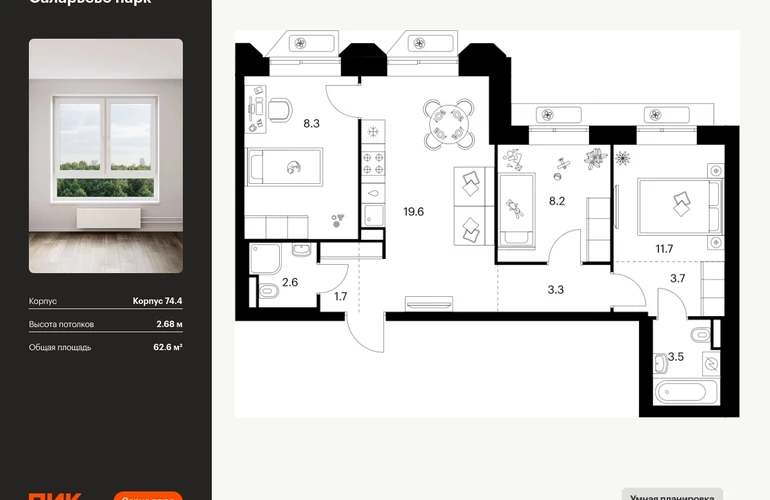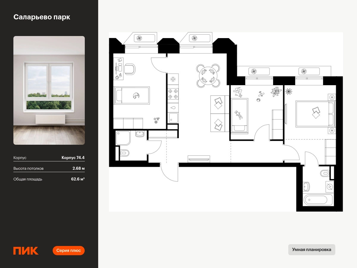 Продаётся 3-комн.квартира площадью 62.60 кв.м на 6 этаже 18 этажного дома (Корпус 74.4, секция 4) проекта ПИК Саларьево парк. Светлый просторный подъезд на уровне земли, функциональная планировка, большие окна, с отделкой. Жилой район «Саларьево парк» расположен в Новой Москве, в четырёх километрах от МКАД по Киевскому шоссе. Две станции метро: «Саларьево» и «Филатов луг» — находятся в пешей доступности от проекта. Дойти до них можно за 5–10 минут. В квартале уже создана качественная среда, где есть абсолютно всё для полноценной жизни, работы и отдыха. «Саларьево парк» — не просто квартал, а полноценный жилой район, который отличается разноплановой архитектурой. Над концепцией квартала работали несколько ведущих архитектурных бюро, которые стремились добиться разнообразия в фасадных решениях. Ярким примером такого подхода станет корпус 83, который относится к «Серии плюс». Новый корпус 83 был создан по принципам южной архитектуры: расслабленный и лаконичный силуэт зданий, привлекающий к себе внимание. Архитектурная изюминка 83-го корпуса — террасы и фигурные балконы. Вместе с окнами и другими акцентными элементами они создают уникальный облик здания, отсылая нас к изысканной южной архитектуре. Все корпуса в квартале гармонично сочетаются, образуя единую городскую среду. Здесь приятно гулять и проводить время на улице всей семьёй. В «Саларьево парке» создана уникальная образовательная среда, включающая в себя шесть школ, рассчитанных на 6 250 учеников. Две из них уже открыты, их посещает 2 300 детей. Также на территории «Саларьево парка» находится 12 детских садов, один из которых с бассейном. Сейчас уже открыты 7 садов. В «Саларьево парке» открыта уникальная игровая площадка — PlayHub «Оригами». Здесь есть ручей, горка-труба и рельефные холмы. Взрослые смогут отдохнуть в уютном кафе, пока дети играют. Также на территории проекта есть SportHub — большая спортивная зона, разделённая по интересам и возрастам. Здесь можно заниматься разными видами спорта: футболом, баскетболом, волейболом и стритболом. Зимой центральную часть площадки превращают в каток. Во дворах-парках жилого квартала есть места для отдыха, детские и спортивные площадки. На первых этажах домов расположены магазины, кафе и полезные сервисы. Также вблизи проекта есть несколько масштабных торговых центров. До ТЦ «Саларис» пять минут пешком, до «Рио», Metro Cash & Carry и «Лемана про» — пять минут на автомобиле. Артикул - 1006551О застройщике