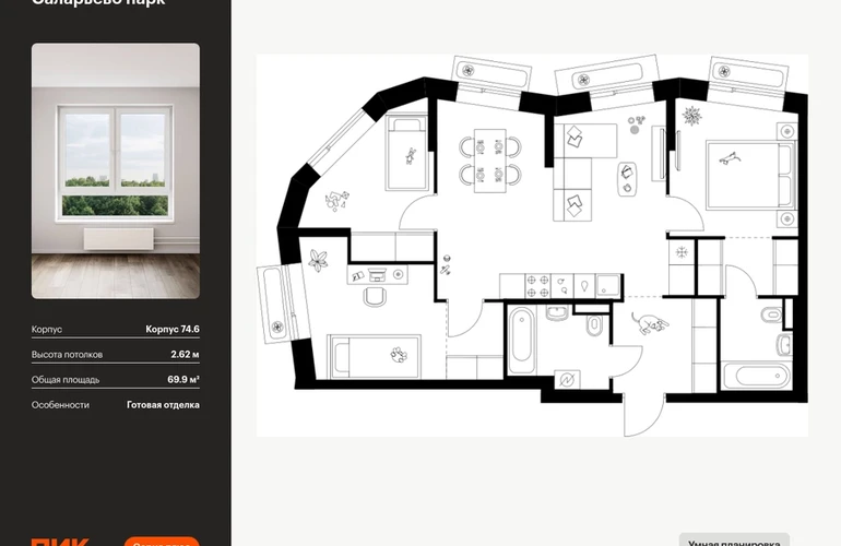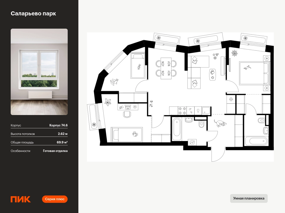 Продаётся 3-комн.квартира площадью 69.90 кв.м на 11 этаже 18 этажного дома (Корпус 74.6, секция 6) проекта ПИК Саларьево парк. Светлый просторный подъезд на уровне земли, функциональная планировка, большие окна, с отделкой. Жилой район «Саларьево парк» расположен в Новой Москве, в четырёх километрах от МКАД по Киевскому шоссе. Две станции метро: «Саларьево» и «Филатов луг» — находятся в пешей доступности от проекта. Дойти до них можно за 5–10 минут. В квартале уже создана качественная среда, где есть абсолютно всё для полноценной жизни, работы и отдыха. «Саларьево парк» — не просто квартал, а полноценный жилой район, который отличается разноплановой архитектурой. Над концепцией квартала работали несколько ведущих архитектурных бюро, которые стремились добиться разнообразия в фасадных решениях. Ярким примером такого подхода станет корпус 83, который относится к «Серии плюс». Новый корпус 83 был создан по принципам южной архитектуры: расслабленный и лаконичный силуэт зданий, привлекающий к себе внимание. Архитектурная изюминка 83-го корпуса — террасы и фигурные балконы. Вместе с окнами и другими акцентными элементами они создают уникальный облик здания, отсылая нас к изысканной южной архитектуре. Все корпуса в квартале гармонично сочетаются, образуя единую городскую среду. Здесь приятно гулять и проводить время на улице всей семьёй. В «Саларьево парке» создана уникальная образовательная среда, включающая в себя шесть школ, рассчитанных на 6 250 учеников. Две из них уже открыты, их посещает 2 300 детей. Также на территории «Саларьево парка» находится 12 детских садов, один из которых с бассейном. Сейчас уже открыты 7 садов. В «Саларьево парке» открыта уникальная игровая площадка — PlayHub «Оригами». Здесь есть ручей, горка-труба и рельефные холмы. Взрослые смогут отдохнуть в уютном кафе, пока дети играют. Также на территории проекта есть SportHub — большая спортивная зона, разделённая по интересам и возрастам. Здесь можно заниматься разными видами спорта: футболом, баскетболом, волейболом и стритболом. Зимой центральную часть площадки превращают в каток. Во дворах-парках жилого квартала есть места для отдыха, детские и спортивные площадки. На первых этажах домов расположены магазины, кафе и полезные сервисы. Также вблизи проекта есть несколько масштабных торговых центров. До ТЦ «Саларис» пять минут пешком, до «Рио», Metro Cash & Carry и «Лемана про» — пять минут на автомобиле. Артикул - 1006881О застройщике