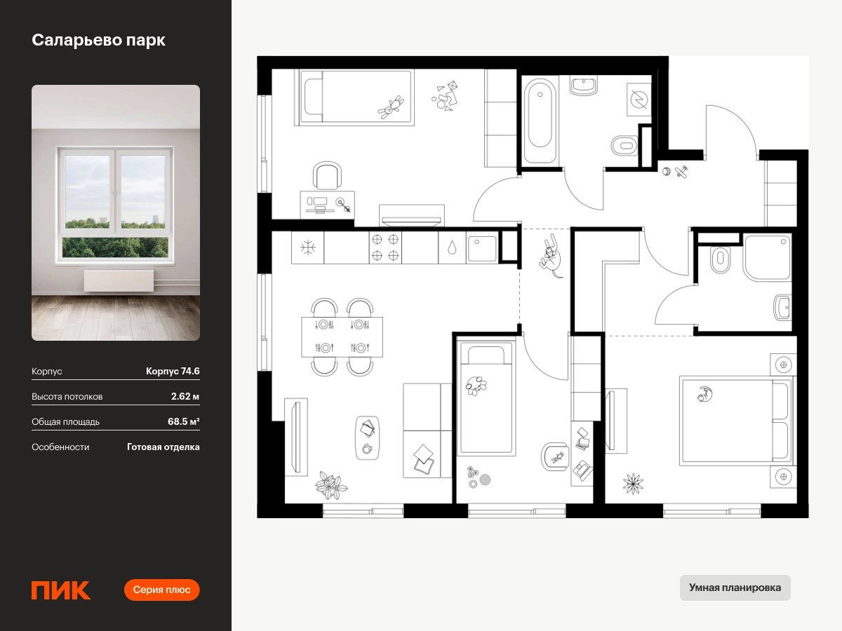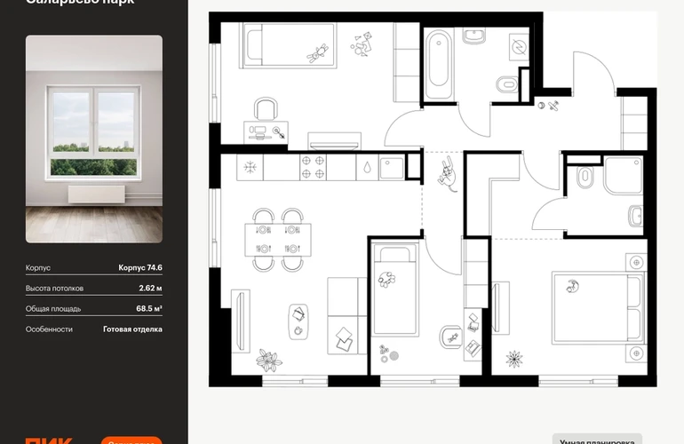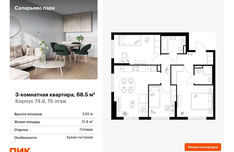 Продаётся 3-комн.квартира площадью 68.50 кв.м на 15 этаже 18 этажного дома (Корпус 74.6, секция 6) проекта ПИК Саларьево парк. Светлый просторный подъезд на уровне земли, функциональная планировка, большие окна, с отделкой. <br> <br>Жилой район «Саларьево парк» расположен в Новой Москве, в четырёх километрах от МКАД по Киевскому шоссе. Две станции метро: «Саларьево» и «Филатов луг» — находятся в пешей доступности от проекта. Дойти до них можно за 5–10 минут. В квартале уже создана качественная среда, где есть абсолютно всё для полноценной жизни, работы и отдыха. <br> <br>«Саларьево парк» — не просто квартал, а полноценный жилой район, который отличается разноплановой архитектурой. Над концепцией квартала работали несколько ведущих архитектурных бюро, которые стремились добиться разнообразия в фасадных решениях. Ярким примером такого подхода станет корпус 83, который относится к «Серии плюс». <br> <br>Новый корпус 83 был создан по принципам южной архитектуры: расслабленный и лаконичный силуэт зданий, привлекающий к себе внимание. Архитектурная изюминка 83-го корпуса — террасы и фигурные балконы. Вместе с окнами и другими акцентными элементами они создают уникальный облик здания, отсылая нас к изысканной южной архитектуре. <br> <br>Все корпуса в квартале гармонично сочетаются, образуя единую городскую среду. Здесь приятно гулять и проводить время на улице всей семьёй. <br> <br>В «Саларьево парке» создана уникальная образовательная среда, включающая в себя шесть школ, рассчитанных на 6 250 учеников. Две из них уже открыты, их посещает 2 300 детей. Также на территории «Саларьево парка» находится 12 детских садов, один из которых с бассейном. Сейчас уже открыты 7 садов. <br> <br>В «Саларьево парке» открыта уникальная игровая площадка — PlayHub «Оригами». Здесь есть ручей, горка-труба и рельефные холмы. Взрослые смогут отдохнуть в уютном кафе, пока дети играют. Также на территории проекта есть SportHub — большая спортивная зона, разделённая по интересам и возрастам. Здесь можно заниматься разными видами спорта: футболом, баскетболом, волейболом и стритболом. Зимой центральную часть площадки превращают в каток. <br> <br>Во дворах-парках жилого квартала есть места для отдыха, детские и спортивные площадки. На первых этажах домов расположены магазины, кафе и полезные сервисы. Также вблизи проекта есть несколько масштабных торговых центров. До ТЦ «Саларис» пять минут пешком, до «Рио», Metro Cash & Carry и «Лемана про» — пять минут на автомобиле. Артикул - 1006939О застройщике