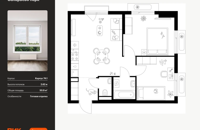 Продаётся 2-комн.квартира площадью 50.90 кв.м на 7 этаже 18 этажного дома (Корпус 74.1, секция 1) проекта ПИК Саларьево парк. Светлый просторный подъезд на уровне земли, функциональная планировка, большие окна, с отделкой. Жилой район «Саларьево парк» расположен в Новой Москве, в четырёх километрах от МКАД по Киевскому шоссе. Две станции метро: «Саларьево» и «Филатов луг» — находятся в пешей доступности от проекта. Дойти до них можно за 5–10 минут. В квартале уже создана качественная среда, где есть абсолютно всё для полноценной жизни, работы и отдыха. «Саларьево парк» — не просто квартал, а полноценный жилой район, который отличается разноплановой архитектурой. Над концепцией квартала работали несколько ведущих архитектурных бюро, которые стремились добиться разнообразия в фасадных решениях. Ярким примером такого подхода станет корпус 83, который относится к «Серии плюс». Новый корпус 83 был создан по принципам южной архитектуры: расслабленный и лаконичный силуэт зданий, привлекающий к себе внимание. Архитектурная изюминка 83-го корпуса — террасы и фигурные балконы. Вместе с окнами и другими акцентными элементами они создают уникальный облик здания, отсылая нас к изысканной южной архитектуре. Все корпуса в квартале гармонично сочетаются, образуя единую городскую среду. Здесь приятно гулять и проводить время на улице всей семьёй. В «Саларьево парке» создана уникальная образовательная среда, включающая в себя шесть школ, рассчитанных на 6 250 учеников. Две из них уже открыты, их посещает 2 300 детей. Также на территории «Саларьево парка» находится 12 детских садов, один из которых с бассейном. Сейчас уже открыты 7 садов. В «Саларьево парке» открыта уникальная игровая площадка — PlayHub «Оригами». Здесь есть ручей, горка-труба и рельефные холмы. Взрослые смогут отдохнуть в уютном кафе, пока дети играют. Также на территории проекта есть SportHub — большая спортивная зона, разделённая по интересам и возрастам. Здесь можно заниматься разными видами спорта: футболом, баскетболом, волейболом и стритболом. Зимой центральную часть площадки превращают в каток. Во дворах-парках жилого квартала есть места для отдыха, детские и спортивные площадки. На первых этажах домов расположены магазины, кафе и полезные сервисы. Также вблизи проекта есть несколько масштабных торговых центров. До ТЦ «Саларис» пять минут пешком, до «Рио», Metro Cash & Carry и «Лемана про» — пять минут на автомобиле. Артикул - 1006106О застройщике