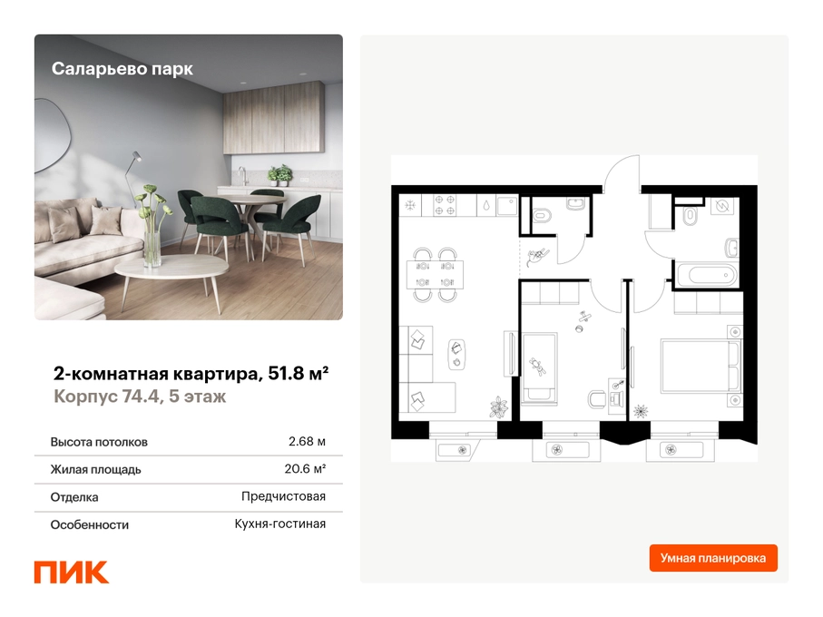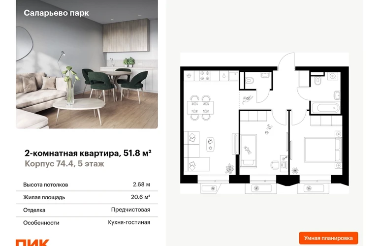 Продаётся 2-комн.квартира площадью 51.80 кв.м на 5 этаже 18 этажного дома (Корпус 74.4, секция 4) проекта ПИК Саларьево парк. Светлый просторный подъезд на уровне земли, функциональная планировка, большие окна, с отделкой. <br> <br>Жилой район «Саларьево парк» расположен в Новой Москве, в четырёх километрах от МКАД по Киевскому шоссе. Две станции метро: «Саларьево» и «Филатов луг» — находятся в пешей доступности от проекта. Дойти до них можно за 5–10 минут. В квартале уже создана качественная среда, где есть абсолютно всё для полноценной жизни, работы и отдыха. <br> <br>«Саларьево парк» — не просто квартал, а полноценный жилой район, который отличается разноплановой архитектурой. Над концепцией квартала работали несколько ведущих архитектурных бюро, которые стремились добиться разнообразия в фасадных решениях. Ярким примером такого подхода станет корпус 83, который относится к «Серии плюс». <br> <br>Новый корпус 83 был создан по принципам южной архитектуры: расслабленный и лаконичный силуэт зданий, привлекающий к себе внимание. Архитектурная изюминка 83-го корпуса — террасы и фигурные балконы. Вместе с окнами и другими акцентными элементами они создают уникальный облик здания, отсылая нас к изысканной южной архитектуре. <br> <br>Все корпуса в квартале гармонично сочетаются, образуя единую городскую среду. Здесь приятно гулять и проводить время на улице всей семьёй. <br> <br>В «Саларьево парке» создана уникальная образовательная среда, включающая в себя шесть школ, рассчитанных на 6 250 учеников. Две из них уже открыты, их посещает 2 300 детей. Также на территории «Саларьево парка» находится 12 детских садов, один из которых с бассейном. Сейчас уже открыты 7 садов. <br> <br>В «Саларьево парке» открыта уникальная игровая площадка — PlayHub «Оригами». Здесь есть ручей, горка-труба и рельефные холмы. Взрослые смогут отдохнуть в уютном кафе, пока дети играют. Также на территории проекта есть SportHub — большая спортивная зона, разделённая по интересам и возрастам. Здесь можно заниматься разными видами спорта: футболом, баскетболом, волейболом и стритболом. Зимой центральную часть площадки превращают в каток. <br> <br>Во дворах-парках жилого квартала есть места для отдыха, детские и спортивные площадки. На первых этажах домов расположены магазины, кафе и полезные сервисы. Также вблизи проекта есть несколько масштабных торговых центров. До ТЦ «Саларис» пять минут пешком, до «Рио», Metro Cash & Carry и «Леруа Мерлен» — пять минут на автомобиле. Артикул - 1006546О застройщике