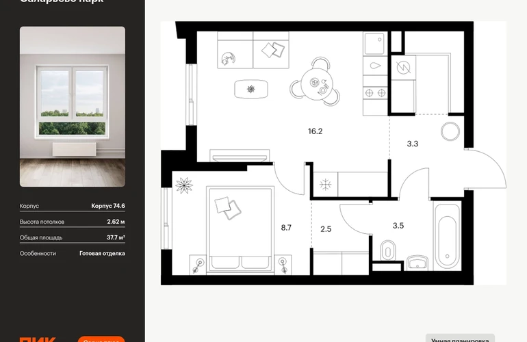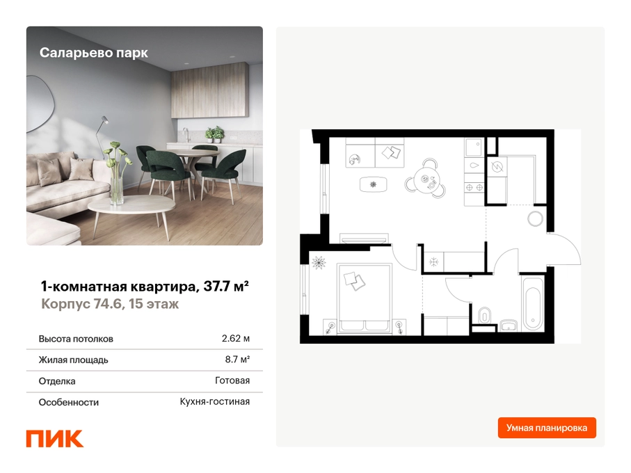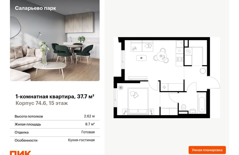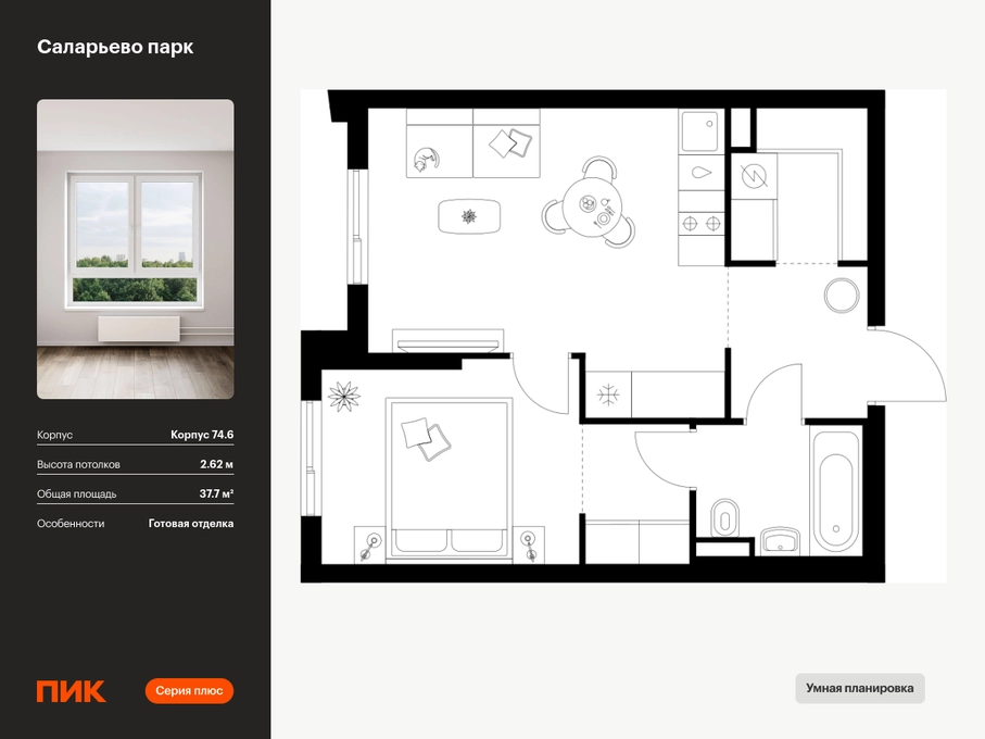 Продаётся 1-комн.квартира площадью 37.70 кв.м на 15 этаже 18 этажного дома (Корпус 74.6, секция 6) проекта ПИК Саларьево парк. Светлый просторный подъезд на уровне земли, функциональная планировка, большие окна, с отделкой. <br> <br>Жилой район «Саларьево парк» расположен в Новой Москве, в четырёх километрах от МКАД по Киевскому шоссе. Две станции метро: «Саларьево» и «Филатов луг» — находятся в пешей доступности от проекта. Дойти до них можно за 5–10 минут. В квартале уже создана качественная среда, где есть абсолютно всё для полноценной жизни, работы и отдыха. <br> <br>«Саларьево парк» — не просто квартал, а полноценный жилой район, который отличается разноплановой архитектурой. Над концепцией квартала работали несколько ведущих архитектурных бюро, которые стремились добиться разнообразия в фасадных решениях. Ярким примером такого подхода станет корпус 83, который относится к «Серии плюс». <br> <br>Новый корпус 83 был создан по принципам южной архитектуры: расслабленный и лаконичный силуэт зданий, привлекающий к себе внимание. Архитектурная изюминка 83-го корпуса — террасы и фигурные балконы. Вместе с окнами и другими акцентными элементами они создают уникальный облик здания, отсылая нас к изысканной южной архитектуре. <br> <br>Все корпуса в квартале гармонично сочетаются, образуя единую городскую среду. Здесь приятно гулять и проводить время на улице всей семьёй. <br> <br>В «Саларьево парке» создана уникальная образовательная среда, включающая в себя шесть школ, рассчитанных на 6 250 учеников. Две из них уже открыты, их посещает 2 300 детей. Также на территории «Саларьево парка» находится 12 детских садов, один из которых с бассейном. Сейчас уже открыты 7 садов. <br> <br>В «Саларьево парке» открыта уникальная игровая площадка — PlayHub «Оригами». Здесь есть ручей, горка-труба и рельефные холмы. Взрослые смогут отдохнуть в уютном кафе, пока дети играют. Также на территории проекта есть SportHub — большая спортивная зона, разделённая по интересам и возрастам. Здесь можно заниматься разными видами спорта: футболом, баскетболом, волейболом и стритболом. Зимой центральную часть площадки превращают в каток. <br> <br>Во дворах-парках жилого квартала есть места для отдыха, детские и спортивные площадки. На первых этажах домов расположены магазины, кафе и полезные сервисы. Также вблизи проекта есть несколько масштабных торговых центров. До ТЦ «Саларис» пять минут пешком, до «Рио», Metro Cash & Carry и «Лемана про» — пять минут на автомобиле. Артикул - 1006941О застройщике
