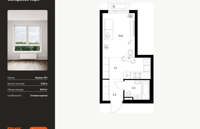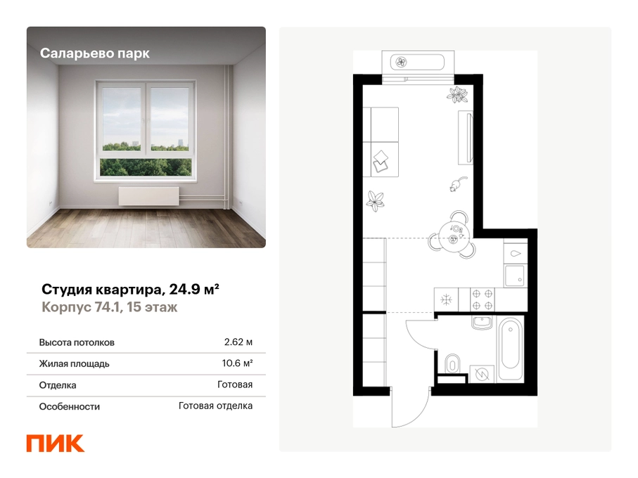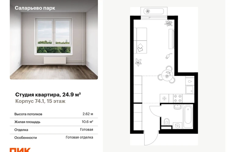 Продаётся квартира-студия площадью 24.90 кв.м на 15 этаже 18 этажного дома (Корпус 74.1, секция 1) проекта ПИК Саларьево парк. Светлый просторный подъезд на уровне земли, функциональная планировка, большие окна, с отделкой. Жилой район «Саларьево парк» расположен в Новой Москве, в четырёх километрах от МКАД по Киевскому шоссе. Две станции метро: «Саларьево» и «Филатов луг» — находятся в пешей доступности от проекта. Дойти до них можно за 5–10 минут. В квартале уже создана качественная среда, где есть абсолютно всё для полноценной жизни, работы и отдыха. «Саларьево парк» — не просто квартал, а полноценный жилой район, который отличается разноплановой архитектурой. Над концепцией квартала работали несколько ведущих архитектурных бюро, которые стремились добиться разнообразия в фасадных решениях. Ярким примером такого подхода станет корпус 83, который относится к «Серии плюс». Новый корпус 83 был создан по принципам южной архитектуры: расслабленный и лаконичный силуэт зданий, привлекающий к себе внимание. Архитектурная изюминка 83-го корпуса — террасы и фигурные балконы. Вместе с окнами и другими акцентными элементами они создают уникальный облик здания, отсылая нас к изысканной южной архитектуре. Все корпуса в квартале гармонично сочетаются, образуя единую городскую среду. Здесь приятно гулять и проводить время на улице всей семьёй. В «Саларьево парке» создана уникальная образовательная среда, включающая в себя шесть школ, рассчитанных на 6 250 учеников. Две из них уже открыты, их посещает 2 300 детей. Также на территории «Саларьево парка» находится 12 детских садов, один из которых с бассейном. Сейчас уже открыты 7 садов. В «Саларьево парке» открыта уникальная игровая площадка — PlayHub «Оригами». Здесь есть ручей, горка-труба и рельефные холмы. Взрослые смогут отдохнуть в уютном кафе, пока дети играют. Также на территории проекта есть SportHub — большая спортивная зона, разделённая по интересам и возрастам. Здесь можно заниматься разными видами спорта: футболом, баскетболом, волейболом и стритболом. Зимой центральную часть площадки превращают в каток. Во дворах-парках жилого квартала есть места для отдыха, детские и спортивные площадки. На первых этажах домов расположены магазины, кафе и полезные сервисы. Также вблизи проекта есть несколько масштабных торговых центров. До ТЦ «Саларис» пять минут пешком, до «Рио», Metro Cash & Carry и «Лемана про» — пять минут на автомобиле. Артикул - 1006223О застройщике
