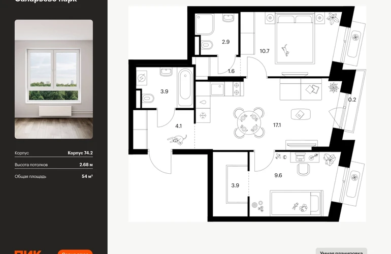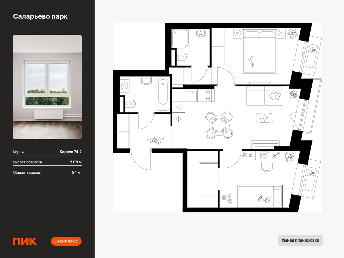 Продаётся 2-комн.квартира площадью 54.00 кв.м на 12 этаже 18 этажного дома (Корпус 74.2, секция 2) проекта ПИК Саларьево парк. Светлый просторный подъезд на уровне земли, функциональная планировка, большие окна, с отделкой. Жилой район «Саларьево парк» расположен в Новой Москве, в четырёх километрах от МКАД по Киевскому шоссе. Две станции метро: «Саларьево» и «Филатов луг» — находятся в пешей доступности от проекта. Дойти до них можно за 5–10 минут. В квартале уже создана качественная среда, где есть абсолютно всё для полноценной жизни, работы и отдыха. «Саларьево парк» — не просто квартал, а полноценный жилой район, который отличается разноплановой архитектурой. Над концепцией квартала работали несколько ведущих архитектурных бюро, которые стремились добиться разнообразия в фасадных решениях. Ярким примером такого подхода станет корпус 83, который относится к «Серии плюс». Новый корпус 83 был создан по принципам южной архитектуры: расслабленный и лаконичный силуэт зданий, привлекающий к себе внимание. Архитектурная изюминка 83-го корпуса — террасы и фигурные балконы. Вместе с окнами и другими акцентными элементами они создают уникальный облик здания, отсылая нас к изысканной южной архитектуре. Все корпуса в квартале гармонично сочетаются, образуя единую городскую среду. Здесь приятно гулять и проводить время на улице всей семьёй. В «Саларьево парке» создана уникальная образовательная среда, включающая в себя шесть школ, рассчитанных на 6 250 учеников. Две из них уже открыты, их посещает 2 300 детей. Также на территории «Саларьево парка» находится 12 детских садов, один из которых с бассейном. Сейчас уже открыты 7 садов. В «Саларьево парке» открыта уникальная игровая площадка — PlayHub «Оригами». Здесь есть ручей, горка-труба и рельефные холмы. Взрослые смогут отдохнуть в уютном кафе, пока дети играют. Также на территории проекта есть SportHub — большая спортивная зона, разделённая по интересам и возрастам. Здесь можно заниматься разными видами спорта: футболом, баскетболом, волейболом и стритболом. Зимой центральную часть площадки превращают в каток. Во дворах-парках жилого квартала есть места для отдыха, детские и спортивные площадки. На первых этажах домов расположены магазины, кафе и полезные сервисы. Также вблизи проекта есть несколько масштабных торговых центров. До ТЦ «Саларис» пять минут пешком, до «Рио», Metro Cash & Carry и «Лемана про» — пять минут на автомобиле. Артикул - 1006406О застройщике