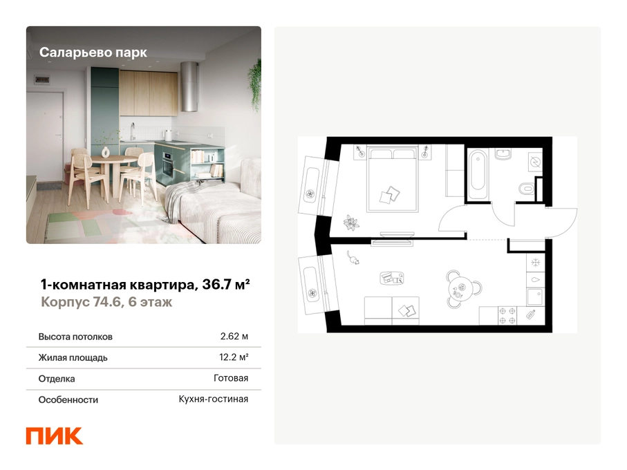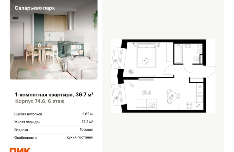 Продаётся 1-комн.квартира площадью 36.70 кв.м на 6 этаже 18 этажного дома (Корпус 74.6, секция 6) проекта ПИК Саларьево парк. Светлый просторный подъезд на уровне земли, функциональная планировка, большие окна, с отделкой. <br> <br>Жилой район «Саларьево парк» расположен в Новой Москве, в четырёх километрах от МКАД по Киевскому шоссе. Две станции метро: «Саларьево» и «Филатов луг» — находятся в пешей доступности от проекта. Дойти до них можно за 5–10 минут. В квартале уже создана качественная среда, где есть абсолютно всё для полноценной жизни, работы и отдыха. <br> <br>«Саларьево парк» — не просто квартал, а полноценный жилой район, который отличается разноплановой архитектурой. Над концепцией квартала работали несколько ведущих архитектурных бюро, которые стремились добиться разнообразия в фасадных решениях. Ярким примером такого подхода станет корпус 83, который относится к «Серии плюс». <br> <br>Новый корпус 83 был создан по принципам южной архитектуры: расслабленный и лаконичный силуэт зданий, привлекающий к себе внимание. Архитектурная изюминка 83-го корпуса — террасы и фигурные балконы. Вместе с окнами и другими акцентными элементами они создают уникальный облик здания, отсылая нас к изысканной южной архитектуре. <br> <br>Все корпуса в квартале гармонично сочетаются, образуя единую городскую среду. Здесь приятно гулять и проводить время на улице всей семьёй. <br> <br>В «Саларьево парке» создана уникальная образовательная среда, включающая в себя шесть школ, рассчитанных на 6 250 учеников. Две из них уже открыты, их посещает 2 300 детей. Также на территории «Саларьево парка» находится 12 детских садов, один из которых с бассейном. Сейчас уже открыты 7 садов. <br> <br>В «Саларьево парке» открыта уникальная игровая площадка — PlayHub «Оригами». Здесь есть ручей, горка-труба и рельефные холмы. Взрослые смогут отдохнуть в уютном кафе, пока дети играют. Также на территории проекта есть SportHub — большая спортивная зона, разделённая по интересам и возрастам. Здесь можно заниматься разными видами спорта: футболом, баскетболом, волейболом и стритболом. Зимой центральную часть площадки превращают в каток. <br> <br>Во дворах-парках жилого квартала есть места для отдыха, детские и спортивные площадки. На первых этажах домов расположены магазины, кафе и полезные сервисы. Также вблизи проекта есть несколько масштабных торговых центров. До ТЦ «Саларис» пять минут пешком, до «Рио», Metro Cash & Carry и «Лемана про» — пять минут на автомобиле. Артикул - 1006825О застройщике