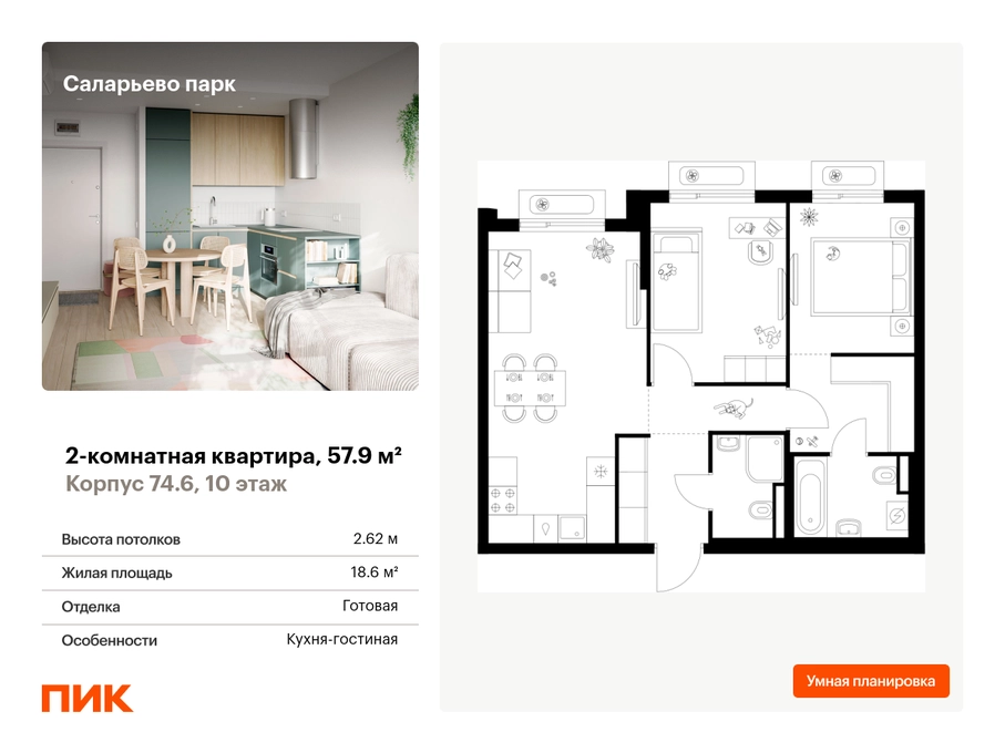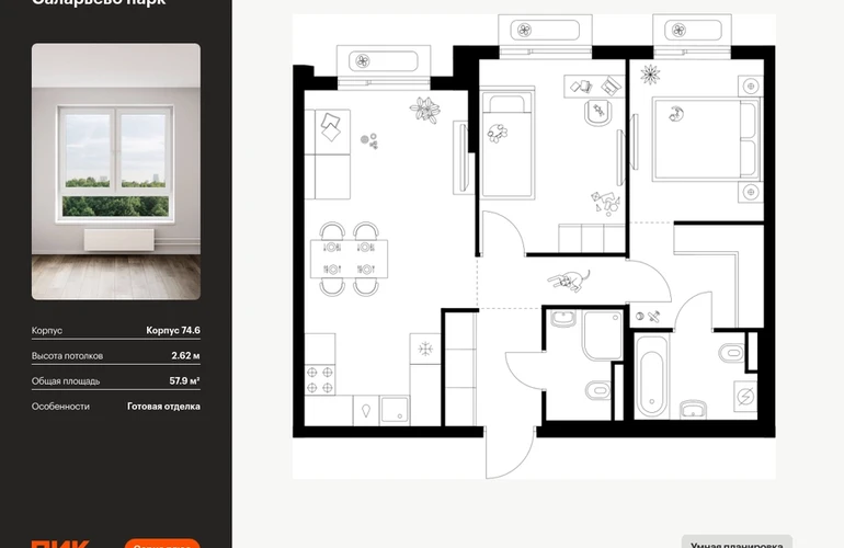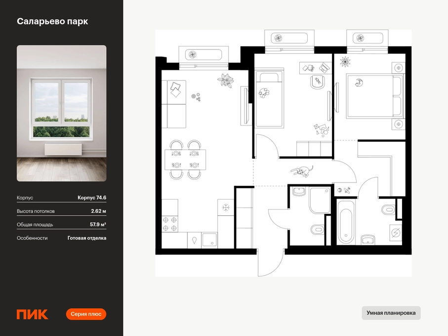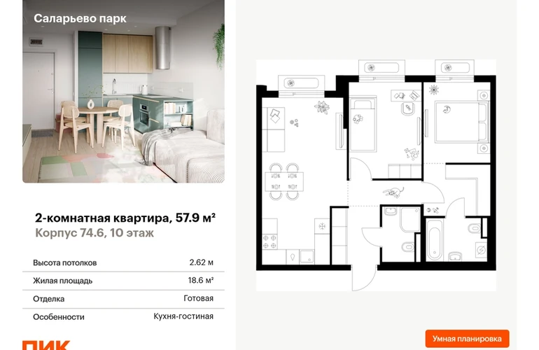 Продаётся 2-комн.квартира площадью 57.90 кв.м на 10 этаже 18 этажного дома (Корпус 74.6, секция 6) проекта ПИК Саларьево парк. Светлый просторный подъезд на уровне земли, функциональная планировка, большие окна, с отделкой. <br> <br>Жилой район «Саларьево парк» расположен в Новой Москве, в четырёх километрах от МКАД по Киевскому шоссе. Две станции метро: «Саларьево» и «Филатов луг» — находятся в пешей доступности от проекта. Дойти до них можно за 5–10 минут. В квартале уже создана качественная среда, где есть абсолютно всё для полноценной жизни, работы и отдыха. <br> <br>«Саларьево парк» — не просто квартал, а полноценный жилой район, который отличается разноплановой архитектурой. Над концепцией квартала работали несколько ведущих архитектурных бюро, которые стремились добиться разнообразия в фасадных решениях. Ярким примером такого подхода станет корпус 83, который относится к «Серии плюс». <br> <br>Новый корпус 83 был создан по принципам южной архитектуры: расслабленный и лаконичный силуэт зданий, привлекающий к себе внимание. Архитектурная изюминка 83-го корпуса — террасы и фигурные балконы. Вместе с окнами и другими акцентными элементами они создают уникальный облик здания, отсылая нас к изысканной южной архитектуре. <br> <br>Все корпуса в квартале гармонично сочетаются, образуя единую городскую среду. Здесь приятно гулять и проводить время на улице всей семьёй. <br> <br>В «Саларьево парке» создана уникальная образовательная среда, включающая в себя шесть школ, рассчитанных на 6 250 учеников. Две из них уже открыты, их посещает 2 300 детей. Также на территории «Саларьево парка» находится 12 детских садов, один из которых с бассейном. Сейчас уже открыты 7 садов. <br> <br>В «Саларьево парке» открыта уникальная игровая площадка — PlayHub «Оригами». Здесь есть ручей, горка-труба и рельефные холмы. Взрослые смогут отдохнуть в уютном кафе, пока дети играют. Также на территории проекта есть SportHub — большая спортивная зона, разделённая по интересам и возрастам. Здесь можно заниматься разными видами спорта: футболом, баскетболом, волейболом и стритболом. Зимой центральную часть площадки превращают в каток. <br> <br>Во дворах-парках жилого квартала есть места для отдыха, детские и спортивные площадки. На первых этажах домов расположены магазины, кафе и полезные сервисы. Также вблизи проекта есть несколько масштабных торговых центров. До ТЦ «Саларис» пять минут пешком, до «Рио», Metro Cash & Carry и «Лемана про» — пять минут на автомобиле. Артикул - 1006871О застройщике
