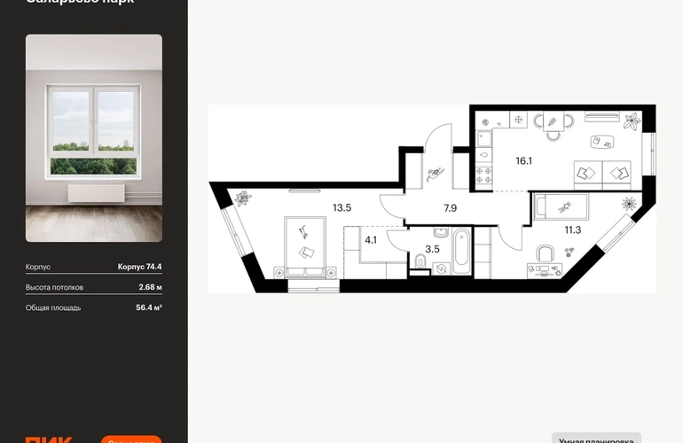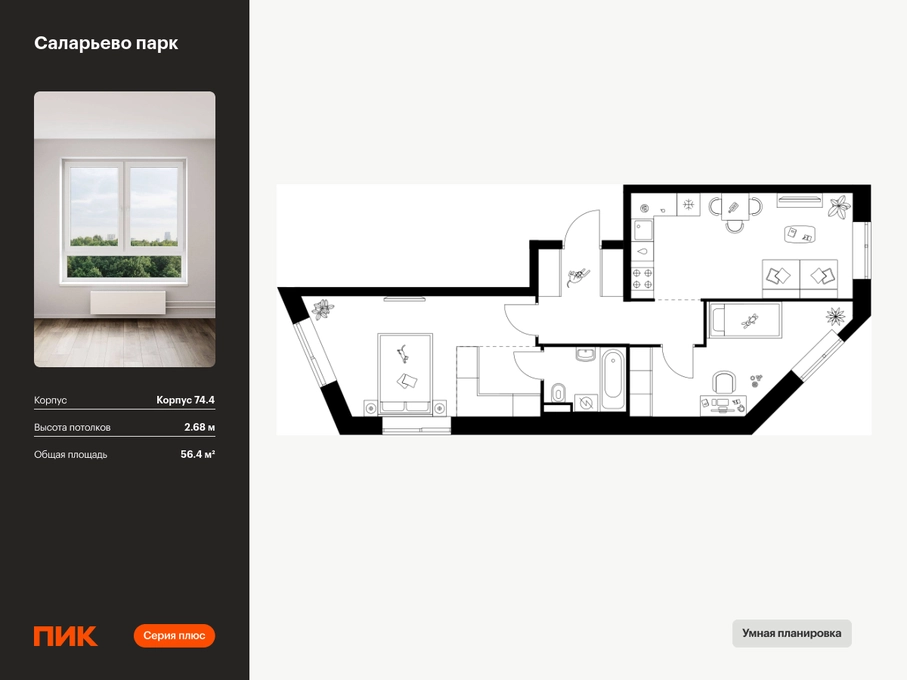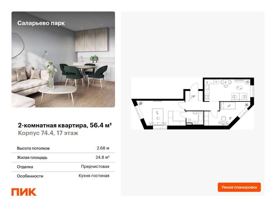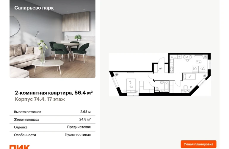 Продаётся 2-комн.квартира площадью 56.40 кв.м на 17 этаже 18 этажного дома (Корпус 74.4, секция 4) проекта ПИК Саларьево парк. Светлый просторный подъезд на уровне земли, функциональная планировка, большие окна, с отделкой. Артикул - 1006611О застройщике