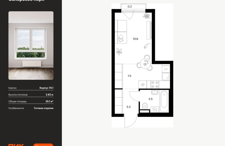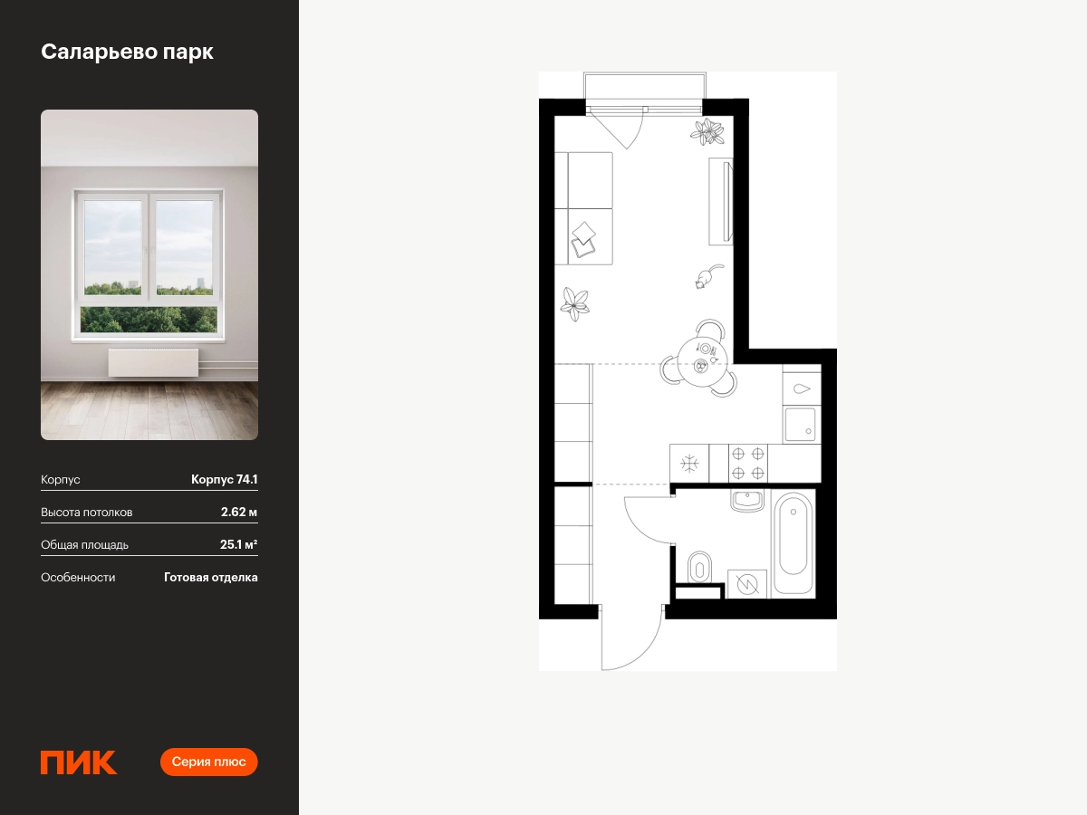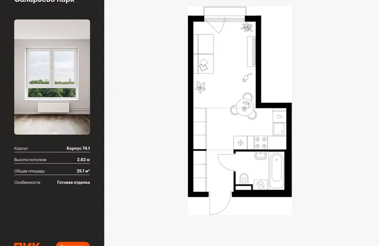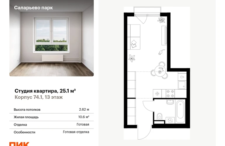 Продаётся квартира-студия площадью 25.10 кв.м на 13 этаже 18 этажного дома (Корпус 74.1, секция 1) проекта ПИК Саларьево парк. Светлый просторный подъезд на уровне земли, функциональная планировка, большие окна, с отделкой. <br> <br>Жилой район «Саларьево парк» расположен в Новой Москве, в четырёх километрах от МКАД по Киевскому шоссе. Две станции метро: «Саларьево» и «Филатов луг» — находятся в пешей доступности от проекта. Дойти до них можно за 5–10 минут. В квартале уже создана качественная среда, где есть абсолютно всё для полноценной жизни, работы и отдыха. <br> <br>«Саларьево парк» — не просто квартал, а полноценный жилой район, который отличается разноплановой архитектурой. Над концепцией квартала работали несколько ведущих архитектурных бюро, которые стремились добиться разнообразия в фасадных решениях. Ярким примером такого подхода станет корпус 83, который относится к «Серии плюс». <br> <br>Новый корпус 83 был создан по принципам южной архитектуры: расслабленный и лаконичный силуэт зданий, привлекающий к себе внимание. Архитектурная изюминка 83-го корпуса — террасы и фигурные балконы. Вместе с окнами и другими акцентными элементами они создают уникальный облик здания, отсылая нас к изысканной южной архитектуре. <br> <br>Все корпуса в квартале гармонично сочетаются, образуя единую городскую среду. Здесь приятно гулять и проводить время на улице всей семьёй. <br> <br>В «Саларьево парке» создана уникальная образовательная среда, включающая в себя шесть школ, рассчитанных на 6 250 учеников. Две из них уже открыты, их посещает 2 300 детей. Также на территории «Саларьево парка» находится 12 детских садов, один из которых с бассейном. Сейчас уже открыты 7 садов. <br> <br>В «Саларьево парке» открыта уникальная игровая площадка — PlayHub «Оригами». Здесь есть ручей, горка-труба и рельефные холмы. Взрослые смогут отдохнуть в уютном кафе, пока дети играют. Также на территории проекта есть SportHub — большая спортивная зона, разделённая по интересам и возрастам. Здесь можно заниматься разными видами спорта: футболом, баскетболом, волейболом и стритболом. Зимой центральную часть площадки превращают в каток. <br> <br>Во дворах-парках жилого квартала есть места для отдыха, детские и спортивные площадки. На первых этажах домов расположены магазины, кафе и полезные сервисы. Также вблизи проекта есть несколько масштабных торговых центров. До ТЦ «Саларис» пять минут пешком, до «Рио», Metro Cash & Carry и «Лемана про» — пять минут на автомобиле. Артикул - 1006193О застройщике