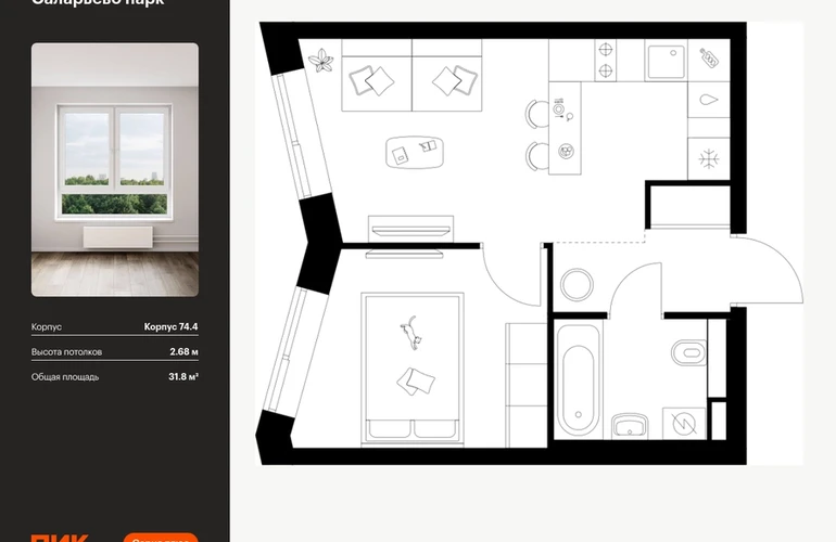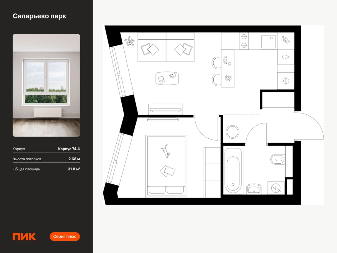 Продаётся 1-комн.квартира площадью 31.80 кв.м на 13 этаже 18 этажного дома (Корпус 74.4, секция 4) проекта ПИК Саларьево парк. Светлый просторный подъезд на уровне земли, функциональная планировка, большие окна, с отделкой. Жилой район «Саларьево парк» расположен в Новой Москве, в четырёх километрах от МКАД по Киевскому шоссе. Две станции метро: «Саларьево» и «Филатов луг» — находятся в пешей доступности от проекта. Дойти до них можно за 5–10 минут. В квартале уже создана качественная среда, где есть абсолютно всё для полноценной жизни, работы и отдыха. «Саларьево парк» — не просто квартал, а полноценный жилой район, который отличается разноплановой архитектурой. Над концепцией квартала работали несколько ведущих архитектурных бюро, которые стремились добиться разнообразия в фасадных решениях. Ярким примером такого подхода станет корпус 83, который относится к «Серии плюс». Новый корпус 83 был создан по принципам южной архитектуры: расслабленный и лаконичный силуэт зданий, привлекающий к себе внимание. Архитектурная изюминка 83-го корпуса — террасы и фигурные балконы. Вместе с окнами и другими акцентными элементами они создают уникальный облик здания, отсылая нас к изысканной южной архитектуре. Все корпуса в квартале гармонично сочетаются, образуя единую городскую среду. Здесь приятно гулять и проводить время на улице всей семьёй. В «Саларьево парке» создана уникальная образовательная среда, включающая в себя шесть школ, рассчитанных на 6 250 учеников. Две из них уже открыты, их посещает 2 300 детей. Также на территории «Саларьево парка» находится 12 детских садов, один из которых с бассейном. Сейчас уже открыты 7 садов. В «Саларьево парке» открыта уникальная игровая площадка — PlayHub «Оригами». Здесь есть ручей, горка-труба и рельефные холмы. Взрослые смогут отдохнуть в уютном кафе, пока дети играют. Также на территории проекта есть SportHub — большая спортивная зона, разделённая по интересам и возрастам. Здесь можно заниматься разными видами спорта: футболом, баскетболом, волейболом и стритболом. Зимой центральную часть площадки превращают в каток. Во дворах-парках жилого квартала есть места для отдыха, детские и спортивные площадки. На первых этажах домов расположены магазины, кафе и полезные сервисы. Также вблизи проекта есть несколько масштабных торговых центров. До ТЦ «Саларис» пять минут пешком, до «Рио», Metro Cash & Carry и «Лемана про» — пять минут на автомобиле. Артикул - 1006592О застройщике