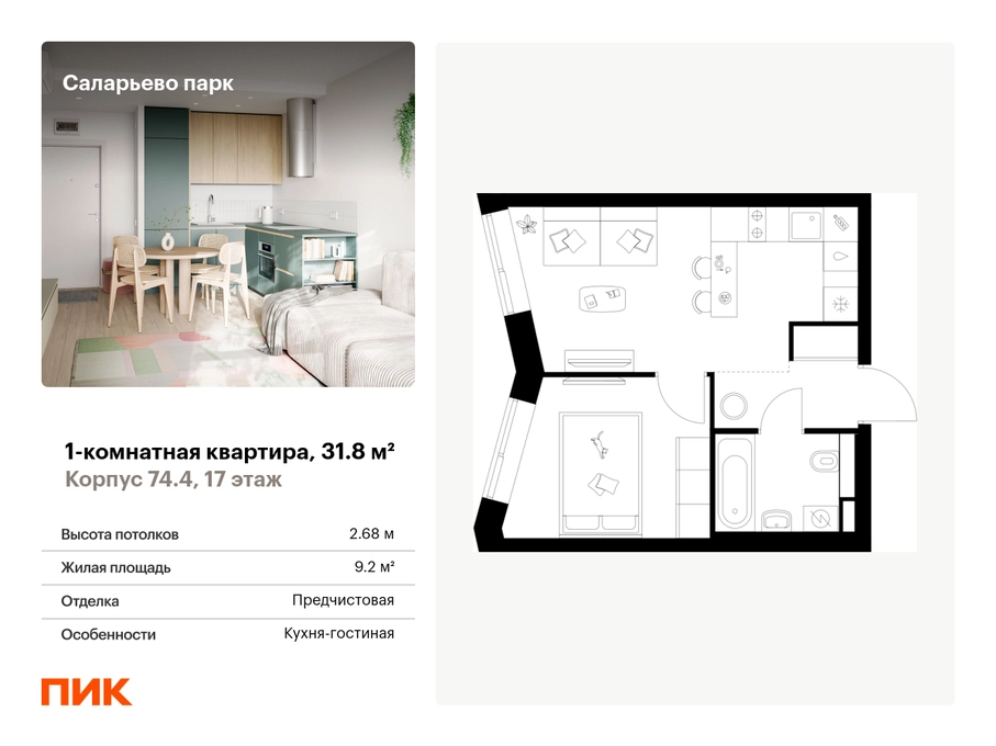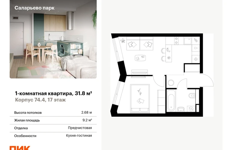 Продаётся 1-комн.квартира площадью 31.80 кв.м на 17 этаже 18 этажного дома (Корпус 74.4, секция 4) проекта ПИК Саларьево парк. Светлый просторный подъезд на уровне земли, функциональная планировка, большие окна, с отделкой. <br> <br>Жилой район «Саларьево парк» расположен в Новой Москве, в четырёх километрах от МКАД по Киевскому шоссе. Две станции метро: «Саларьево» и «Филатов луг» — находятся в пешей доступности от проекта. Дойти до них можно за 5–10 минут. В квартале уже создана качественная среда, где есть абсолютно всё для полноценной жизни, работы и отдыха. <br> <br>«Саларьево парк» — не просто квартал, а полноценный жилой район, который отличается разноплановой архитектурой. Над концепцией квартала работали несколько ведущих архитектурных бюро, которые стремились добиться разнообразия в фасадных решениях. Ярким примером такого подхода станет корпус 83, который относится к «Серии плюс». <br> <br>Новый корпус 83 был создан по принципам южной архитектуры: расслабленный и лаконичный силуэт зданий, привлекающий к себе внимание. Архитектурная изюминка 83-го корпуса — террасы и фигурные балконы. Вместе с окнами и другими акцентными элементами они создают уникальный облик здания, отсылая нас к изысканной южной архитектуре. <br> <br>Все корпуса в квартале гармонично сочетаются, образуя единую городскую среду. Здесь приятно гулять и проводить время на улице всей семьёй. <br> <br>В «Саларьево парке» создана уникальная образовательная среда, включающая в себя шесть школ, рассчитанных на 6 250 учеников. Две из них уже открыты, их посещает 2 300 детей. Также на территории «Саларьево парка» находится 12 детских садов, один из которых с бассейном. Сейчас уже открыты 7 садов. <br> <br>В «Саларьево парке» открыта уникальная игровая площадка — PlayHub «Оригами». Здесь есть ручей, горка-труба и рельефные холмы. Взрослые смогут отдохнуть в уютном кафе, пока дети играют. Также на территории проекта есть SportHub — большая спортивная зона, разделённая по интересам и возрастам. Здесь можно заниматься разными видами спорта: футболом, баскетболом, волейболом и стритболом. Зимой центральную часть площадки превращают в каток. <br> <br>Во дворах-парках жилого квартала есть места для отдыха, детские и спортивные площадки. На первых этажах домов расположены магазины, кафе и полезные сервисы. Также вблизи проекта есть несколько масштабных торговых центров. До ТЦ «Саларис» пять минут пешком, до «Рио», Metro Cash & Carry и «Леруа Мерлен» — пять минут на автомобиле. Артикул - 1006614О застройщике