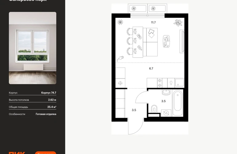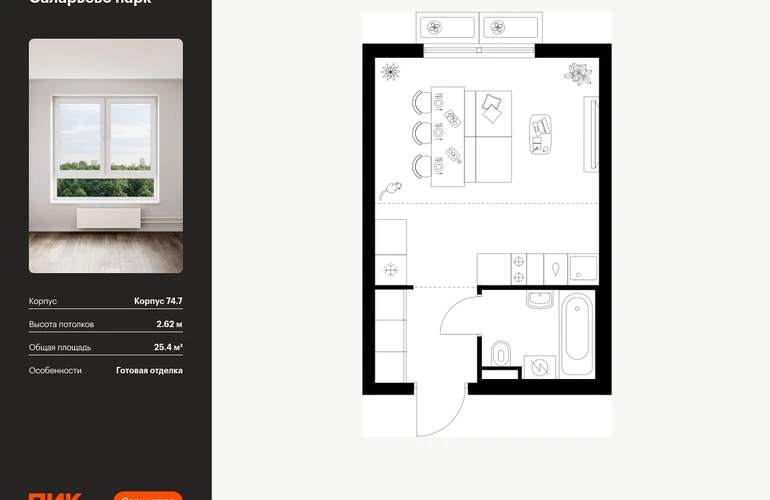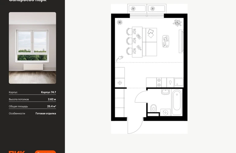 Продаётся квартира-студия площадью 25.40 кв.м на 3 этаже 16 этажного дома (Корпус 74.7, секция 7) проекта ПИК Саларьево парк. Светлый просторный подъезд на уровне земли, функциональная планировка, большие окна, с отделкой. Жилой район «Саларьево парк» расположен в Новой Москве, в четырёх километрах от МКАД по Киевскому шоссе. Две станции метро: «Саларьево» и «Филатов луг» — находятся в пешей доступности от проекта. Дойти до них можно за 5–10 минут. В квартале уже создана качественная среда, где есть абсолютно всё для полноценной жизни, работы и отдыха. «Саларьево парк» — не просто квартал, а полноценный жилой район, который отличается разноплановой архитектурой. Над концепцией квартала работали несколько ведущих архитектурных бюро, которые стремились добиться разнообразия в фасадных решениях. Ярким примером такого подхода станет корпус 83, который относится к «Серии плюс». Новый корпус 83 был создан по принципам южной архитектуры: расслабленный и лаконичный силуэт зданий, привлекающий к себе внимание. Архитектурная изюминка 83-го корпуса — террасы и фигурные балконы. Вместе с окнами и другими акцентными элементами они создают уникальный облик здания, отсылая нас к изысканной южной архитектуре. Все корпуса в квартале гармонично сочетаются, образуя единую городскую среду. Здесь приятно гулять и проводить время на улице всей семьёй. В «Саларьево парке» создана уникальная образовательная среда, включающая в себя шесть школ, рассчитанных на 6 250 учеников. Две из них уже открыты, их посещает 2 300 детей. Также на территории «Саларьево парка» находится 12 детских садов, один из которых с бассейном. Сейчас уже открыты 7 садов. В «Саларьево парке» открыта уникальная игровая площадка — PlayHub «Оригами». Здесь есть ручей, горка-труба и рельефные холмы. Взрослые смогут отдохнуть в уютном кафе, пока дети играют. Также на территории проекта есть SportHub — большая спортивная зона, разделённая по интересам и возрастам. Здесь можно заниматься разными видами спорта: футболом, баскетболом, волейболом и стритболом. Зимой центральную часть площадки превращают в каток. Во дворах-парках жилого квартала есть места для отдыха, детские и спортивные площадки. На первых этажах домов расположены магазины, кафе и полезные сервисы. Также вблизи проекта есть несколько масштабных торговых центров. До ТЦ «Саларис» пять минут пешком, до «Рио», Metro Cash & Carry и «Лемана про» — пять минут на автомобиле. Артикул - 1006986О застройщике