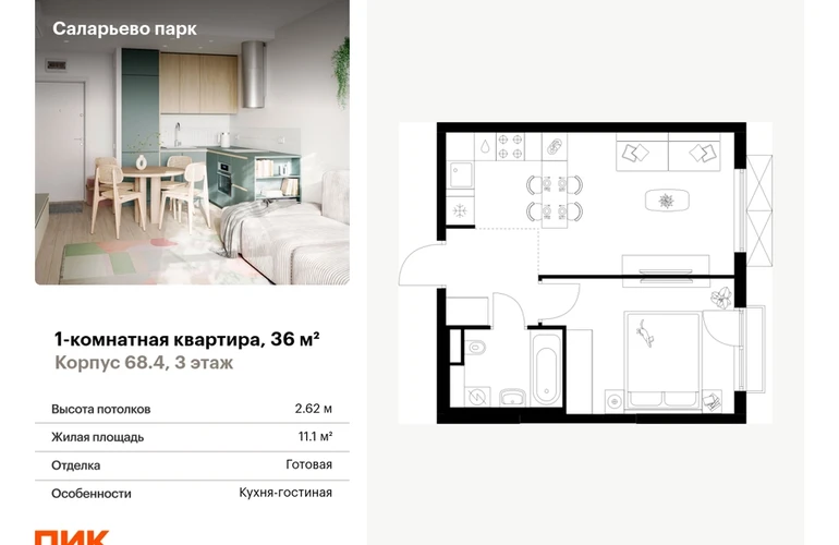 Продаётся 1-комн.квартира площадью 36.00 кв.м на 3 этаже 24 этажного дома (Корпус 68.4, секция 1) проекта ПИК Саларьево парк. Светлый просторный подъезд на уровне земли, функциональная планировка, большие окна, с отделкой. <br> <br>Жилой район «Саларьево парк» расположен в Новой Москве, в четырёх километрах от МКАД по Киевскому шоссе. Две станции метро: «Саларьево» и «Филатов луг» — находятся в пешей доступности от проекта. Дойти до них можно за 5–10 минут. В квартале уже создана качественная среда, где есть абсолютно всё для полноценной жизни, работы и отдыха. <br> <br>«Саларьево парк» — не просто квартал, а полноценный жилой район, который отличается разноплановой архитектурой. Над концепцией квартала работали несколько ведущих архитектурных бюро, которые стремились добиться разнообразия в фасадных решениях. Ярким примером такого подхода станет корпус 83, который относится к «Серии плюс». <br> <br>Новый корпус 83 был создан по принципам южной архитектуры: расслабленный и лаконичный силуэт зданий, привлекающий к себе внимание. Архитектурная изюминка 83-го корпуса — террасы и фигурные балконы. Вместе с окнами и другими акцентными элементами они создают уникальный облик здания, отсылая нас к изысканной южной архитектуре. <br> <br>Все корпуса в квартале гармонично сочетаются, образуя единую городскую среду. Здесь приятно гулять и проводить время на улице всей семьёй. <br> <br>В «Саларьево парке» создана уникальная образовательная среда, включающая в себя шесть школ, рассчитанных на 6 250 учеников. Две из них уже открыты, их посещает 2 300 детей. Также на территории «Саларьево парка» находится 12 детских садов, один из которых с бассейном. Сейчас уже открыты 7 садов. <br> <br>В «Саларьево парке» открыта уникальная игровая площадка — PlayHub «Оригами». Здесь есть ручей, горка-труба и рельефные холмы. Взрослые смогут отдохнуть в уютном кафе, пока дети играют. Также на территории проекта есть SportHub — большая спортивная зона, разделённая по интересам и возрастам. Здесь можно заниматься разными видами спорта: футболом, баскетболом, волейболом и стритболом. Зимой центральную часть площадки превращают в каток. <br> <br>Во дворах-парках жилого квартала есть места для отдыха, детские и спортивные площадки. На первых этажах домов расположены магазины, кафе и полезные сервисы. Также вблизи проекта есть несколько масштабных торговых центров. До ТЦ «Саларис» пять минут пешком, до «Рио», Metro Cash & Carry и «Леруа Мерлен» — пять минут на автомобиле. Артикул - 866997О застройщике
