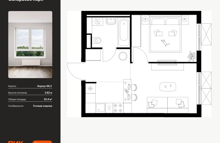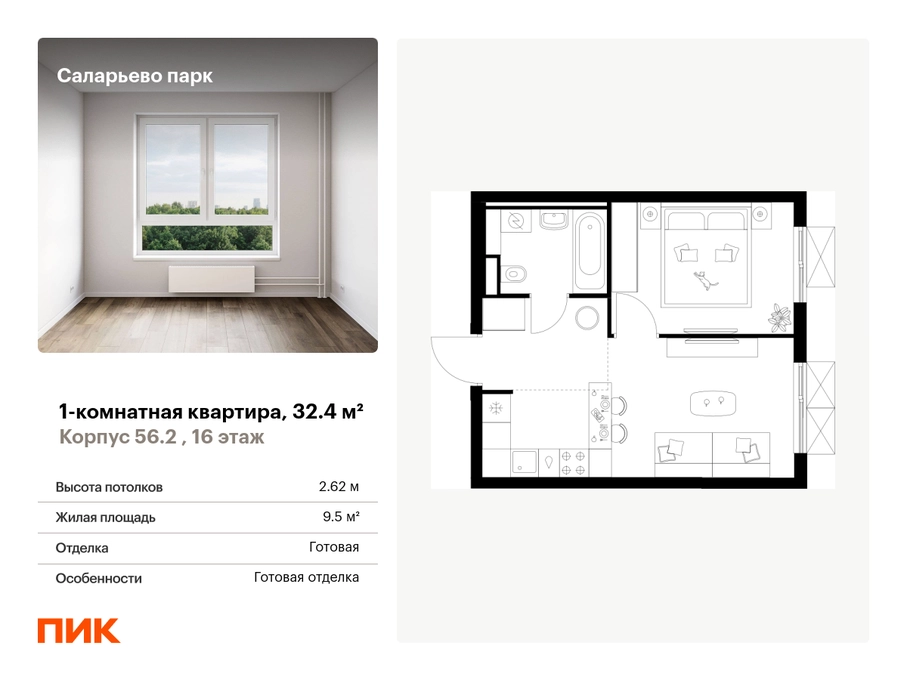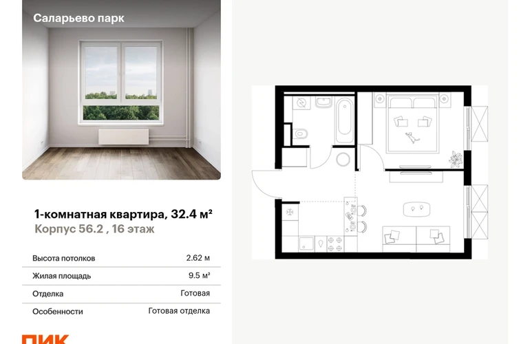 Продаётся 1-комн.квартира площадью 32.40 кв.м на 16 этаже 22 этажного дома (Корпус 56.2 , секция 3) проекта ПИК Саларьево парк. Светлый просторный подъезд на уровне земли, функциональная планировка, большие окна, с отделкой. <br> <br>Жилой район «Саларьево парк» расположен в Новой Москве, в четырёх километрах от МКАД по Киевскому шоссе. Две станции метро: «Саларьево» и «Филатов луг» — находятся в пешей доступности от проекта. Дойти до них можно за 5–10 минут. В квартале уже создана качественная среда, где есть абсолютно всё для полноценной жизни, работы и отдыха. <br> <br>«Саларьево парк» — не просто квартал, а полноценный жилой район, который отличается разноплановой архитектурой. Над концепцией квартала работали несколько ведущих архитектурных бюро, которые стремились добиться разнообразия в фасадных решениях. Ярким примером такого подхода станет корпус 83, который относится к «Серии плюс». <br> <br>Новый корпус 83 был создан по принципам южной архитектуры: расслабленный и лаконичный силуэт зданий, привлекающий к себе внимание. Архитектурная изюминка 83-го корпуса — террасы и фигурные балконы. Вместе с окнами и другими акцентными элементами они создают уникальный облик здания, отсылая нас к изысканной южной архитектуре. <br> <br>Все корпуса в квартале гармонично сочетаются, образуя единую городскую среду. Здесь приятно гулять и проводить время на улице всей семьёй. <br> <br>В «Саларьево парке» создана уникальная образовательная среда, включающая в себя шесть школ, рассчитанных на 6 250 учеников. Две из них уже открыты, их посещает 2 300 детей. Также на территории «Саларьево парка» находится 12 детских садов, один из которых с бассейном. Сейчас уже открыты 7 садов. <br> <br>В «Саларьево парке» открыта уникальная игровая площадка — PlayHub «Оригами». Здесь есть ручей, горка-труба и рельефные холмы. Взрослые смогут отдохнуть в уютном кафе, пока дети играют. Также на территории проекта есть SportHub — большая спортивная зона, разделённая по интересам и возрастам. Здесь можно заниматься разными видами спорта: футболом, баскетболом, волейболом и стритболом. Зимой центральную часть площадки превращают в каток. <br> <br>Во дворах-парках жилого квартала есть места для отдыха, детские и спортивные площадки. На первых этажах домов расположены магазины, кафе и полезные сервисы. Также вблизи проекта есть несколько масштабных торговых центров. До ТЦ «Саларис» пять минут пешком, до «Рио», Metro Cash & Carry и «Лемана про» — пять минут на автомобиле. Артикул - 990615О застройщике