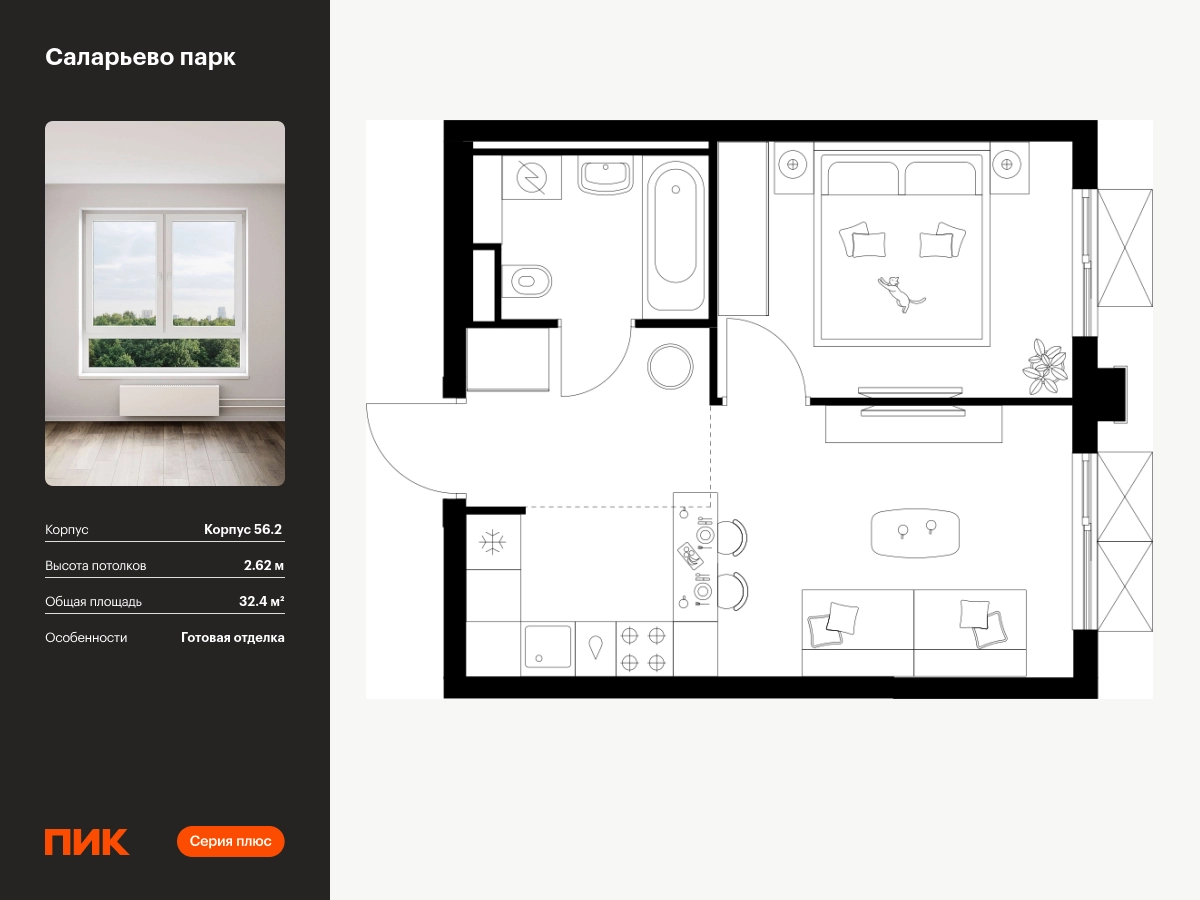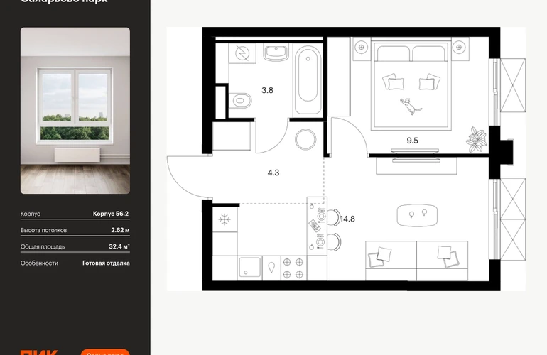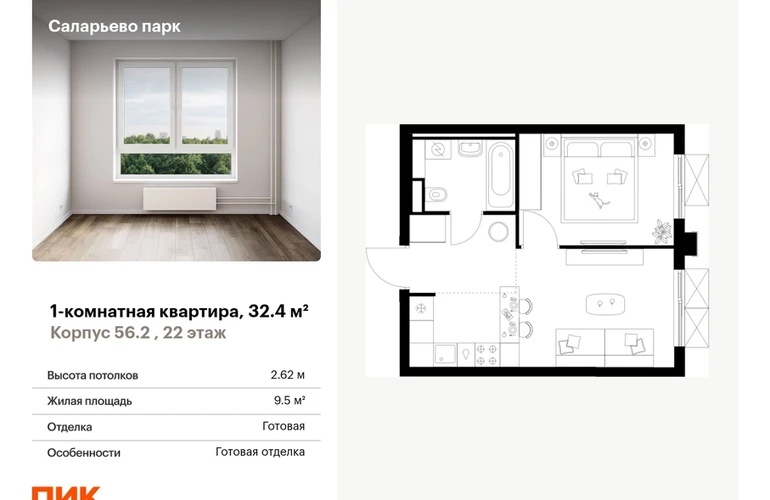 Продаётся 1-комн.квартира площадью 32.40 кв.м на 22 этаже 22 этажного дома (Корпус 56.2 , секция 3) проекта ПИК Саларьево парк. Светлый просторный подъезд на уровне земли, функциональная планировка, большие окна, с отделкой. <br> <br>Жилой район «Саларьево парк» расположен в Новой Москве, в четырёх километрах от МКАД по Киевскому шоссе. Две станции метро: «Саларьево» и «Филатов луг» — находятся в пешей доступности от проекта. Дойти до них можно за 5–10 минут. В квартале уже создана качественная среда, где есть абсолютно всё для полноценной жизни, работы и отдыха. <br> <br>«Саларьево парк» — не просто квартал, а полноценный жилой район, который отличается разноплановой архитектурой. Над концепцией квартала работали несколько ведущих архитектурных бюро, которые стремились добиться разнообразия в фасадных решениях. Ярким примером такого подхода станет корпус 83, который относится к «Серии плюс». <br> <br>Новый корпус 83 был создан по принципам южной архитектуры: расслабленный и лаконичный силуэт зданий, привлекающий к себе внимание. Архитектурная изюминка 83-го корпуса — террасы и фигурные балконы. Вместе с окнами и другими акцентными элементами они создают уникальный облик здания, отсылая нас к изысканной южной архитектуре. <br> <br>Все корпуса в квартале гармонично сочетаются, образуя единую городскую среду. Здесь приятно гулять и проводить время на улице всей семьёй. <br> <br>В «Саларьево парке» создана уникальная образовательная среда, включающая в себя шесть школ, рассчитанных на 6 250 учеников. Две из них уже открыты, их посещает 2 300 детей. Также на территории «Саларьево парка» находится 12 детских садов, один из которых с бассейном. Сейчас уже открыты 7 садов. <br> <br>В «Саларьево парке» открыта уникальная игровая площадка — PlayHub «Оригами». Здесь есть ручей, горка-труба и рельефные холмы. Взрослые смогут отдохнуть в уютном кафе, пока дети играют. Также на территории проекта есть SportHub — большая спортивная зона, разделённая по интересам и возрастам. Здесь можно заниматься разными видами спорта: футболом, баскетболом, волейболом и стритболом. Зимой центральную часть площадки превращают в каток. <br> <br>Во дворах-парках жилого квартала есть места для отдыха, детские и спортивные площадки. На первых этажах домов расположены магазины, кафе и полезные сервисы. Также вблизи проекта есть несколько масштабных торговых центров. До ТЦ «Саларис» пять минут пешком, до «Рио», Metro Cash & Carry и «Лемана про» — пять минут на автомобиле. Артикул - 990806О застройщике