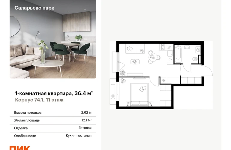 Продаётся 1-комн.квартира площадью 36.40 кв.м на 11 этаже 18 этажного дома (Корпус 74.1, секция 1) проекта ПИК Саларьево парк. Светлый просторный подъезд на уровне земли, функциональная планировка, большие окна, с отделкой. Артикул - 1006156О застройщике