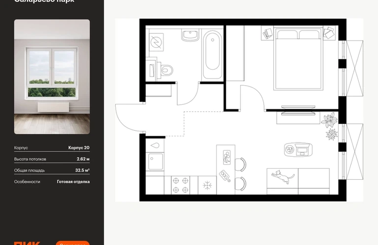 Продаётся 1-комн.квартира площадью 32.50 кв.м на 10 этаже 16 этажного дома (Корпус 20, секция 2) проекта ПИК Саларьево парк. Светлый просторный подъезд на уровне земли, функциональная планировка, большие окна, с отделкой. <br> <br>Жилой район «Саларьево парк» расположен в Новой Москве, в четырёх километрах от МКАД по Киевскому шоссе. Две станции метро: «Саларьево» и «Филатов луг» — находятся в пешей доступности от проекта. Дойти до них можно за 5–10 минут. В квартале уже создана качественная среда, где есть абсолютно всё для полноценной жизни, работы и отдыха. <br> <br>«Саларьево парк» — не просто квартал, а полноценный жилой район, который отличается разноплановой архитектурой. Над концепцией квартала работали несколько ведущих архитектурных бюро, которые стремились добиться разнообразия в фасадных решениях. Ярким примером такого подхода станет корпус 83, который относится к «Серии плюс». <br> <br>Новый корпус 83 был создан по принципам южной архитектуры: расслабленный и лаконичный силуэт зданий, привлекающий к себе внимание. Архитектурная изюминка 83-го корпуса — террасы и фигурные балконы. Вместе с окнами и другими акцентными элементами они создают уникальный облик здания, отсылая нас к изысканной южной архитектуре. <br> <br>Все корпуса в квартале гармонично сочетаются, образуя единую городскую среду. Здесь приятно гулять и проводить время на улице всей семьёй. <br> <br>В «Саларьево парке» создана уникальная образовательная среда, включающая в себя шесть школ, рассчитанных на 6 250 учеников. Две из них уже открыты, их посещает 2 300 детей. Также на территории «Саларьево парка» находится 12 детских садов, один из которых с бассейном. Сейчас уже открыты 7 садов. <br> <br>В «Саларьево парке» открыта уникальная игровая площадка — PlayHub «Оригами». Здесь есть ручей, горка-труба и рельефные холмы. Взрослые смогут отдохнуть в уютном кафе, пока дети играют. Также на территории проекта есть SportHub — большая спортивная зона, разделённая по интересам и возрастам. Здесь можно заниматься разными видами спорта: футболом, баскетболом, волейболом и стритболом. Зимой центральную часть площадки превращают в каток. <br> <br>Во дворах-парках жилого квартала есть места для отдыха, детские и спортивные площадки. На первых этажах домов расположены магазины, кафе и полезные сервисы. Также вблизи проекта есть несколько масштабных торговых центров. До ТЦ «Саларис» пять минут пешком, до «Рио», Metro Cash & Carry и «Лемана про» — пять минут на автомобиле. Артикул - 946919О застройщике