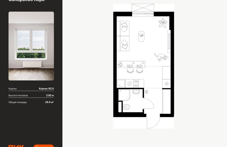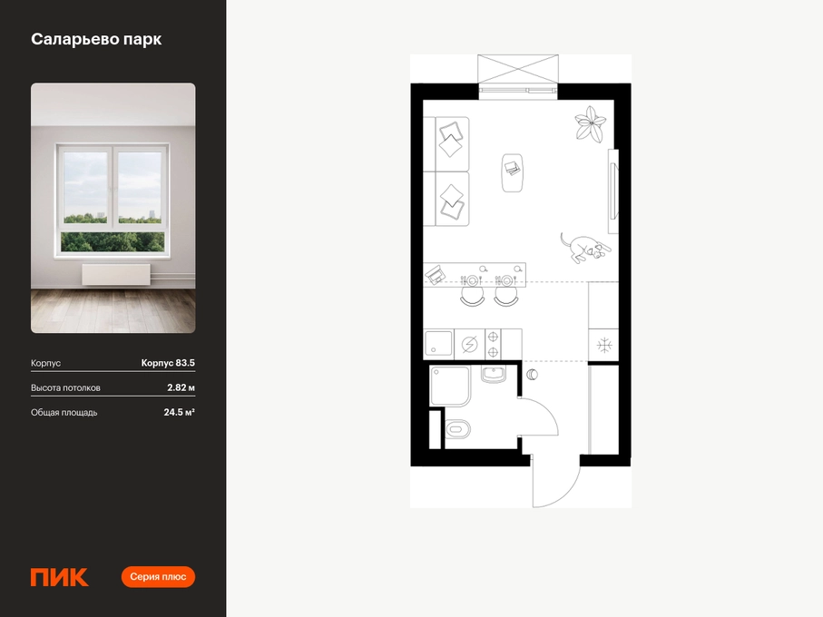 Продаётся квартира-студия площадью 24.50 кв.м на 4 этаже 16 этажного дома (Корпус 83.5, секция 5) проекта ПИК Саларьево парк. Светлый просторный подъезд на уровне земли, функциональная планировка, большие окна. <br> <br>Жилой район «Саларьево парк» расположен в Новой Москве, в четырёх километрах от МКАД по Киевскому шоссе. Две станции метро: «Саларьево» и «Филатов луг» — находятся в пешей доступности от проекта. Дойти до них можно за 5–10 минут. В квартале уже создана качественная среда, где есть абсолютно всё для полноценной жизни, работы и отдыха. <br> <br>«Саларьево парк» — не просто квартал, а полноценный жилой район, который отличается разноплановой архитектурой. Над концепцией квартала работали несколько ведущих архитектурных бюро, которые стремились добиться разнообразия в фасадных решениях. Ярким примером такого подхода станет корпус 83, который относится к «Серии плюс». <br> <br>Новый корпус 83 был создан по принципам южной архитектуры: расслабленный и лаконичный силуэт зданий, привлекающий к себе внимание. Архитектурная изюминка 83-го корпуса — террасы и фигурные балконы. Вместе с окнами и другими акцентными элементами они создают уникальный облик здания, отсылая нас к изысканной южной архитектуре. <br> <br>Все корпуса в квартале гармонично сочетаются, образуя единую городскую среду. Здесь приятно гулять и проводить время на улице всей семьёй. <br> <br>В «Саларьево парке» создана уникальная образовательная среда, включающая в себя шесть школ, рассчитанных на 6 250 учеников. Две из них уже открыты, их посещает 2 300 детей. Также на территории «Саларьево парка» находится 12 детских садов, один из которых с бассейном. Сейчас уже открыты 7 садов. <br> <br>В «Саларьево парке» открыта уникальная игровая площадка — PlayHub «Оригами». Здесь есть ручей, горка-труба и рельефные холмы. Взрослые смогут отдохнуть в уютном кафе, пока дети играют. Также на территории проекта есть SportHub — большая спортивная зона, разделённая по интересам и возрастам. Здесь можно заниматься разными видами спорта: футболом, баскетболом, волейболом и стритболом. Зимой центральную часть площадки превращают в каток. <br> <br>Во дворах-парках жилого квартала есть места для отдыха, детские и спортивные площадки. На первых этажах домов расположены магазины, кафе и полезные сервисы. Также вблизи проекта есть несколько масштабных торговых центров. До ТЦ «Саларис» пять минут пешком, до «Рио», Metro Cash & Carry и «Лемана про» — пять минут на автомобиле. Артикул - 996724О застройщике