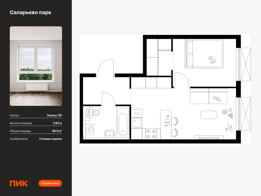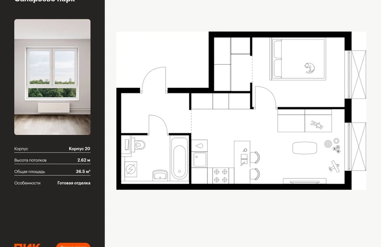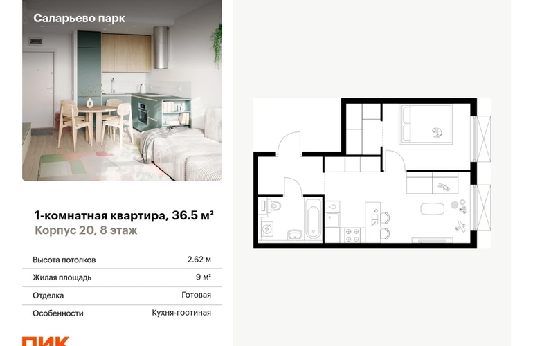 Продаётся 1-комн.квартира площадью 36.50 кв.м на 8 этаже 16 этажного дома (Корпус 20, секция 2) проекта ПИК Саларьево парк. Светлый просторный подъезд на уровне земли, функциональная планировка, большие окна, с отделкой. <br> <br>Жилой район «Саларьево парк» расположен в Новой Москве, в четырёх километрах от МКАД по Киевскому шоссе. Две станции метро: «Саларьево» и «Филатов луг» — находятся в пешей доступности от проекта. Дойти до них можно за 5–10 минут. В квартале уже создана качественная среда, где есть абсолютно всё для полноценной жизни, работы и отдыха. <br> <br>«Саларьево парк» — не просто квартал, а полноценный жилой район, который отличается разноплановой архитектурой. Над концепцией квартала работали несколько ведущих архитектурных бюро, которые стремились добиться разнообразия в фасадных решениях. Ярким примером такого подхода станет корпус 83, который относится к «Серии плюс». <br> <br>Новый корпус 83 был создан по принципам южной архитектуры: расслабленный и лаконичный силуэт зданий, привлекающий к себе внимание. Архитектурная изюминка 83-го корпуса — террасы и фигурные балконы. Вместе с окнами и другими акцентными элементами они создают уникальный облик здания, отсылая нас к изысканной южной архитектуре. <br> <br>Все корпуса в квартале гармонично сочетаются, образуя единую городскую среду. Здесь приятно гулять и проводить время на улице всей семьёй. <br> <br>В «Саларьево парке» создана уникальная образовательная среда, включающая в себя шесть школ, рассчитанных на 6 250 учеников. Две из них уже открыты, их посещает 2 300 детей. Также на территории «Саларьево парка» находится 12 детских садов, один из которых с бассейном. Сейчас уже открыты 7 садов. <br> <br>В «Саларьево парке» открыта уникальная игровая площадка — PlayHub «Оригами». Здесь есть ручей, горка-труба и рельефные холмы. Взрослые смогут отдохнуть в уютном кафе, пока дети играют. Также на территории проекта есть SportHub — большая спортивная зона, разделённая по интересам и возрастам. Здесь можно заниматься разными видами спорта: футболом, баскетболом, волейболом и стритболом. Зимой центральную часть площадки превращают в каток. <br> <br>Во дворах-парках жилого квартала есть места для отдыха, детские и спортивные площадки. На первых этажах домов расположены магазины, кафе и полезные сервисы. Также вблизи проекта есть несколько масштабных торговых центров. До ТЦ «Саларис» пять минут пешком, до «Рио», Metro Cash & Carry и «Лемана про» — пять минут на автомобиле. Артикул - 946898О застройщике