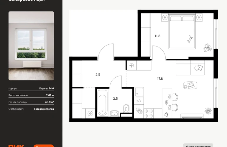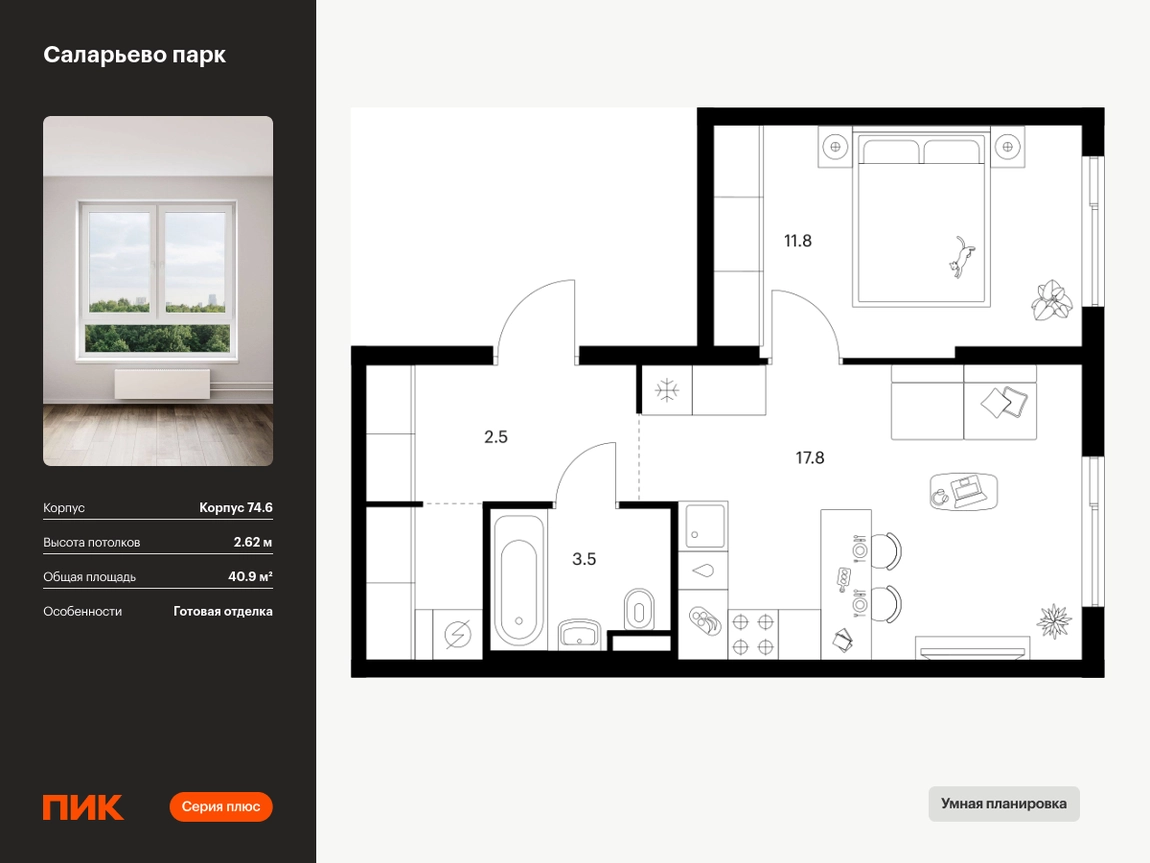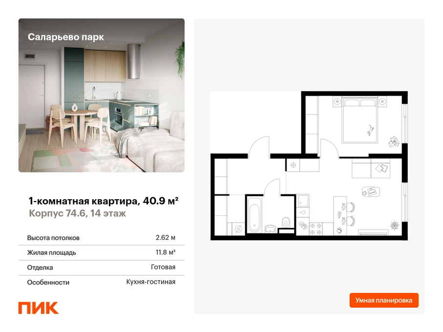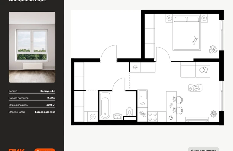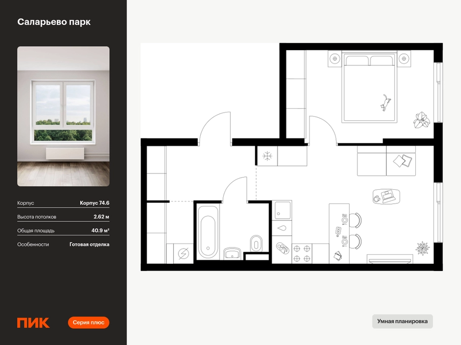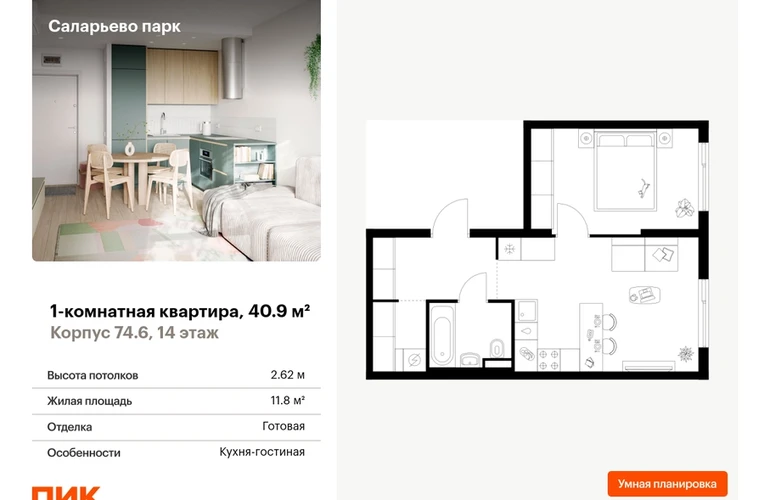 Продаётся 1-комн.квартира площадью 40.90 кв.м на 14 этаже 18 этажного дома (Корпус 74.6, секция 6) проекта ПИК Саларьево парк. Светлый просторный подъезд на уровне земли, функциональная планировка, большие окна, с отделкой. <br> <br>Жилой район «Саларьево парк» расположен в Новой Москве, в четырёх километрах от МКАД по Киевскому шоссе. Две станции метро: «Саларьево» и «Филатов луг» — находятся в пешей доступности от проекта. Дойти до них можно за 5–10 минут. В квартале уже создана качественная среда, где есть абсолютно всё для полноценной жизни, работы и отдыха. <br> <br>«Саларьево парк» — не просто квартал, а полноценный жилой район, который отличается разноплановой архитектурой. Над концепцией квартала работали несколько ведущих архитектурных бюро, которые стремились добиться разнообразия в фасадных решениях. Ярким примером такого подхода станет корпус 83, который относится к «Серии плюс». <br> <br>Новый корпус 83 был создан по принципам южной архитектуры: расслабленный и лаконичный силуэт зданий, привлекающий к себе внимание. Архитектурная изюминка 83-го корпуса — террасы и фигурные балконы. Вместе с окнами и другими акцентными элементами они создают уникальный облик здания, отсылая нас к изысканной южной архитектуре. <br> <br>Все корпуса в квартале гармонично сочетаются, образуя единую городскую среду. Здесь приятно гулять и проводить время на улице всей семьёй. <br> <br>В «Саларьево парке» создана уникальная образовательная среда, включающая в себя шесть школ, рассчитанных на 6 250 учеников. Две из них уже открыты, их посещает 2 300 детей. Также на территории «Саларьево парка» находится 12 детских садов, один из которых с бассейном. Сейчас уже открыты 7 садов. <br> <br>В «Саларьево парке» открыта уникальная игровая площадка — PlayHub «Оригами». Здесь есть ручей, горка-труба и рельефные холмы. Взрослые смогут отдохнуть в уютном кафе, пока дети играют. Также на территории проекта есть SportHub — большая спортивная зона, разделённая по интересам и возрастам. Здесь можно заниматься разными видами спорта: футболом, баскетболом, волейболом и стритболом. Зимой центральную часть площадки превращают в каток. <br> <br>Во дворах-парках жилого квартала есть места для отдыха, детские и спортивные площадки. На первых этажах домов расположены магазины, кафе и полезные сервисы. Также вблизи проекта есть несколько масштабных торговых центров. До ТЦ «Саларис» пять минут пешком, до «Рио», Metro Cash & Carry и «Лемана про» — пять минут на автомобиле. Артикул - 1006925О застройщике