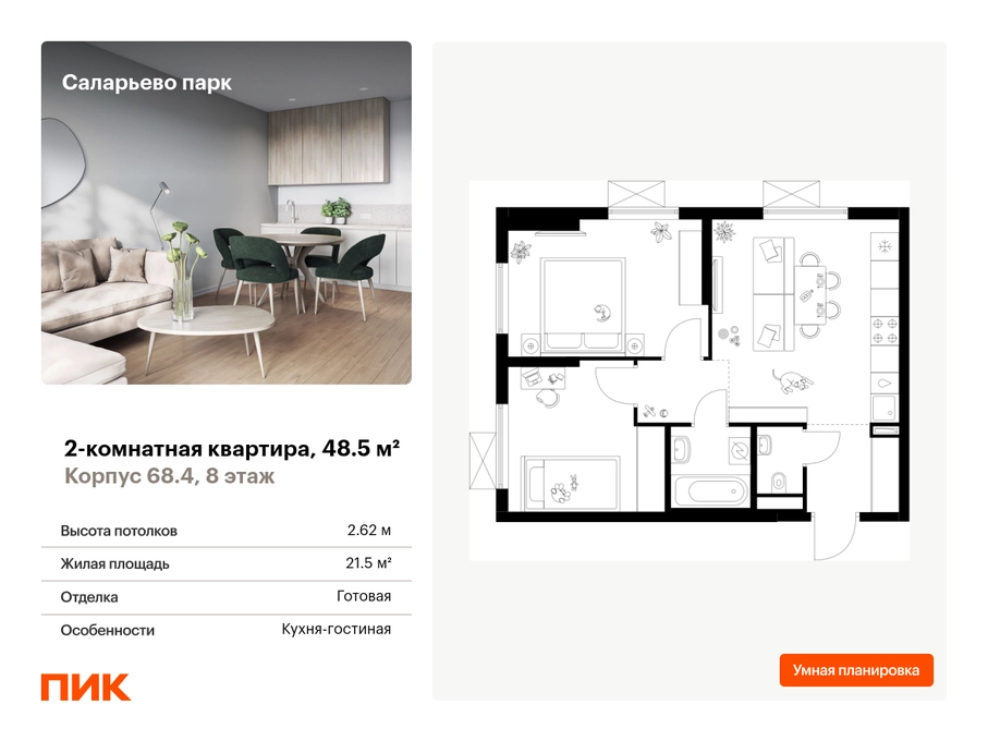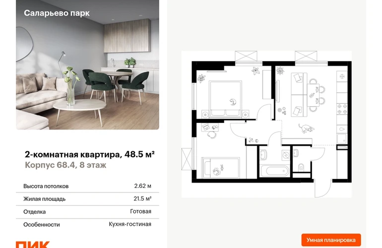 Продаётся 2-комн.квартира площадью 48.50 кв.м на 8 этаже 24 этажного дома (Корпус 68.4, секция 1) проекта ПИК Саларьево парк. Светлый просторный подъезд на уровне земли, функциональная планировка, большие окна, с отделкой. <br> <br>Жилой район «Саларьево парк» расположен в Новой Москве, в четырёх километрах от МКАД по Киевскому шоссе. Две станции метро: «Саларьево» и «Филатов луг» — находятся в пешей доступности от проекта. Дойти до них можно за 5–10 минут. В квартале уже создана качественная среда, где есть абсолютно всё для полноценной жизни, работы и отдыха. <br> <br>«Саларьево парк» — не просто квартал, а полноценный жилой район, который отличается разноплановой архитектурой. Над концепцией квартала работали несколько ведущих архитектурных бюро, которые стремились добиться разнообразия в фасадных решениях. Ярким примером такого подхода станет корпус 83, который относится к «Серии плюс». <br> <br>Новый корпус 83 был создан по принципам южной архитектуры: расслабленный и лаконичный силуэт зданий, привлекающий к себе внимание. Архитектурная изюминка 83-го корпуса — террасы и фигурные балконы. Вместе с окнами и другими акцентными элементами они создают уникальный облик здания, отсылая нас к изысканной южной архитектуре. <br> <br>Все корпуса в квартале гармонично сочетаются, образуя единую городскую среду. Здесь приятно гулять и проводить время на улице всей семьёй. <br> <br>В «Саларьево парке» создана уникальная образовательная среда, включающая в себя шесть школ, рассчитанных на 6 250 учеников. Две из них уже открыты, их посещает 2 300 детей. Также на территории «Саларьево парка» находится 12 детских садов, один из которых с бассейном. Сейчас уже открыты 7 садов. <br> <br>В «Саларьево парке» открыта уникальная игровая площадка — PlayHub «Оригами». Здесь есть ручей, горка-труба и рельефные холмы. Взрослые смогут отдохнуть в уютном кафе, пока дети играют. Также на территории проекта есть SportHub — большая спортивная зона, разделённая по интересам и возрастам. Здесь можно заниматься разными видами спорта: футболом, баскетболом, волейболом и стритболом. Зимой центральную часть площадки превращают в каток. <br> <br>Во дворах-парках жилого квартала есть места для отдыха, детские и спортивные площадки. На первых этажах домов расположены магазины, кафе и полезные сервисы. Также вблизи проекта есть несколько масштабных торговых центров. До ТЦ «Саларис» пять минут пешком, до «Рио», Metro Cash & Carry и «Лемана про» — пять минут на автомобиле. Артикул - 867074О застройщике