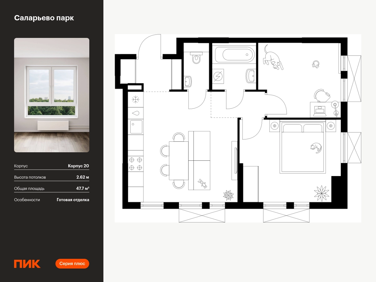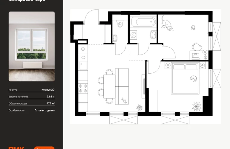 Продаётся 2-комн.квартира площадью 47.70 кв.м на 12 этаже 17 этажного дома (Корпус 20, секция 1) проекта ПИК Саларьево парк. Светлый просторный подъезд на уровне земли, функциональная планировка, большие окна, с отделкой. Артикул - 946754О застройщике