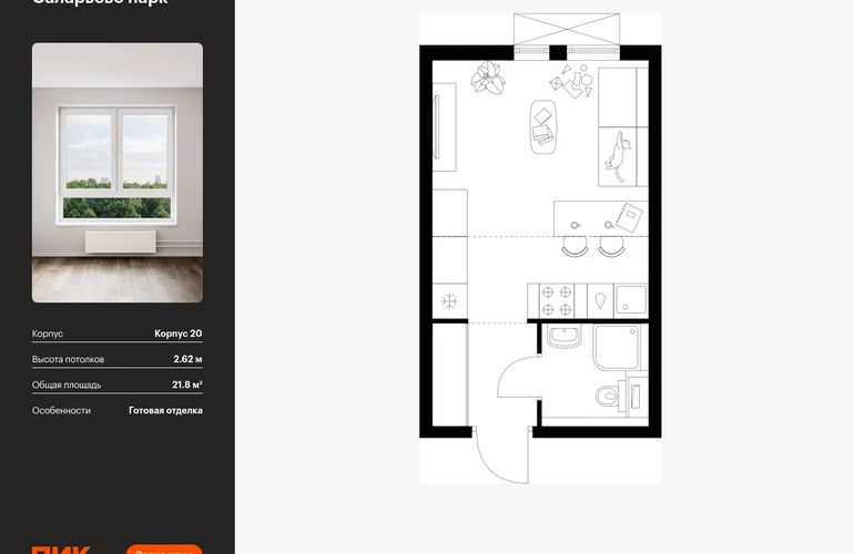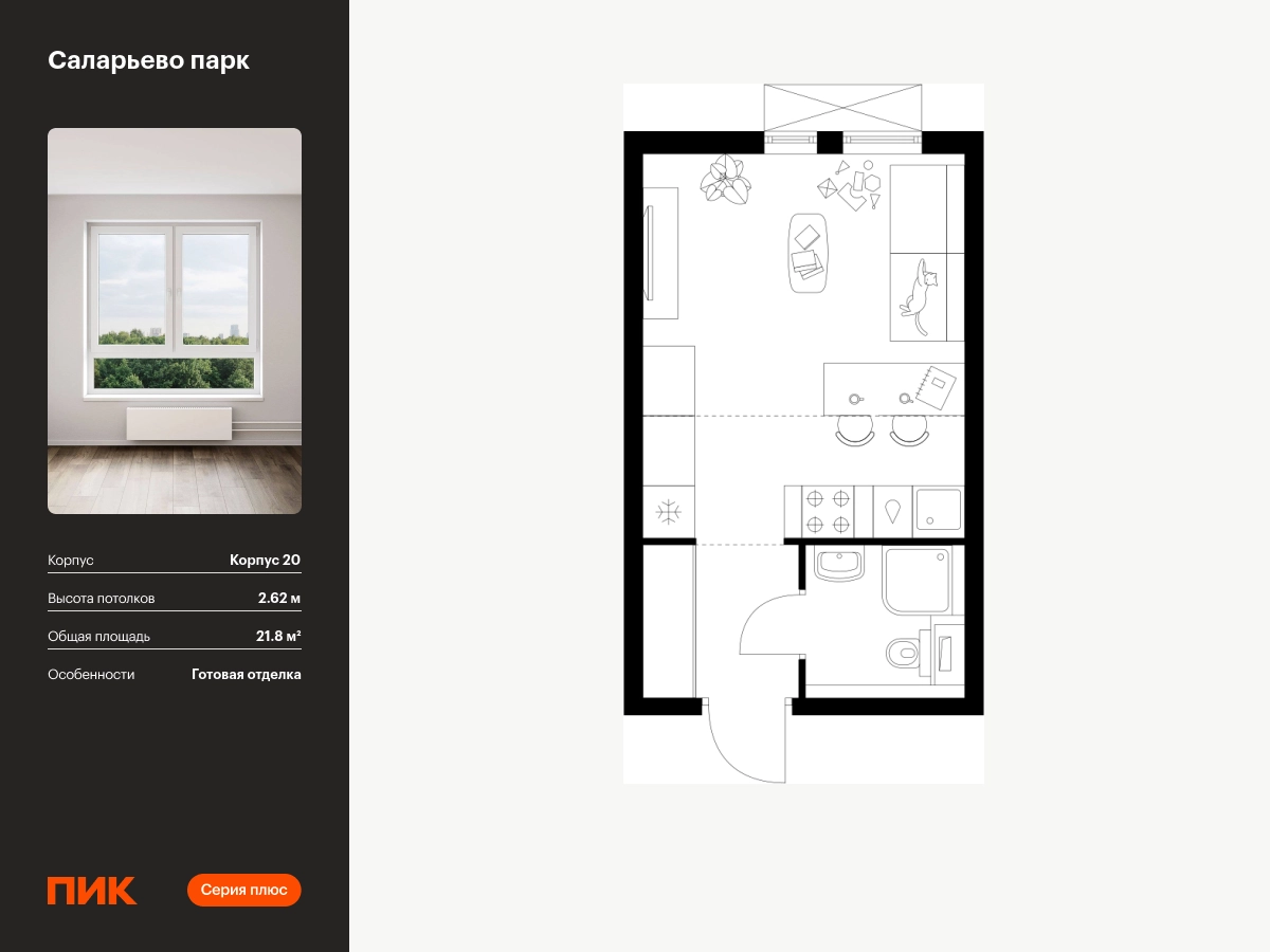Продаётся квартира-студия площадью 21.80 кв.м на 11 этаже 16 этажного дома (Корпус 20, секция 2) проекта ПИК Саларьево парк. Светлый просторный подъезд на уровне земли, функциональная планировка, большие окна, с отделкой. <br> <br>Жилой район «Саларьево парк» расположен в Новой Москве, в четырёх километрах от МКАД по Киевскому шоссе. Две станции метро: «Саларьево» и «Филатов луг» — находятся в пешей доступности от проекта. Дойти до них можно за 5–10 минут. В квартале уже создана качественная среда, где есть абсолютно всё для полноценной жизни, работы и отдыха. <br> <br>«Саларьево парк» — не просто квартал, а полноценный жилой район, который отличается разноплановой архитектурой. Над концепцией квартала работали несколько ведущих архитектурных бюро, которые стремились добиться разнообразия в фасадных решениях. Ярким примером такого подхода станет корпус 83, который относится к «Серии плюс». <br> <br>Новый корпус 83 был создан по принципам южной архитектуры: расслабленный и лаконичный силуэт зданий, привлекающий к себе внимание. Архитектурная изюминка 83-го корпуса — террасы и фигурные балконы. Вместе с окнами и другими акцентными элементами они создают уникальный облик здания, отсылая нас к изысканной южной архитектуре. <br> <br>Все корпуса в квартале гармонично сочетаются, образуя единую городскую среду. Здесь приятно гулять и проводить время на улице всей семьёй. <br> <br>В «Саларьево парке» создана уникальная образовательная среда, включающая в себя шесть школ, рассчитанных на 6 250 учеников. Две из них уже открыты, их посещает 2 300 детей. Также на территории «Саларьево парка» находится 12 детских садов, один из которых с бассейном. Сейчас уже открыты 7 садов. <br> <br>В «Саларьево парке» открыта уникальная игровая площадка — PlayHub «Оригами». Здесь есть ручей, горка-труба и рельефные холмы. Взрослые смогут отдохнуть в уютном кафе, пока дети играют. Также на территории проекта есть SportHub — большая спортивная зона, разделённая по интересам и возрастам. Здесь можно заниматься разными видами спорта: футболом, баскетболом, волейболом и стритболом. Зимой центральную часть площадки превращают в каток. <br> <br>Во дворах-парках жилого квартала есть места для отдыха, детские и спортивные площадки. На первых этажах домов расположены магазины, кафе и полезные сервисы. Также вблизи проекта есть несколько масштабных торговых центров. До ТЦ «Саларис» пять минут пешком, до «Рио», Metro Cash & Carry и «Лемана про» — пять минут на автомобиле. Артикул - 946937О застройщике