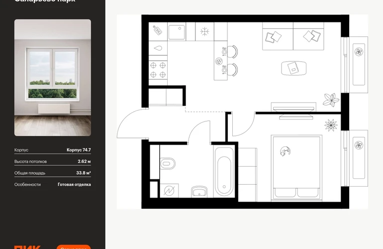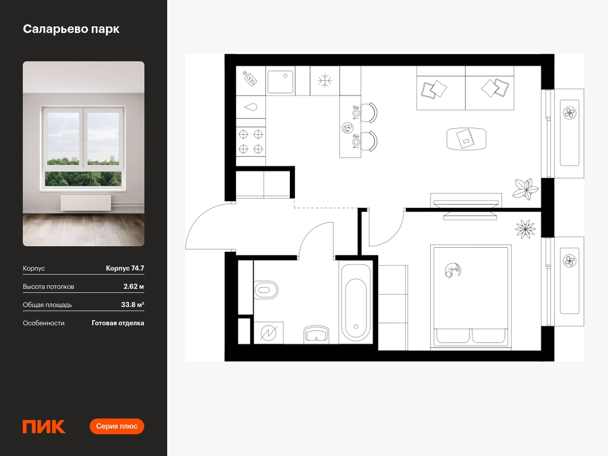 Продаётся 1-комн.квартира площадью 33.80 кв.м на 8 этаже 16 этажного дома (Корпус 74.7, секция 7) проекта ПИК Саларьево парк. Светлый просторный подъезд на уровне земли, функциональная планировка, большие окна, с отделкой. Жилой район «Саларьево парк» расположен в Новой Москве, в четырёх километрах от МКАД по Киевскому шоссе. Две станции метро: «Саларьево» и «Филатов луг» — находятся в пешей доступности от проекта. Дойти до них можно за 5–10 минут. В квартале уже создана качественная среда, где есть абсолютно всё для полноценной жизни, работы и отдыха. «Саларьево парк» — не просто квартал, а полноценный жилой район, который отличается разноплановой архитектурой. Над концепцией квартала работали несколько ведущих архитектурных бюро, которые стремились добиться разнообразия в фасадных решениях. Ярким примером такого подхода станет корпус 83, который относится к «Серии плюс». Новый корпус 83 был создан по принципам южной архитектуры: расслабленный и лаконичный силуэт зданий, привлекающий к себе внимание. Архитектурная изюминка 83-го корпуса — террасы и фигурные балконы. Вместе с окнами и другими акцентными элементами они создают уникальный облик здания, отсылая нас к изысканной южной архитектуре. Все корпуса в квартале гармонично сочетаются, образуя единую городскую среду. Здесь приятно гулять и проводить время на улице всей семьёй. В «Саларьево парке» создана уникальная образовательная среда, включающая в себя шесть школ, рассчитанных на 6 250 учеников. Две из них уже открыты, их посещает 2 300 детей. Также на территории «Саларьево парка» находится 12 детских садов, один из которых с бассейном. Сейчас уже открыты 7 садов. В «Саларьево парке» открыта уникальная игровая площадка — PlayHub «Оригами». Здесь есть ручей, горка-труба и рельефные холмы. Взрослые смогут отдохнуть в уютном кафе, пока дети играют. Также на территории проекта есть SportHub — большая спортивная зона, разделённая по интересам и возрастам. Здесь можно заниматься разными видами спорта: футболом, баскетболом, волейболом и стритболом. Зимой центральную часть площадки превращают в каток. Во дворах-парках жилого квартала есть места для отдыха, детские и спортивные площадки. На первых этажах домов расположены магазины, кафе и полезные сервисы. Также вблизи проекта есть несколько масштабных торговых центров. До ТЦ «Саларис» пять минут пешком, до «Рио», Metro Cash & Carry и «Лемана про» — пять минут на автомобиле. Артикул - 1007057О застройщике