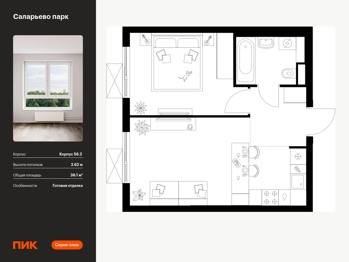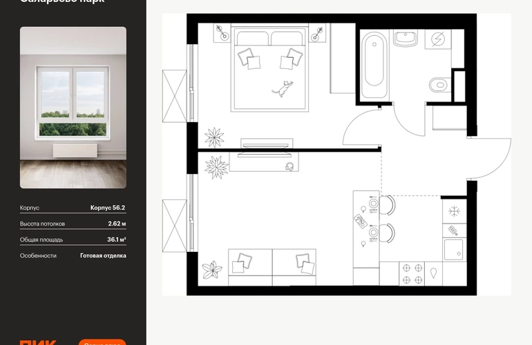 Продаётся 1-комн.квартира площадью 36.10 кв.м на 18 этаже 22 этажного дома (Корпус 56.2 , секция 1) проекта ПИК Саларьево парк. Светлый просторный подъезд на уровне земли, функциональная планировка, большие окна, с отделкой. <br> <br>Жилой район «Саларьево парк» расположен в Новой Москве, в четырёх километрах от МКАД по Киевскому шоссе. Две станции метро: «Саларьево» и «Филатов луг» — находятся в пешей доступности от проекта. Дойти до них можно за 5–10 минут. В квартале уже создана качественная среда, где есть абсолютно всё для полноценной жизни, работы и отдыха. <br> <br>«Саларьево парк» — не просто квартал, а полноценный жилой район, который отличается разноплановой архитектурой. Над концепцией квартала работали несколько ведущих архитектурных бюро, которые стремились добиться разнообразия в фасадных решениях. Ярким примером такого подхода станет корпус 83, который относится к «Серии плюс». <br> <br>Новый корпус 83 был создан по принципам южной архитектуры: расслабленный и лаконичный силуэт зданий, привлекающий к себе внимание. Архитектурная изюминка 83-го корпуса — террасы и фигурные балконы. Вместе с окнами и другими акцентными элементами они создают уникальный облик здания, отсылая нас к изысканной южной архитектуре. <br> <br>Все корпуса в квартале гармонично сочетаются, образуя единую городскую среду. Здесь приятно гулять и проводить время на улице всей семьёй. <br> <br>В «Саларьево парке» создана уникальная образовательная среда, включающая в себя шесть школ, рассчитанных на 6 250 учеников. Две из них уже открыты, их посещает 2 300 детей. Также на территории «Саларьево парка» находится 12 детских садов, один из которых с бассейном. Сейчас уже открыты 7 садов. <br> <br>В «Саларьево парке» открыта уникальная игровая площадка — PlayHub «Оригами». Здесь есть ручей, горка-труба и рельефные холмы. Взрослые смогут отдохнуть в уютном кафе, пока дети играют. Также на территории проекта есть SportHub — большая спортивная зона, разделённая по интересам и возрастам. Здесь можно заниматься разными видами спорта: футболом, баскетболом, волейболом и стритболом. Зимой центральную часть площадки превращают в каток. <br> <br>Во дворах-парках жилого квартала есть места для отдыха, детские и спортивные площадки. На первых этажах домов расположены магазины, кафе и полезные сервисы. Также вблизи проекта есть несколько масштабных торговых центров. До ТЦ «Саларис» пять минут пешком, до «Рио», Metro Cash & Carry и «Лемана про» — пять минут на автомобиле. Артикул - 990228О застройщике