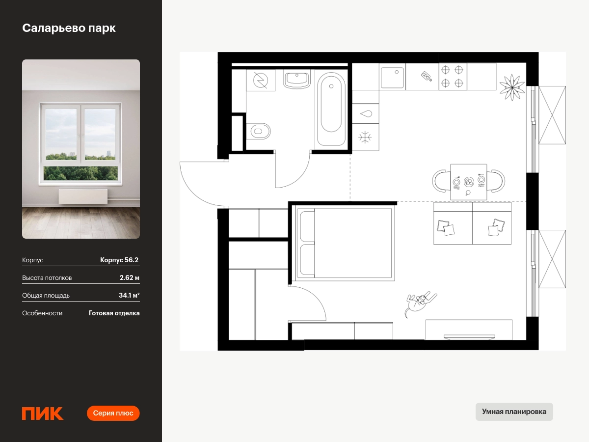 Продаётся 1-комн.квартира площадью 34.10 кв.м на 14 этаже 22 этажного дома (Корпус 56.2 , секция 1) проекта ПИК Саларьево парк. Светлый просторный подъезд на уровне земли, функциональная планировка, большие окна, с отделкой. <br> <br>Жилой район «Саларьево парк» расположен в Новой Москве, в четырёх километрах от МКАД по Киевскому шоссе. Две станции метро: «Саларьево» и «Филатов луг» — находятся в пешей доступности от проекта. Дойти до них можно за 5–10 минут. В квартале уже создана качественная среда, где есть абсолютно всё для полноценной жизни, работы и отдыха. <br> <br>«Саларьево парк» — не просто квартал, а полноценный жилой район, который отличается разноплановой архитектурой. Над концепцией квартала работали несколько ведущих архитектурных бюро, которые стремились добиться разнообразия в фасадных решениях. Ярким примером такого подхода станет корпус 83, который относится к «Серии плюс». <br> <br>Новый корпус 83 был создан по принципам южной архитектуры: расслабленный и лаконичный силуэт зданий, привлекающий к себе внимание. Архитектурная изюминка 83-го корпуса — террасы и фигурные балконы. Вместе с окнами и другими акцентными элементами они создают уникальный облик здания, отсылая нас к изысканной южной архитектуре. <br> <br>Все корпуса в квартале гармонично сочетаются, образуя единую городскую среду. Здесь приятно гулять и проводить время на улице всей семьёй. <br> <br>В «Саларьево парке» создана уникальная образовательная среда, включающая в себя шесть школ, рассчитанных на 6 250 учеников. Две из них уже открыты, их посещает 2 300 детей. Также на территории «Саларьево парка» находится 12 детских садов, один из которых с бассейном. Сейчас уже открыты 7 садов. <br> <br>В «Саларьево парке» открыта уникальная игровая площадка — PlayHub «Оригами». Здесь есть ручей, горка-труба и рельефные холмы. Взрослые смогут отдохнуть в уютном кафе, пока дети играют. Также на территории проекта есть SportHub — большая спортивная зона, разделённая по интересам и возрастам. Здесь можно заниматься разными видами спорта: футболом, баскетболом, волейболом и стритболом. Зимой центральную часть площадки превращают в каток. <br> <br>Во дворах-парках жилого квартала есть места для отдыха, детские и спортивные площадки. На первых этажах домов расположены магазины, кафе и полезные сервисы. Также вблизи проекта есть несколько масштабных торговых центров. До ТЦ «Саларис» пять минут пешком, до «Рио», Metro Cash & Carry и «Лемана про» — пять минут на автомобиле. Артикул - 990168О застройщике
