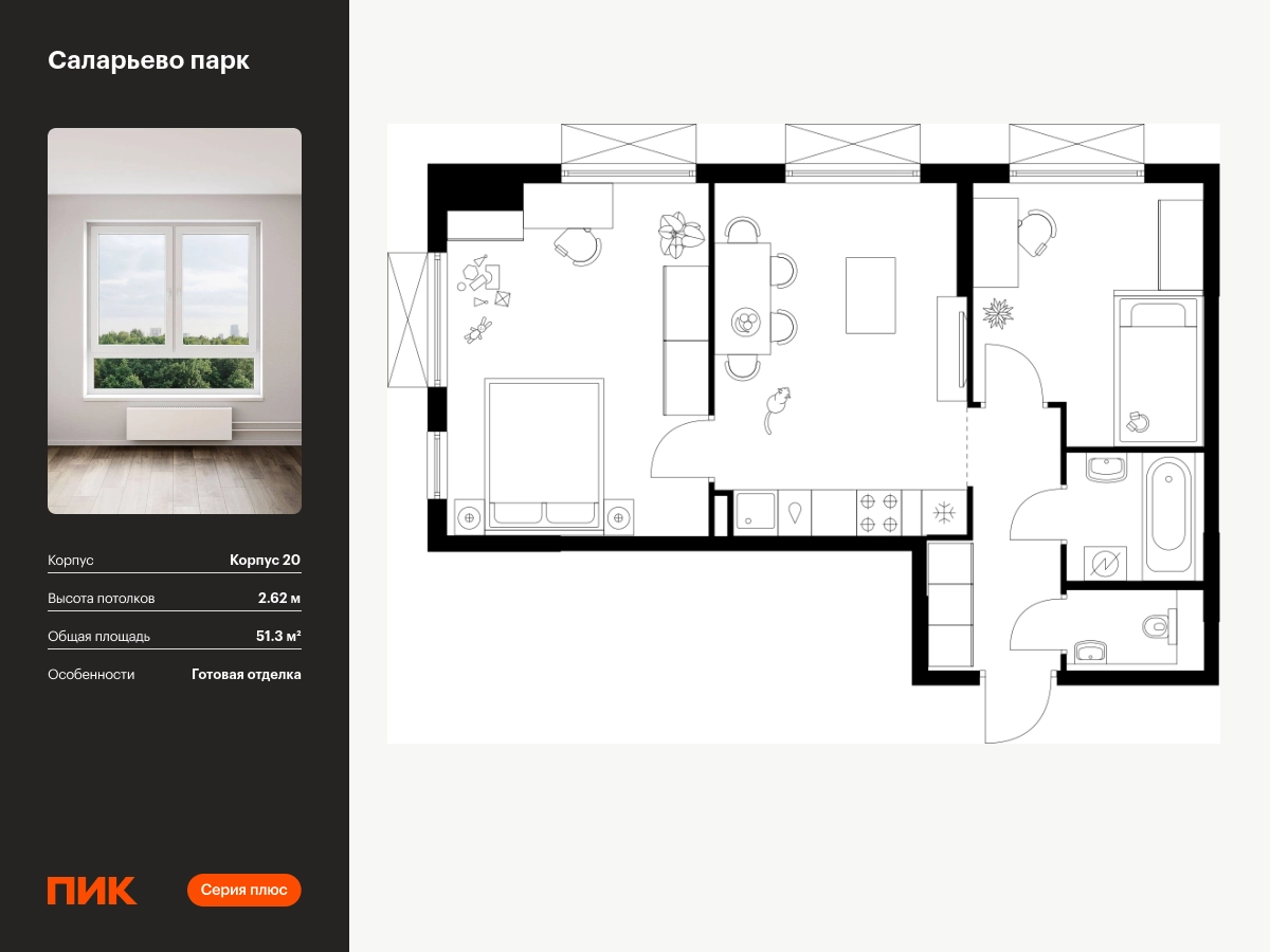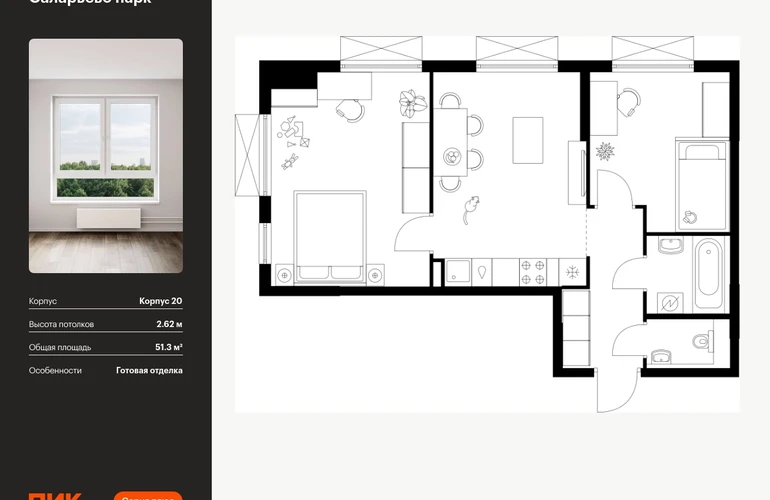 Продаётся 2-комн.квартира площадью 51.30 кв.м на 8 этаже 17 этажного дома (Корпус 20, секция 1) проекта ПИК Саларьево парк. Светлый просторный подъезд на уровне земли, функциональная планировка, большие окна, с отделкой. Жилой район «Саларьево парк» расположен в Новой Москве, в четырёх километрах от МКАД по Киевскому шоссе. Две станции метро: «Саларьево» и «Филатов луг» — находятся в пешей доступности от проекта. Дойти до них можно за 5–10 минут. В квартале уже создана качественная среда, где есть абсолютно всё для полноценной жизни, работы и отдыха. «Саларьево парк» — не просто квартал, а полноценный жилой район, который отличается разноплановой архитектурой. Над концепцией квартала работали несколько ведущих архитектурных бюро, которые стремились добиться разнообразия в фасадных решениях. Ярким примером такого подхода станет корпус 83, который относится к «Серии плюс». Новый корпус 83 был создан по принципам южной архитектуры: расслабленный и лаконичный силуэт зданий, привлекающий к себе внимание. Архитектурная изюминка 83-го корпуса — террасы и фигурные балконы. Вместе с окнами и другими акцентными элементами они создают уникальный облик здания, отсылая нас к изысканной южной архитектуре. Все корпуса в квартале гармонично сочетаются, образуя единую городскую среду. Здесь приятно гулять и проводить время на улице всей семьёй. В «Саларьево парке» создана уникальная образовательная среда, включающая в себя шесть школ, рассчитанных на 6 250 учеников. Две из них уже открыты, их посещает 2 300 детей. Также на территории «Саларьево парка» находится 12 детских садов, один из которых с бассейном. Сейчас уже открыты 7 садов. В «Саларьево парке» открыта уникальная игровая площадка — PlayHub «Оригами». Здесь есть ручей, горка-труба и рельефные холмы. Взрослые смогут отдохнуть в уютном кафе, пока дети играют. Также на территории проекта есть SportHub — большая спортивная зона, разделённая по интересам и возрастам. Здесь можно заниматься разными видами спорта: футболом, баскетболом, волейболом и стритболом. Зимой центральную часть площадки превращают в каток. Во дворах-парках жилого квартала есть места для отдыха, детские и спортивные площадки. На первых этажах домов расположены магазины, кафе и полезные сервисы. Также вблизи проекта есть несколько масштабных торговых центров. До ТЦ «Саларис» пять минут пешком, до «Рио», Metro Cash & Carry и «Лемана про» — пять минут на автомобиле. Артикул - 946710О застройщике