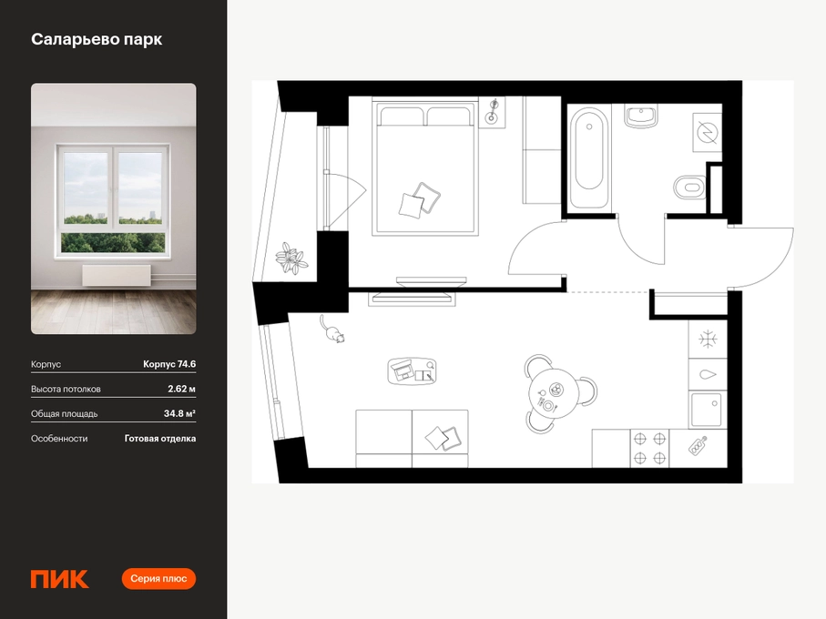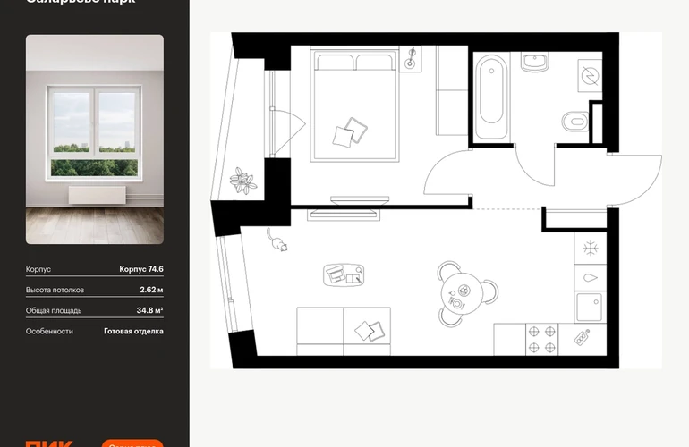 Продаётся 1-комн.квартира площадью 34.80 кв.м на 12 этаже 18 этажного дома (Корпус 74.6, секция 6) проекта ПИК Саларьево парк. Светлый просторный подъезд на уровне земли, функциональная планировка, большие окна, с отделкой. Жилой район «Саларьево парк» расположен в Новой Москве, в четырёх километрах от МКАД по Киевскому шоссе. Две станции метро: «Саларьево» и «Филатов луг» — находятся в пешей доступности от проекта. Дойти до них можно за 5–10 минут. В квартале уже создана качественная среда, где есть абсолютно всё для полноценной жизни, работы и отдыха. «Саларьево парк» — не просто квартал, а полноценный жилой район, который отличается разноплановой архитектурой. Над концепцией квартала работали несколько ведущих архитектурных бюро, которые стремились добиться разнообразия в фасадных решениях. Ярким примером такого подхода станет корпус 83, который относится к «Серии плюс». Новый корпус 83 был создан по принципам южной архитектуры: расслабленный и лаконичный силуэт зданий, привлекающий к себе внимание. Архитектурная изюминка 83-го корпуса — террасы и фигурные балконы. Вместе с окнами и другими акцентными элементами они создают уникальный облик здания, отсылая нас к изысканной южной архитектуре. Все корпуса в квартале гармонично сочетаются, образуя единую городскую среду. Здесь приятно гулять и проводить время на улице всей семьёй. В «Саларьево парке» создана уникальная образовательная среда, включающая в себя шесть школ, рассчитанных на 6 250 учеников. Две из них уже открыты, их посещает 2 300 детей. Также на территории «Саларьево парка» находится 12 детских садов, один из которых с бассейном. Сейчас уже открыты 7 садов. В «Саларьево парке» открыта уникальная игровая площадка — PlayHub «Оригами». Здесь есть ручей, горка-труба и рельефные холмы. Взрослые смогут отдохнуть в уютном кафе, пока дети играют. Также на территории проекта есть SportHub — большая спортивная зона, разделённая по интересам и возрастам. Здесь можно заниматься разными видами спорта: футболом, баскетболом, волейболом и стритболом. Зимой центральную часть площадки превращают в каток. Во дворах-парках жилого квартала есть места для отдыха, детские и спортивные площадки. На первых этажах домов расположены магазины, кафе и полезные сервисы. Также вблизи проекта есть несколько масштабных торговых центров. До ТЦ «Саларис» пять минут пешком, до «Рио», Metro Cash & Carry и «Лемана про» — пять минут на автомобиле. Артикул - 1006904О застройщике