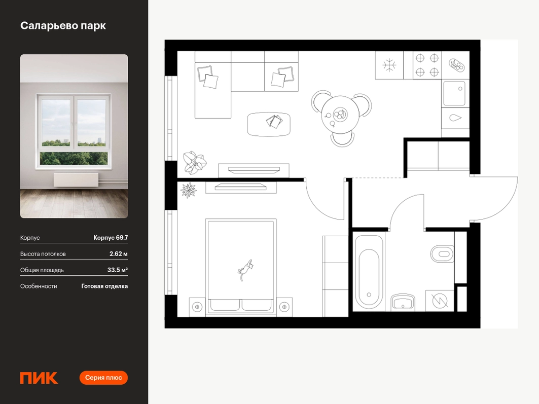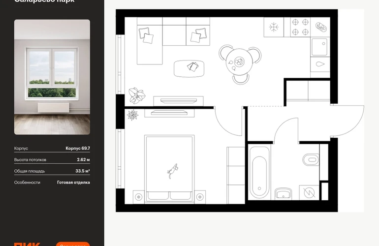 Продаётся 1-комн.квартира площадью 33.50 кв.м на 4 этаже 14 этажного дома (Корпус 69.7, секция 7) проекта ПИК Саларьево парк. Светлый просторный подъезд на уровне земли, функциональная планировка, большие окна, с отделкой. <br> <br>Жилой район «Саларьево парк» расположен в Новой Москве, в четырёх километрах от МКАД по Киевскому шоссе. Две станции метро: «Саларьево» и «Филатов луг» — находятся в пешей доступности от проекта. Дойти до них можно за 5–10 минут. В квартале уже создана качественная среда, где есть абсолютно всё для полноценной жизни, работы и отдыха. <br> <br>«Саларьево парк» — не просто квартал, а полноценный жилой район, который отличается разноплановой архитектурой. Над концепцией квартала работали несколько ведущих архитектурных бюро, которые стремились добиться разнообразия в фасадных решениях. Ярким примером такого подхода станет корпус 83, который относится к «Серии плюс». <br> <br>Новый корпус 83 был создан по принципам южной архитектуры: расслабленный и лаконичный силуэт зданий, привлекающий к себе внимание. Архитектурная изюминка 83-го корпуса — террасы и фигурные балконы. Вместе с окнами и другими акцентными элементами они создают уникальный облик здания, отсылая нас к изысканной южной архитектуре. <br> <br>Все корпуса в квартале гармонично сочетаются, образуя единую городскую среду. Здесь приятно гулять и проводить время на улице всей семьёй. <br> <br>В «Саларьево парке» создана уникальная образовательная среда, включающая в себя шесть школ, рассчитанных на 6 250 учеников. Две из них уже открыты, их посещает 2 300 детей. Также на территории «Саларьево парка» находится 12 детских садов, один из которых с бассейном. Сейчас уже открыты 7 садов. <br> <br>В «Саларьево парке» открыта уникальная игровая площадка — PlayHub «Оригами». Здесь есть ручей, горка-труба и рельефные холмы. Взрослые смогут отдохнуть в уютном кафе, пока дети играют. Также на территории проекта есть SportHub — большая спортивная зона, разделённая по интересам и возрастам. Здесь можно заниматься разными видами спорта: футболом, баскетболом, волейболом и стритболом. Зимой центральную часть площадки превращают в каток. <br> <br>Во дворах-парках жилого квартала есть места для отдыха, детские и спортивные площадки. На первых этажах домов расположены магазины, кафе и полезные сервисы. Также вблизи проекта есть несколько масштабных торговых центров. До ТЦ «Саларис» пять минут пешком, до «Рио», Metro Cash & Carry и «Лемана про» — пять минут на автомобиле. Артикул - 1024116О застройщике