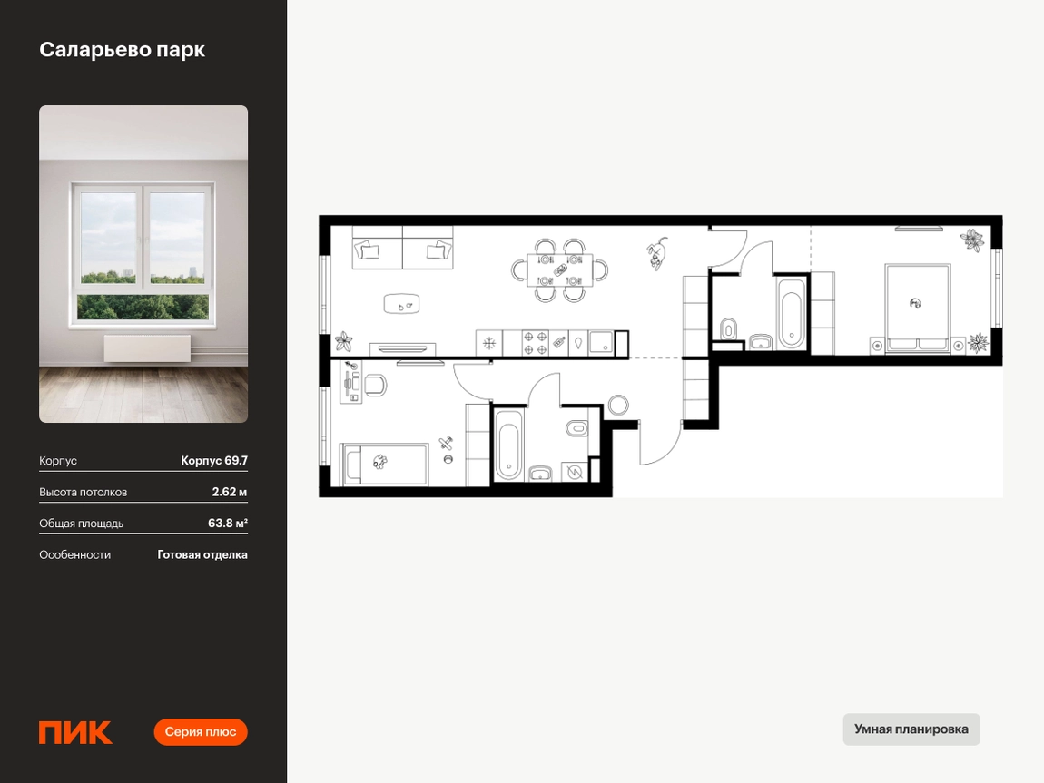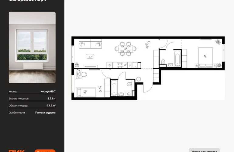 Продаётся 2-комн.квартира площадью 63.80 кв.м на 6 этаже 14 этажного дома (Корпус 69.7, секция 7) проекта ПИК Саларьево парк. Светлый просторный подъезд на уровне земли, функциональная планировка, большие окна, с отделкой. Жилой район «Саларьево парк» расположен в Новой Москве, в четырёх километрах от МКАД по Киевскому шоссе. Две станции метро: «Саларьево» и «Филатов луг», — находятся в пешей доступности от проекта. Дойти до них можно за 5–10 минут. В квартале уже создана качественная среда, где есть абсолютно всё для полноценной жизни, работы и отдыха. «Саларьево парк» — не просто квартал, а полноценный жилой район, который отличается разноплановой архитектурой. Над концепцией квартала работали несколько ведущих архитектурных бюро, которые стремились добиться разнообразия в фасадных решениях. Ярким примером такого подхода станут корпуса 82 и 83, которые относятся к «Серии плюс». Новый корпус 83 был создан по принципам южной архитектуры: расслабленный и лаконичный силуэт зданий, привлекающий к себе внимание. Архитектурная изюминка 83-го корпуса — террасы и фигурные балконы. Вместе с окнами и другими акцентными элементами они создают уникальный облик здания, отсылая нас к изысканной южной архитектуре. Все корпуса в квартале гармонично сочетаются, образуя единую городскую среду. Здесь приятно гулять и проводить время на улице всей семьёй. В «Саларьево парке» создана уникальная образовательная среда, включающая в себя шесть школ, рассчитанных на 6 250 учеников. Четыре из них уже открыты, их посещает 2 300 детей. Также на территории «Саларьево парка» находится 12 детских садов, один из которых с бассейном. Сейчас уже открыты 8 садов. В «Саларьево парке» открыта уникальная игровая площадка — PlayHub «Оригами». Здесь есть ручей, горка-труба и рельефные холмы. Взрослые смогут отдохнуть в уютном кафе, пока дети играют. Также на территории проекта есть SportHub — большая спортивная зона, разделённая по интересам и возрастам. Здесь можно заниматься разными видами спорта: футболом, баскетболом, волейболом и стритболом. Зимой центральную часть площадки превращают в каток. Во дворах-парках жилого квартала есть места для отдыха, детские и спортивные площадки. На первых этажах домов расположены магазины, кафе и полезные сервисы. Также вблизи проекта есть несколько масштабных торговых центров. До ТЦ «Саларис» пять минут пешком, до «Рио», Metro Cash & Carry и «Леруа Мерлен» — пять минут на автомобиле. Артикул - 1024142О застройщике