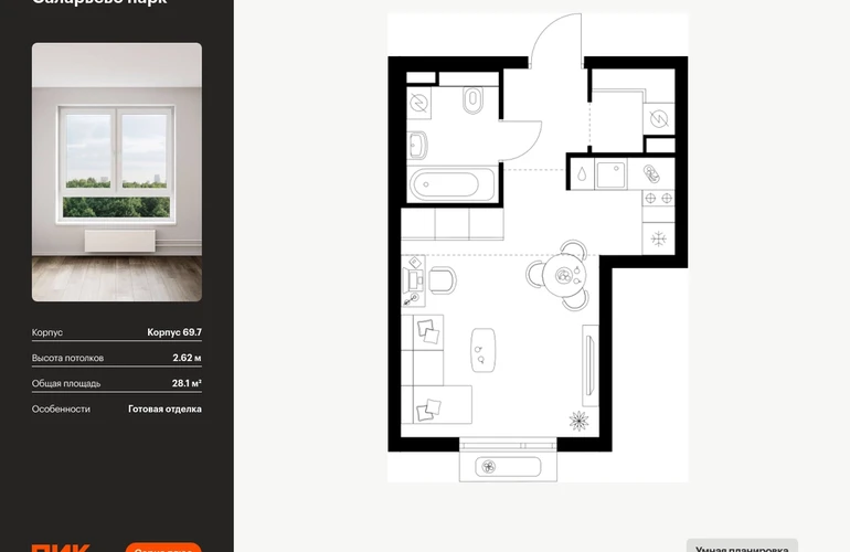 Продаётся квартира-студия площадью 28.10 кв.м на 4 этаже 14 этажного дома (Корпус 69.7, секция 7) проекта ПИК Саларьево парк. Светлый просторный подъезд на уровне земли, функциональная планировка, большие окна, с отделкой. <br> <br>Жилой район «Саларьево парк» расположен в Новой Москве, в четырёх километрах от МКАД по Киевскому шоссе. Две станции метро: «Саларьево» и «Филатов луг» — находятся в пешей доступности от проекта. Дойти до них можно за 5–10 минут. В квартале уже создана качественная среда, где есть абсолютно всё для полноценной жизни, работы и отдыха. <br> <br>«Саларьево парк» — не просто квартал, а полноценный жилой район, который отличается разноплановой архитектурой. Над концепцией квартала работали несколько ведущих архитектурных бюро, которые стремились добиться разнообразия в фасадных решениях. Ярким примером такого подхода станет корпус 83, который относится к «Серии плюс». <br> <br>Новый корпус 83 был создан по принципам южной архитектуры: расслабленный и лаконичный силуэт зданий, привлекающий к себе внимание. Архитектурная изюминка 83-го корпуса — террасы и фигурные балконы. Вместе с окнами и другими акцентными элементами они создают уникальный облик здания, отсылая нас к изысканной южной архитектуре. <br> <br>Все корпуса в квартале гармонично сочетаются, образуя единую городскую среду. Здесь приятно гулять и проводить время на улице всей семьёй. <br> <br>В «Саларьево парке» создана уникальная образовательная среда, включающая в себя шесть школ, рассчитанных на 6 250 учеников. Две из них уже открыты, их посещает 2 300 детей. Также на территории «Саларьево парка» находится 12 детских садов, один из которых с бассейном. Сейчас уже открыты 7 садов. <br> <br>В «Саларьево парке» открыта уникальная игровая площадка — PlayHub «Оригами». Здесь есть ручей, горка-труба и рельефные холмы. Взрослые смогут отдохнуть в уютном кафе, пока дети играют. Также на территории проекта есть SportHub — большая спортивная зона, разделённая по интересам и возрастам. Здесь можно заниматься разными видами спорта: футболом, баскетболом, волейболом и стритболом. Зимой центральную часть площадки превращают в каток. <br> <br>Во дворах-парках жилого квартала есть места для отдыха, детские и спортивные площадки. На первых этажах домов расположены магазины, кафе и полезные сервисы. Также вблизи проекта есть несколько масштабных торговых центров. До ТЦ «Саларис» пять минут пешком, до «Рио», Metro Cash & Carry и «Леруа Мерлен» — пять минут на автомобиле. Артикул - 1024125О застройщике