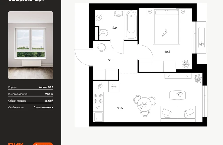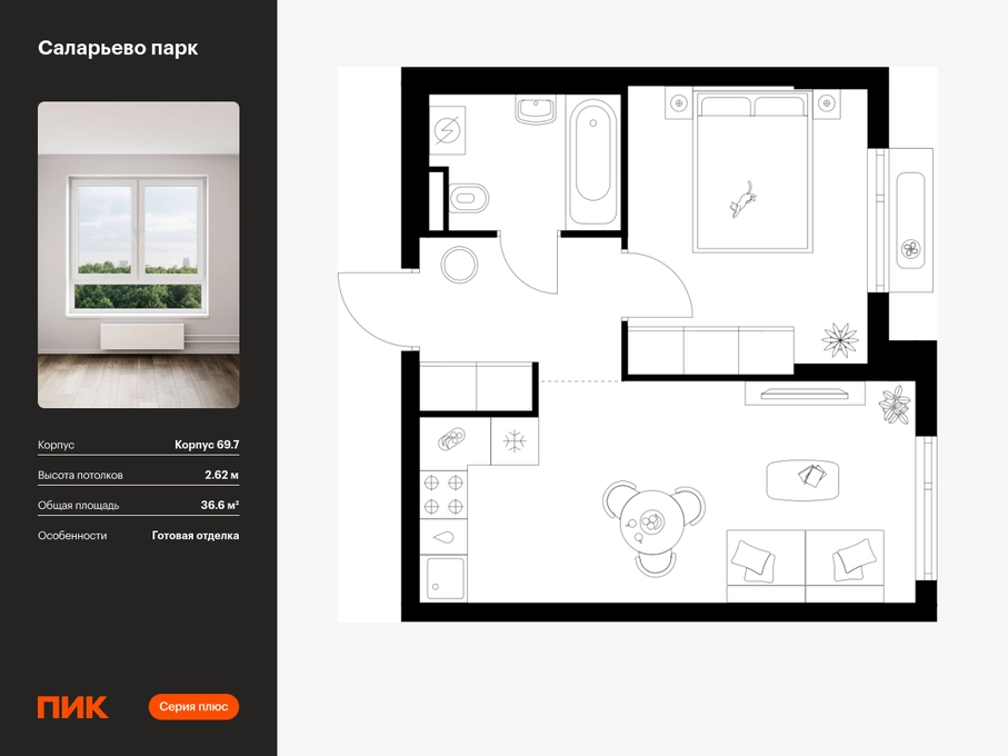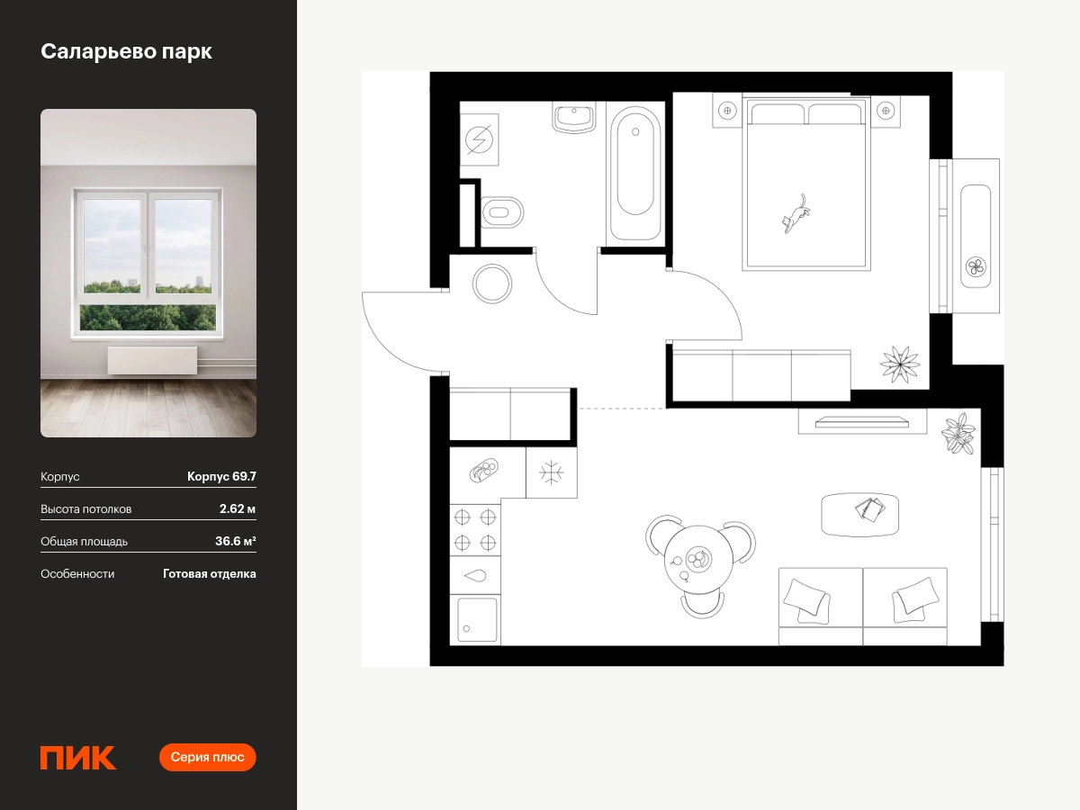 Продаётся 1-комн.квартира площадью 36.60 кв.м на 4 этаже 14 этажного дома (Корпус 69.7, секция 7) проекта ПИК Саларьево парк. Светлый просторный подъезд на уровне земли, функциональная планировка, большие окна, с отделкой. Жилой район «Саларьево парк» расположен в Новой Москве, в четырёх километрах от МКАД по Киевскому шоссе. Две станции метро: «Саларьево» и «Филатов луг» — находятся в пешей доступности от проекта. Дойти до них можно за 5–10 минут. В квартале уже создана качественная среда, где есть абсолютно всё для полноценной жизни, работы и отдыха. «Саларьево парк» — не просто квартал, а полноценный жилой район, который отличается разноплановой архитектурой. Над концепцией квартала работали несколько ведущих архитектурных бюро, которые стремились добиться разнообразия в фасадных решениях. Ярким примером такого подхода станет корпус 83, который относится к «Серии плюс». Новый корпус 83 был создан по принципам южной архитектуры: расслабленный и лаконичный силуэт зданий, привлекающий к себе внимание. Архитектурная изюминка 83-го корпуса — террасы и фигурные балконы. Вместе с окнами и другими акцентными элементами они создают уникальный облик здания, отсылая нас к изысканной южной архитектуре. Все корпуса в квартале гармонично сочетаются, образуя единую городскую среду. Здесь приятно гулять и проводить время на улице всей семьёй. В «Саларьево парке» создана уникальная образовательная среда, включающая в себя шесть школ, рассчитанных на 6 250 учеников. Две из них уже открыты, их посещает 2 300 детей. Также на территории «Саларьево парка» находится 12 детских садов, один из которых с бассейном. Сейчас уже открыты 7 садов. В «Саларьево парке» открыта уникальная игровая площадка — PlayHub «Оригами». Здесь есть ручей, горка-труба и рельефные холмы. Взрослые смогут отдохнуть в уютном кафе, пока дети играют. Также на территории проекта есть SportHub — большая спортивная зона, разделённая по интересам и возрастам. Здесь можно заниматься разными видами спорта: футболом, баскетболом, волейболом и стритболом. Зимой центральную часть площадки превращают в каток. Во дворах-парках жилого квартала есть места для отдыха, детские и спортивные площадки. На первых этажах домов расположены магазины, кафе и полезные сервисы. Также вблизи проекта есть несколько масштабных торговых центров. До ТЦ «Саларис» пять минут пешком, до «Рио», Metro Cash & Carry и «Лемана про» — пять минут на автомобиле. Артикул - 1024118О застройщике