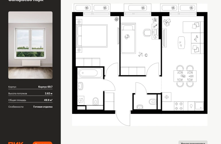 Продаётся 2-комн.квартира площадью 49.90 кв.м на 7 этаже 14 этажного дома (Корпус 69.7, секция 7) проекта ПИК Саларьево парк. Светлый просторный подъезд на уровне земли, функциональная планировка, большие окна, с отделкой. <br> <br>Жилой район «Саларьево парк» расположен в Новой Москве, в четырёх километрах от МКАД по Киевскому шоссе. Две станции метро: «Саларьево» и «Филатов луг» — находятся в пешей доступности от проекта. Дойти до них можно за 5–10 минут. В квартале уже создана качественная среда, где есть абсолютно всё для полноценной жизни, работы и отдыха. <br> <br>«Саларьево парк» — не просто квартал, а полноценный жилой район, который отличается разноплановой архитектурой. Над концепцией квартала работали несколько ведущих архитектурных бюро, которые стремились добиться разнообразия в фасадных решениях. Ярким примером такого подхода станет корпус 83, который относится к «Серии плюс». <br> <br>Новый корпус 83 был создан по принципам южной архитектуры: расслабленный и лаконичный силуэт зданий, привлекающий к себе внимание. Архитектурная изюминка 83-го корпуса — террасы и фигурные балконы. Вместе с окнами и другими акцентными элементами они создают уникальный облик здания, отсылая нас к изысканной южной архитектуре. <br> <br>Все корпуса в квартале гармонично сочетаются, образуя единую городскую среду. Здесь приятно гулять и проводить время на улице всей семьёй. <br> <br>В «Саларьево парке» создана уникальная образовательная среда, включающая в себя шесть школ, рассчитанных на 6 250 учеников. Две из них уже открыты, их посещает 2 300 детей. Также на территории «Саларьево парка» находится 12 детских садов, один из которых с бассейном. Сейчас уже открыты 7 садов. <br> <br>В «Саларьево парке» открыта уникальная игровая площадка — PlayHub «Оригами». Здесь есть ручей, горка-труба и рельефные холмы. Взрослые смогут отдохнуть в уютном кафе, пока дети играют. Также на территории проекта есть SportHub — большая спортивная зона, разделённая по интересам и возрастам. Здесь можно заниматься разными видами спорта: футболом, баскетболом, волейболом и стритболом. Зимой центральную часть площадки превращают в каток. <br> <br>Во дворах-парках жилого квартала есть места для отдыха, детские и спортивные площадки. На первых этажах домов расположены магазины, кафе и полезные сервисы. Также вблизи проекта есть несколько масштабных торговых центров. До ТЦ «Саларис» пять минут пешком, до «Рио», Metro Cash & Carry и «Леруа Мерлен» — пять минут на автомобиле. Артикул - 1024158О застройщике
