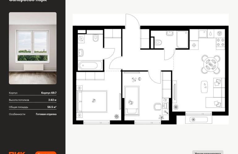 Продаётся 2-комн.квартира площадью 56.50 кв.м на 8 этаже 14 этажного дома (Корпус 69.7, секция 7) проекта ПИК Саларьево парк. Светлый просторный подъезд на уровне земли, функциональная планировка, большие окна, с отделкой. Жилой район «Саларьево парк» расположен в Новой Москве, в четырёх километрах от МКАД по Киевскому шоссе. Две станции метро: «Саларьево» и «Филатов луг» — находятся в пешей доступности от проекта. Дойти до них можно за 5–10 минут. В квартале уже создана качественная среда, где есть абсолютно всё для полноценной жизни, работы и отдыха. «Саларьево парк» — не просто квартал, а полноценный жилой район, который отличается разноплановой архитектурой. Над концепцией квартала работали несколько ведущих архитектурных бюро, которые стремились добиться разнообразия в фасадных решениях. Ярким примером такого подхода станет корпус 83, который относится к «Серии плюс». Новый корпус 83 был создан по принципам южной архитектуры: расслабленный и лаконичный силуэт зданий, привлекающий к себе внимание. Архитектурная изюминка 83-го корпуса — террасы и фигурные балконы. Вместе с окнами и другими акцентными элементами они создают уникальный облик здания, отсылая нас к изысканной южной архитектуре. Все корпуса в квартале гармонично сочетаются, образуя единую городскую среду. Здесь приятно гулять и проводить время на улице всей семьёй. В «Саларьево парке» создана уникальная образовательная среда, включающая в себя шесть школ, рассчитанных на 6 250 учеников. Две из них уже открыты, их посещает 2 300 детей. Также на территории «Саларьево парка» находится 12 детских садов, один из которых с бассейном. Сейчас уже открыты 7 садов. В «Саларьево парке» открыта уникальная игровая площадка — PlayHub «Оригами». Здесь есть ручей, горка-труба и рельефные холмы. Взрослые смогут отдохнуть в уютном кафе, пока дети играют. Также на территории проекта есть SportHub — большая спортивная зона, разделённая по интересам и возрастам. Здесь можно заниматься разными видами спорта: футболом, баскетболом, волейболом и стритболом. Зимой центральную часть площадки превращают в каток. Во дворах-парках жилого квартала есть места для отдыха, детские и спортивные площадки. На первых этажах домов расположены магазины, кафе и полезные сервисы. Также вблизи проекта есть несколько масштабных торговых центров. До ТЦ «Саларис» пять минут пешком, до «Рио», Metro Cash & Carry и «Лемана про» — пять минут на автомобиле. Артикул - 1024164О застройщике