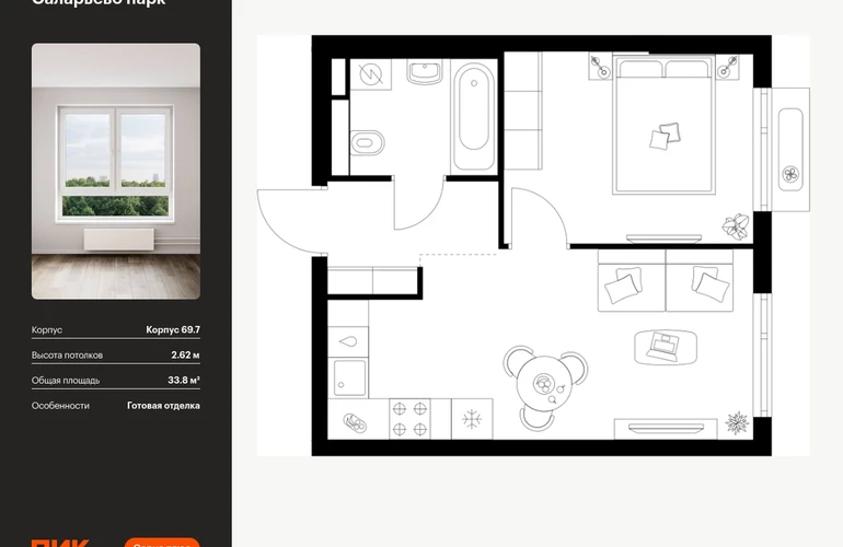 Продаётся 1-комн.квартира площадью 33.80 кв.м на 2 этаже 14 этажного дома (Корпус 69.7, секция 7) проекта ПИК Саларьево парк. Светлый просторный подъезд на уровне земли, функциональная планировка, большие окна, с отделкой. Артикул - 1024094О застройщике