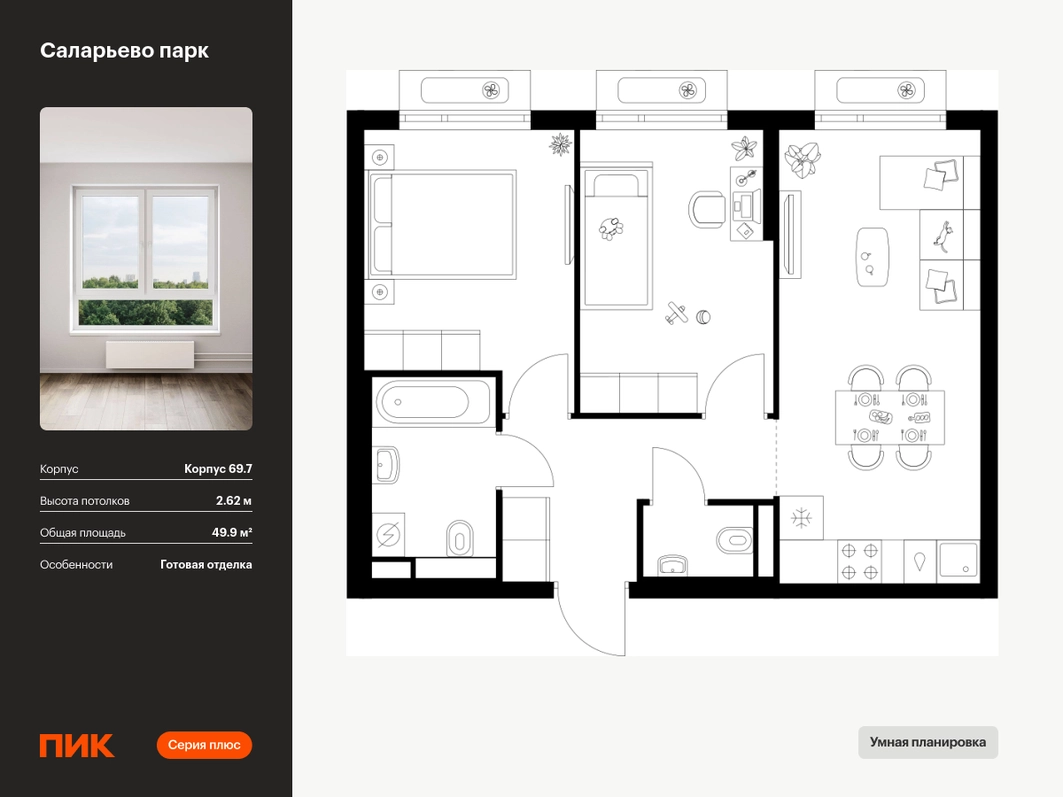 Продаётся 2-комн.квартира площадью 49.90 кв.м на 2 этаже 14 этажного дома (Корпус 69.7, секция 7) проекта ПИК Саларьево парк. Светлый просторный подъезд на уровне земли, функциональная планировка, большие окна, с отделкой. <br> <br>Жилой район «Саларьево парк» расположен в Новой Москве, в четырёх километрах от МКАД по Киевскому шоссе. Две станции метро: «Саларьево» и «Филатов луг» — находятся в пешей доступности от проекта. Дойти до них можно за 5–10 минут. В квартале уже создана качественная среда, где есть абсолютно всё для полноценной жизни, работы и отдыха. <br> <br>«Саларьево парк» — не просто квартал, а полноценный жилой район, который отличается разноплановой архитектурой. Над концепцией квартала работали несколько ведущих архитектурных бюро, которые стремились добиться разнообразия в фасадных решениях. Ярким примером такого подхода станет корпус 83, который относится к «Серии плюс». <br> <br>Новый корпус 83 был создан по принципам южной архитектуры: расслабленный и лаконичный силуэт зданий, привлекающий к себе внимание. Архитектурная изюминка 83-го корпуса — террасы и фигурные балконы. Вместе с окнами и другими акцентными элементами они создают уникальный облик здания, отсылая нас к изысканной южной архитектуре. <br> <br>Все корпуса в квартале гармонично сочетаются, образуя единую городскую среду. Здесь приятно гулять и проводить время на улице всей семьёй. <br> <br>В «Саларьево парке» создана уникальная образовательная среда, включающая в себя шесть школ, рассчитанных на 6 250 учеников. Две из них уже открыты, их посещает 2 300 детей. Также на территории «Саларьево парка» находится 12 детских садов, один из которых с бассейном. Сейчас уже открыты 7 садов. <br> <br>В «Саларьево парке» открыта уникальная игровая площадка — PlayHub «Оригами». Здесь есть ручей, горка-труба и рельефные холмы. Взрослые смогут отдохнуть в уютном кафе, пока дети играют. Также на территории проекта есть SportHub — большая спортивная зона, разделённая по интересам и возрастам. Здесь можно заниматься разными видами спорта: футболом, баскетболом, волейболом и стритболом. Зимой центральную часть площадки превращают в каток. <br> <br>Во дворах-парках жилого квартала есть места для отдыха, детские и спортивные площадки. На первых этажах домов расположены магазины, кафе и полезные сервисы. Также вблизи проекта есть несколько масштабных торговых центров. До ТЦ «Саларис» пять минут пешком, до «Рио», Metro Cash & Carry и «Леруа Мерлен» — пять минут на автомобиле. Артикул - 1024098О застройщике