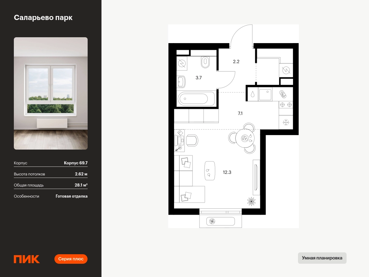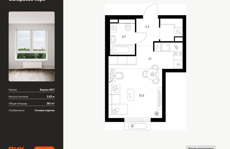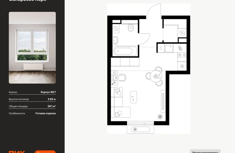 Продаётся квартира-студия площадью 28.10 кв.м на 10 этаже 14 этажного дома (Корпус 69.7, секция 7) проекта ПИК Саларьево парк. Светлый просторный подъезд на уровне земли, функциональная планировка, большие окна, с отделкой. Жилой район «Саларьево парк» расположен в Новой Москве, в четырёх километрах от МКАД по Киевскому шоссе. Две станции метро: «Саларьево» и «Филатов луг» — находятся в пешей доступности от проекта. Дойти до них можно за 5–10 минут. В квартале уже создана качественная среда, где есть абсолютно всё для полноценной жизни, работы и отдыха. «Саларьево парк» — не просто квартал, а полноценный жилой район, который отличается разноплановой архитектурой. Над концепцией квартала работали несколько ведущих архитектурных бюро, которые стремились добиться разнообразия в фасадных решениях. Ярким примером такого подхода станет корпус 83, который относится к «Серии плюс». Новый корпус 83 был создан по принципам южной архитектуры: расслабленный и лаконичный силуэт зданий, привлекающий к себе внимание. Архитектурная изюминка 83-го корпуса — террасы и фигурные балконы. Вместе с окнами и другими акцентными элементами они создают уникальный облик здания, отсылая нас к изысканной южной архитектуре. Все корпуса в квартале гармонично сочетаются, образуя единую городскую среду. Здесь приятно гулять и проводить время на улице всей семьёй. В «Саларьево парке» создана уникальная образовательная среда, включающая в себя шесть школ, рассчитанных на 6 250 учеников. Две из них уже открыты, их посещает 2 300 детей. Также на территории «Саларьево парка» находится 12 детских садов, один из которых с бассейном. Сейчас уже открыты 7 садов. В «Саларьево парке» открыта уникальная игровая площадка — PlayHub «Оригами». Здесь есть ручей, горка-труба и рельефные холмы. Взрослые смогут отдохнуть в уютном кафе, пока дети играют. Также на территории проекта есть SportHub — большая спортивная зона, разделённая по интересам и возрастам. Здесь можно заниматься разными видами спорта: футболом, баскетболом, волейболом и стритболом. Зимой центральную часть площадки превращают в каток. Во дворах-парках жилого квартала есть места для отдыха, детские и спортивные площадки. На первых этажах домов расположены магазины, кафе и полезные сервисы. Также вблизи проекта есть несколько масштабных торговых центров. До ТЦ «Саларис» пять минут пешком, до «Рио», Metro Cash & Carry и «Лемана про» — пять минут на автомобиле. Артикул - 1024196О застройщике