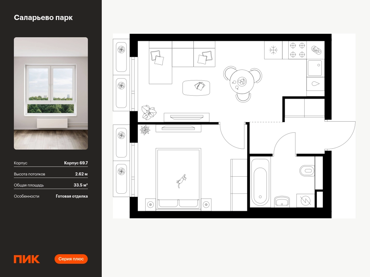 Продаётся 1-комн.квартира площадью 33.50 кв.м на 7 этаже 14 этажного дома (Корпус 69.7, секция 7) проекта ПИК Саларьево парк. Светлый просторный подъезд на уровне земли, функциональная планировка, большие окна, с отделкой. Жилой район «Саларьево парк» расположен в Новой Москве, в четырёх километрах от МКАД по Киевскому шоссе. Две станции метро: «Саларьево» и «Филатов луг» — находятся в пешей доступности от проекта. Дойти до них можно за 5–10 минут. В квартале уже создана качественная среда, где есть абсолютно всё для полноценной жизни, работы и отдыха. «Саларьево парк» — не просто квартал, а полноценный жилой район, который отличается разноплановой архитектурой. Над концепцией квартала работали несколько ведущих архитектурных бюро, которые стремились добиться разнообразия в фасадных решениях. Ярким примером такого подхода станет корпус 83, который относится к «Серии плюс». Новый корпус 83 был создан по принципам южной архитектуры: расслабленный и лаконичный силуэт зданий, привлекающий к себе внимание. Архитектурная изюминка 83-го корпуса — террасы и фигурные балконы. Вместе с окнами и другими акцентными элементами они создают уникальный облик здания, отсылая нас к изысканной южной архитектуре. Все корпуса в квартале гармонично сочетаются, образуя единую городскую среду. Здесь приятно гулять и проводить время на улице всей семьёй. В «Саларьево парке» создана уникальная образовательная среда, включающая в себя шесть школ, рассчитанных на 6 250 учеников. Две из них уже открыты, их посещает 2 300 детей. Также на территории «Саларьево парка» находится 12 детских садов, один из которых с бассейном. Сейчас уже открыты 7 садов. В «Саларьево парке» открыта уникальная игровая площадка — PlayHub «Оригами». Здесь есть ручей, горка-труба и рельефные холмы. Взрослые смогут отдохнуть в уютном кафе, пока дети играют. Также на территории проекта есть SportHub — большая спортивная зона, разделённая по интересам и возрастам. Здесь можно заниматься разными видами спорта: футболом, баскетболом, волейболом и стритболом. Зимой центральную часть площадки превращают в каток. Во дворах-парках жилого квартала есть места для отдыха, детские и спортивные площадки. На первых этажах домов расположены магазины, кафе и полезные сервисы. Также вблизи проекта есть несколько масштабных торговых центров. До ТЦ «Саларис» пять минут пешком, до «Рио», Metro Cash & Carry и «Лемана про» — пять минут на автомобиле. Артикул - 1024152О застройщике