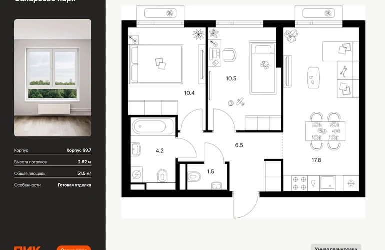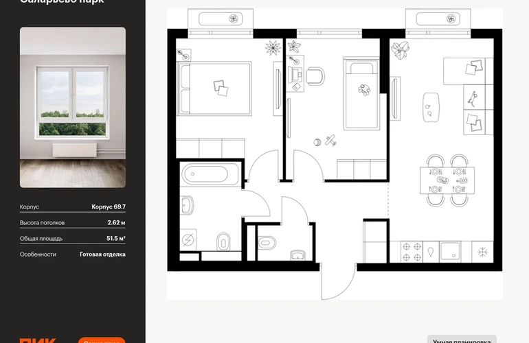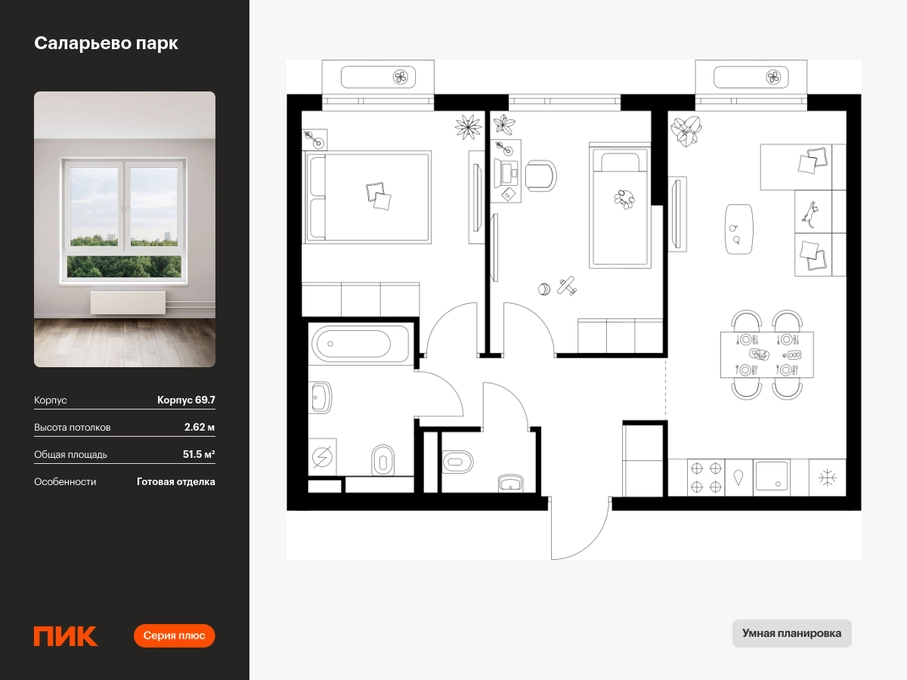 Продаётся 2-комн.квартира площадью 51.50 кв.м на 10 этаже 14 этажного дома (Корпус 69.7, секция 7) проекта ПИК Саларьево парк. Светлый просторный подъезд на уровне земли, функциональная планировка, большие окна, с отделкой. <br> <br>Жилой район «Саларьево парк» расположен в Новой Москве, в четырёх километрах от МКАД по Киевскому шоссе. Две станции метро: «Саларьево» и «Филатов луг» — находятся в пешей доступности от проекта. Дойти до них можно за 5–10 минут. В квартале уже создана качественная среда, где есть абсолютно всё для полноценной жизни, работы и отдыха. <br> <br>«Саларьево парк» — не просто квартал, а полноценный жилой район, который отличается разноплановой архитектурой. Над концепцией квартала работали несколько ведущих архитектурных бюро, которые стремились добиться разнообразия в фасадных решениях. Ярким примером такого подхода станет корпус 83, который относится к «Серии плюс». <br> <br>Новый корпус 83 был создан по принципам южной архитектуры: расслабленный и лаконичный силуэт зданий, привлекающий к себе внимание. Архитектурная изюминка 83-го корпуса — террасы и фигурные балконы. Вместе с окнами и другими акцентными элементами они создают уникальный облик здания, отсылая нас к изысканной южной архитектуре. <br> <br>Все корпуса в квартале гармонично сочетаются, образуя единую городскую среду. Здесь приятно гулять и проводить время на улице всей семьёй. <br> <br>В «Саларьево парке» создана уникальная образовательная среда, включающая в себя шесть школ, рассчитанных на 6 250 учеников. Две из них уже открыты, их посещает 2 300 детей. Также на территории «Саларьево парка» находится 12 детских садов, один из которых с бассейном. Сейчас уже открыты 7 садов. <br> <br>В «Саларьево парке» открыта уникальная игровая площадка — PlayHub «Оригами». Здесь есть ручей, горка-труба и рельефные холмы. Взрослые смогут отдохнуть в уютном кафе, пока дети играют. Также на территории проекта есть SportHub — большая спортивная зона, разделённая по интересам и возрастам. Здесь можно заниматься разными видами спорта: футболом, баскетболом, волейболом и стритболом. Зимой центральную часть площадки превращают в каток. <br> <br>Во дворах-парках жилого квартала есть места для отдыха, детские и спортивные площадки. На первых этажах домов расположены магазины, кафе и полезные сервисы. Также вблизи проекта есть несколько масштабных торговых центров. До ТЦ «Саларис» пять минут пешком, до «Рио», Metro Cash & Carry и «Лемана про» — пять минут на автомобиле. Артикул - 1024193О застройщике