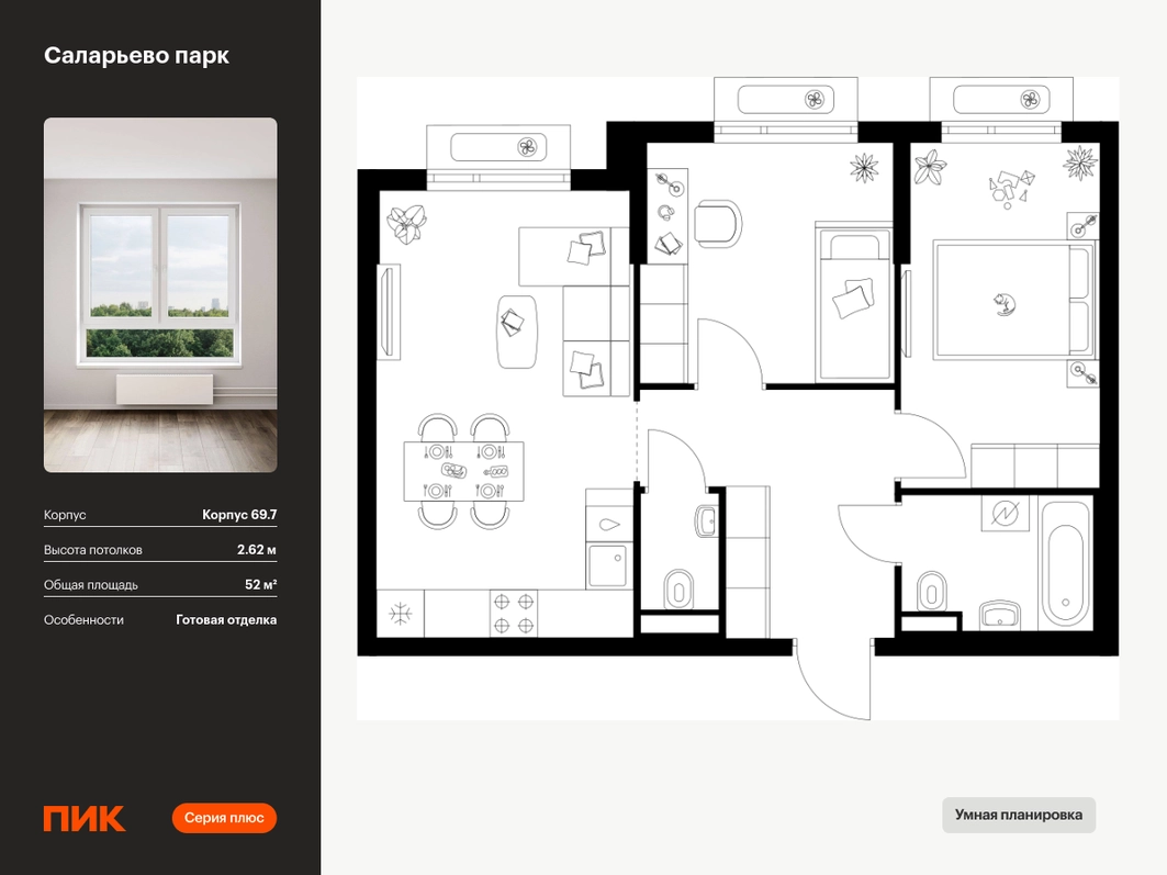 Продаётся 2-комн.квартира площадью 52.00 кв.м на 8 этаже 14 этажного дома (Корпус 69.7, секция 7) проекта ПИК Саларьево парк. Светлый просторный подъезд на уровне земли, функциональная планировка, большие окна, с отделкой. <br> <br>Жилой район «Саларьево парк» расположен в Новой Москве, в четырёх километрах от МКАД по Киевскому шоссе. Две станции метро: «Саларьево» и «Филатов луг» — находятся в пешей доступности от проекта. Дойти до них можно за 5–10 минут. В квартале уже создана качественная среда, где есть абсолютно всё для полноценной жизни, работы и отдыха. <br> <br>«Саларьево парк» — не просто квартал, а полноценный жилой район, который отличается разноплановой архитектурой. Над концепцией квартала работали несколько ведущих архитектурных бюро, которые стремились добиться разнообразия в фасадных решениях. Ярким примером такого подхода станет корпус 83, который относится к «Серии плюс». <br> <br>Новый корпус 83 был создан по принципам южной архитектуры: расслабленный и лаконичный силуэт зданий, привлекающий к себе внимание. Архитектурная изюминка 83-го корпуса — террасы и фигурные балконы. Вместе с окнами и другими акцентными элементами они создают уникальный облик здания, отсылая нас к изысканной южной архитектуре. <br> <br>Все корпуса в квартале гармонично сочетаются, образуя единую городскую среду. Здесь приятно гулять и проводить время на улице всей семьёй. <br> <br>В «Саларьево парке» создана уникальная образовательная среда, включающая в себя шесть школ, рассчитанных на 6 250 учеников. Две из них уже открыты, их посещает 2 300 детей. Также на территории «Саларьево парка» находится 12 детских садов, один из которых с бассейном. Сейчас уже открыты 7 садов. <br> <br>В «Саларьево парке» открыта уникальная игровая площадка — PlayHub «Оригами». Здесь есть ручей, горка-труба и рельефные холмы. Взрослые смогут отдохнуть в уютном кафе, пока дети играют. Также на территории проекта есть SportHub — большая спортивная зона, разделённая по интересам и возрастам. Здесь можно заниматься разными видами спорта: футболом, баскетболом, волейболом и стритболом. Зимой центральную часть площадки превращают в каток. <br> <br>Во дворах-парках жилого квартала есть места для отдыха, детские и спортивные площадки. На первых этажах домов расположены магазины, кафе и полезные сервисы. Также вблизи проекта есть несколько масштабных торговых центров. До ТЦ «Саларис» пять минут пешком, до «Рио», Metro Cash & Carry и «Лемана про» — пять минут на автомобиле. Артикул - 1024169О застройщике