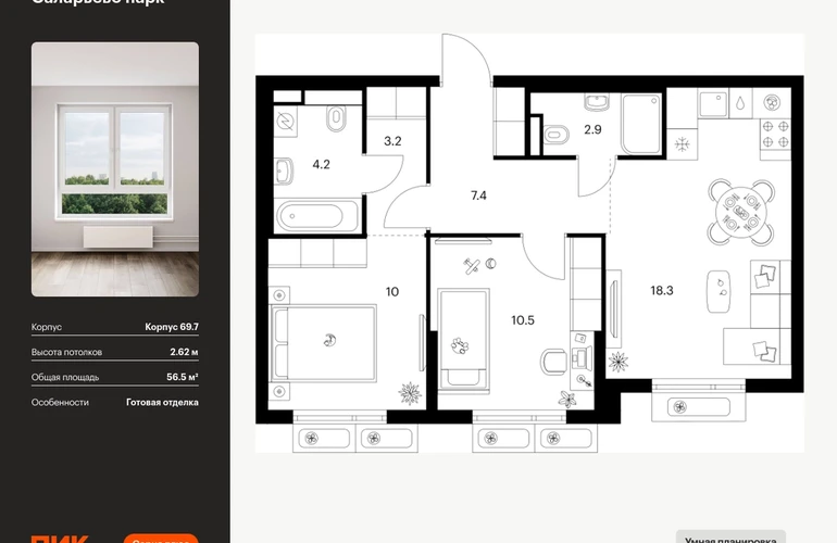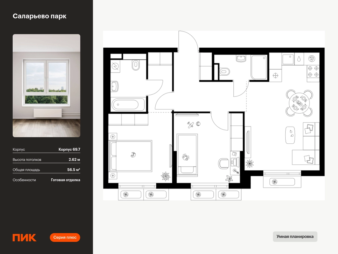 Продаётся 2-комн.квартира площадью 56.50 кв.м на 3 этаже 14 этажного дома (Корпус 69.7, секция 7) проекта ПИК Саларьево парк. Светлый просторный подъезд на уровне земли, функциональная планировка, большие окна, с отделкой. Жилой район «Саларьево парк» расположен в Новой Москве, в четырёх километрах от МКАД по Киевскому шоссе. Две станции метро: «Саларьево» и «Филатов луг» — находятся в пешей доступности от проекта. Дойти до них можно за 5–10 минут. В квартале уже создана качественная среда, где есть абсолютно всё для полноценной жизни, работы и отдыха. «Саларьево парк» — не просто квартал, а полноценный жилой район, который отличается разноплановой архитектурой. Над концепцией квартала работали несколько ведущих архитектурных бюро, которые стремились добиться разнообразия в фасадных решениях. Ярким примером такого подхода станет корпус 83, который относится к «Серии плюс». Новый корпус 83 был создан по принципам южной архитектуры: расслабленный и лаконичный силуэт зданий, привлекающий к себе внимание. Архитектурная изюминка 83-го корпуса — террасы и фигурные балконы. Вместе с окнами и другими акцентными элементами они создают уникальный облик здания, отсылая нас к изысканной южной архитектуре. Все корпуса в квартале гармонично сочетаются, образуя единую городскую среду. Здесь приятно гулять и проводить время на улице всей семьёй. В «Саларьево парке» создана уникальная образовательная среда, включающая в себя шесть школ, рассчитанных на 6 250 учеников. Две из них уже открыты, их посещает 2 300 детей. Также на территории «Саларьево парка» находится 12 детских садов, один из которых с бассейном. Сейчас уже открыты 7 садов. В «Саларьево парке» открыта уникальная игровая площадка — PlayHub «Оригами». Здесь есть ручей, горка-труба и рельефные холмы. Взрослые смогут отдохнуть в уютном кафе, пока дети играют. Также на территории проекта есть SportHub — большая спортивная зона, разделённая по интересам и возрастам. Здесь можно заниматься разными видами спорта: футболом, баскетболом, волейболом и стритболом. Зимой центральную часть площадки превращают в каток. Во дворах-парках жилого квартала есть места для отдыха, детские и спортивные площадки. На первых этажах домов расположены магазины, кафе и полезные сервисы. Также вблизи проекта есть несколько масштабных торговых центров. До ТЦ «Саларис» пять минут пешком, до «Рио», Metro Cash & Carry и «Лемана про» — пять минут на автомобиле. Артикул - 1024103О застройщике