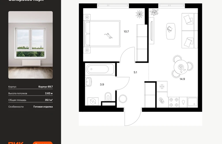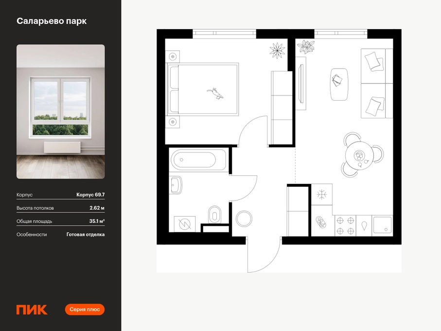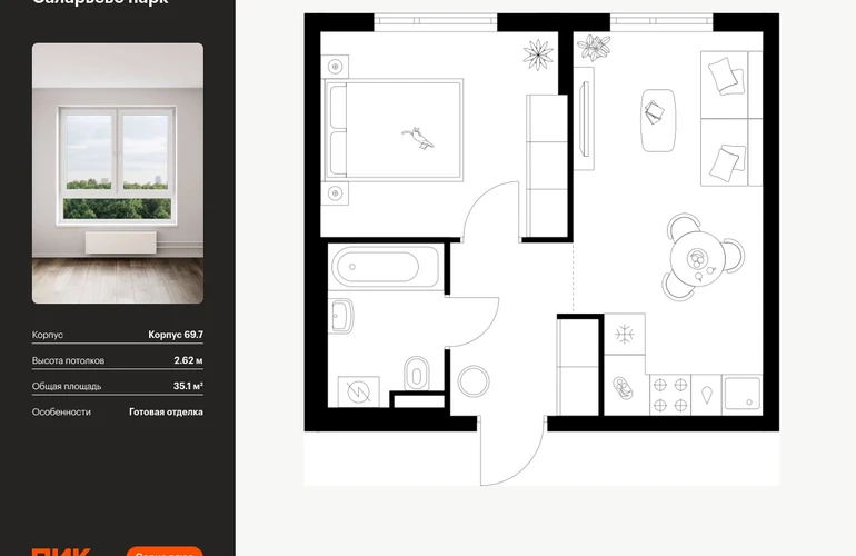 Продаётся 1-комн.квартира площадью 35.10 кв.м на 13 этаже 14 этажного дома (Корпус 69.7, секция 7) проекта ПИК Саларьево парк. Светлый просторный подъезд на уровне земли, функциональная планировка, большие окна, с отделкой. Жилой район «Саларьево парк» расположен в Новой Москве, в четырёх километрах от МКАД по Киевскому шоссе. Две станции метро: «Саларьево» и «Филатов луг» — находятся в пешей доступности от проекта. Дойти до них можно за 5–10 минут. В квартале уже создана качественная среда, где есть абсолютно всё для полноценной жизни, работы и отдыха. «Саларьево парк» — не просто квартал, а полноценный жилой район, который отличается разноплановой архитектурой. Над концепцией квартала работали несколько ведущих архитектурных бюро, которые стремились добиться разнообразия в фасадных решениях. Ярким примером такого подхода станет корпус 83, который относится к «Серии плюс». Новый корпус 83 был создан по принципам южной архитектуры: расслабленный и лаконичный силуэт зданий, привлекающий к себе внимание. Архитектурная изюминка 83-го корпуса — террасы и фигурные балконы. Вместе с окнами и другими акцентными элементами они создают уникальный облик здания, отсылая нас к изысканной южной архитектуре. Все корпуса в квартале гармонично сочетаются, образуя единую городскую среду. Здесь приятно гулять и проводить время на улице всей семьёй. В «Саларьево парке» создана уникальная образовательная среда, включающая в себя шесть школ, рассчитанных на 6 250 учеников. Две из них уже открыты, их посещает 2 300 детей. Также на территории «Саларьево парка» находится 12 детских садов, один из которых с бассейном. Сейчас уже открыты 7 садов. В «Саларьево парке» открыта уникальная игровая площадка — PlayHub «Оригами». Здесь есть ручей, горка-труба и рельефные холмы. Взрослые смогут отдохнуть в уютном кафе, пока дети играют. Также на территории проекта есть SportHub — большая спортивная зона, разделённая по интересам и возрастам. Здесь можно заниматься разными видами спорта: футболом, баскетболом, волейболом и стритболом. Зимой центральную часть площадки превращают в каток. Во дворах-парках жилого квартала есть места для отдыха, детские и спортивные площадки. На первых этажах домов расположены магазины, кафе и полезные сервисы. Также вблизи проекта есть несколько масштабных торговых центров. До ТЦ «Саларис» пять минут пешком, до «Рио», Metro Cash & Carry и «Лемана про» — пять минут на автомобиле. Артикул - 1024226О застройщике