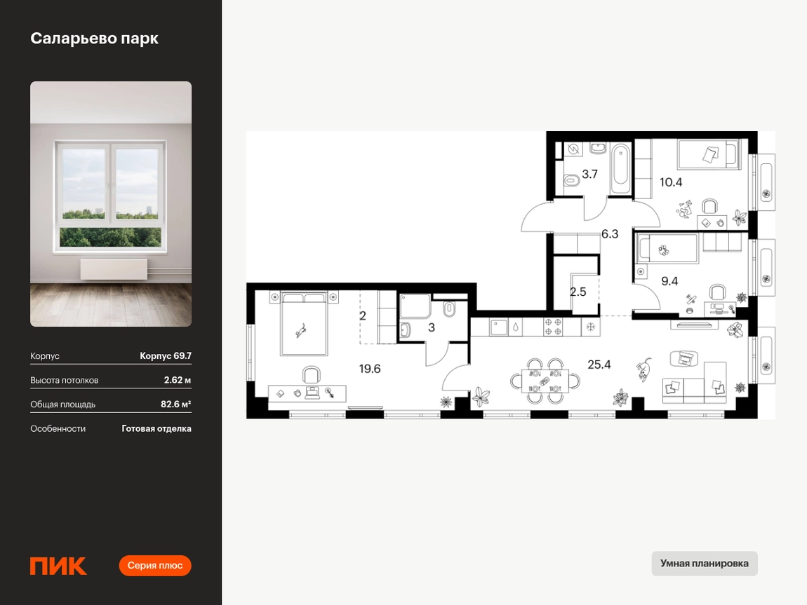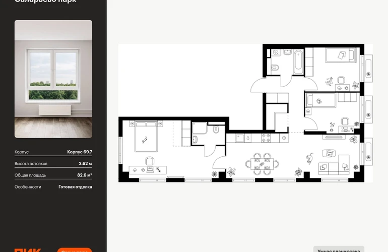 Продаётся 3-комн.квартира площадью 82.60 кв.м на 4 этаже 14 этажного дома (Корпус 69.7, секция 7) проекта ПИК Саларьево парк. Светлый просторный подъезд на уровне земли, функциональная планировка, большие окна, с отделкой. Жилой район «Саларьево парк» расположен в Новой Москве, в четырёх километрах от МКАД по Киевскому шоссе. Две станции метро: «Саларьево» и «Филатов луг», — находятся в пешей доступности от проекта. Дойти до них можно за 5–10 минут. В квартале уже создана качественная среда, где есть абсолютно всё для полноценной жизни, работы и отдыха. «Саларьево парк» — не просто квартал, а полноценный жилой район, который отличается разноплановой архитектурой. Над концепцией квартала работали несколько ведущих архитектурных бюро, которые стремились добиться разнообразия в фасадных решениях. Ярким примером такого подхода станут корпуса 82 и 83, которые относятся к «Серии плюс». Новый корпус 83 был создан по принципам южной архитектуры: расслабленный и лаконичный силуэт зданий, привлекающий к себе внимание. Архитектурная изюминка 83-го корпуса — террасы и фигурные балконы. Вместе с окнами и другими акцентными элементами они создают уникальный облик здания, отсылая нас к изысканной южной архитектуре. Все корпуса в квартале гармонично сочетаются, образуя единую городскую среду. Здесь приятно гулять и проводить время на улице всей семьёй. В «Саларьево парке» создана уникальная образовательная среда, включающая в себя шесть школ, рассчитанных на 6 250 учеников. Четыре из них уже открыты, их посещает 2 300 детей. Также на территории «Саларьево парка» находится 12 детских садов, один из которых с бассейном. Сейчас уже открыты 8 садов. В «Саларьево парке» открыта уникальная игровая площадка — PlayHub «Оригами». Здесь есть ручей, горка-труба и рельефные холмы. Взрослые смогут отдохнуть в уютном кафе, пока дети играют. Также на территории проекта есть SportHub — большая спортивная зона, разделённая по интересам и возрастам. Здесь можно заниматься разными видами спорта: футболом, баскетболом, волейболом и стритболом. Зимой центральную часть площадки превращают в каток. Во дворах-парках жилого квартала есть места для отдыха, детские и спортивные площадки. На первых этажах домов расположены магазины, кафе и полезные сервисы. Также вблизи проекта есть несколько масштабных торговых центров. До ТЦ «Саларис» пять минут пешком, до «Рио», Metro Cash & Carry и «Леруа Мерлен» — пять минут на автомобиле. Артикул - 1024122О застройщике
