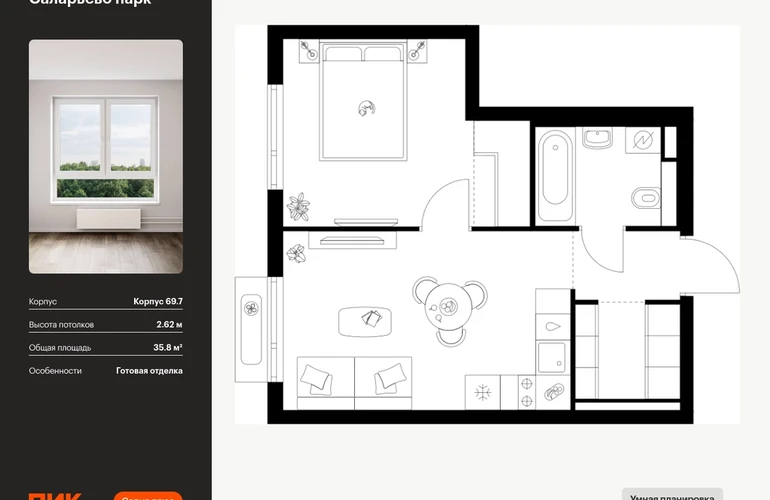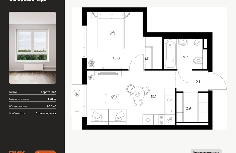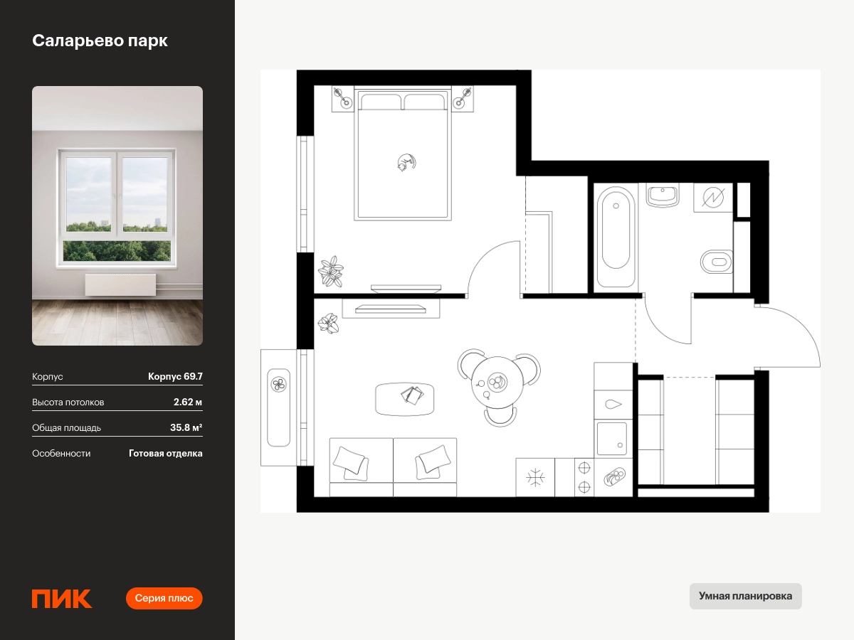 Продаётся 1-комн.квартира площадью 35.80 кв.м на 8 этаже 14 этажного дома (Корпус 69.7, секция 7) проекта ПИК Саларьево парк. Светлый просторный подъезд на уровне земли, функциональная планировка, большие окна, с отделкой. Артикул - 1024172О застройщике